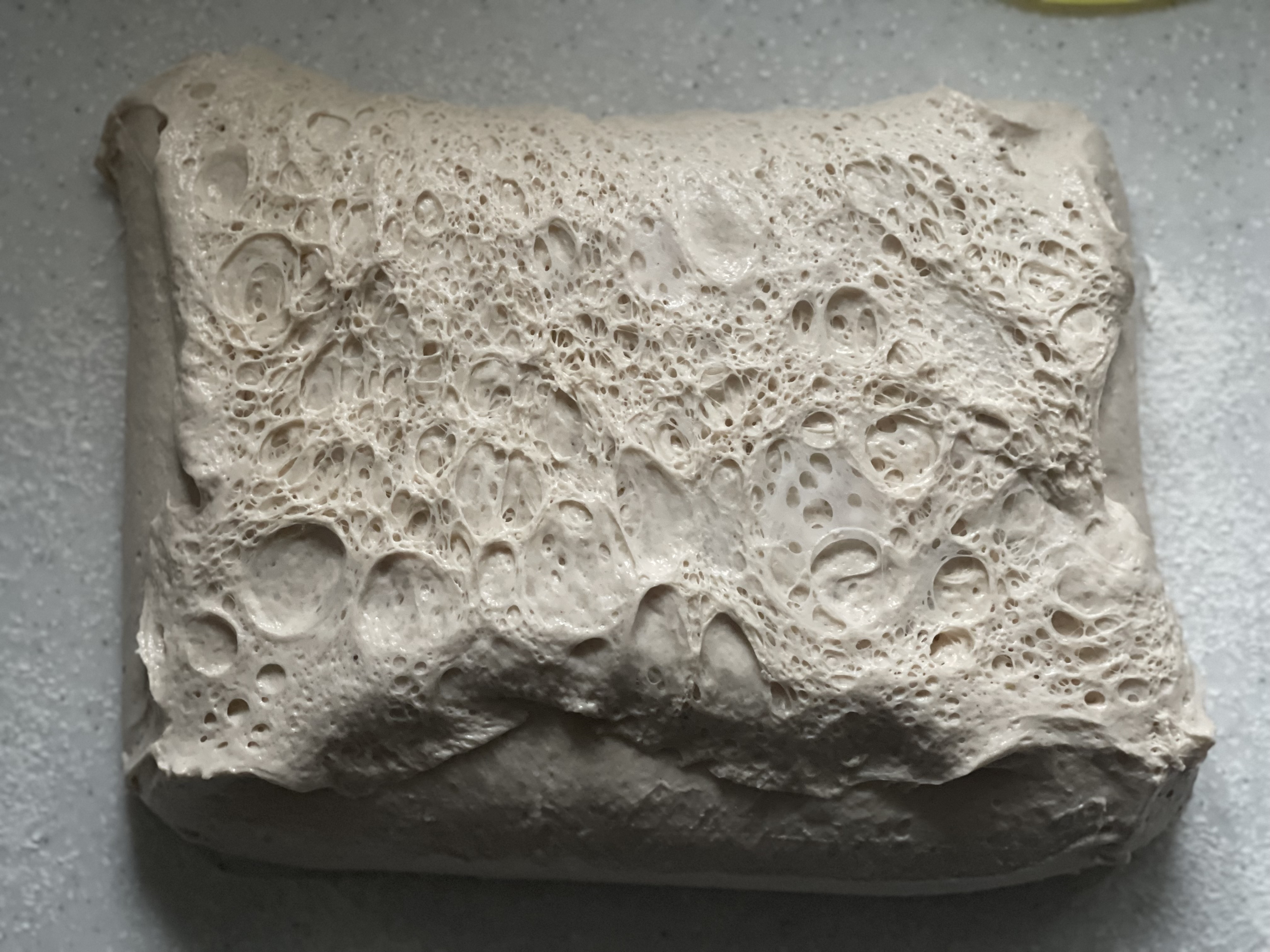 원래 레시피의 공정은 21도 기준, 오토리즈&폴딩을 30분 간격으로 4회를 진행한다. 이제는 실내 온도가 25도 이상으로 따뜻해져서 오토리즈&폴딩을 20분 간격으로 3회 진행했다. 믹싱은 냉장고에 넣어둔 차가운 물로 했고, 오토리즈와 폴딩을 반복하는 동안 반죽 온도는 22-23도를 유지했다. 오토리즈와 폴딩을 반복할수록 표면에 기포가 올라오고 틀에서 깔끔하게 떨어지는 것을 확인할 수 있었다.