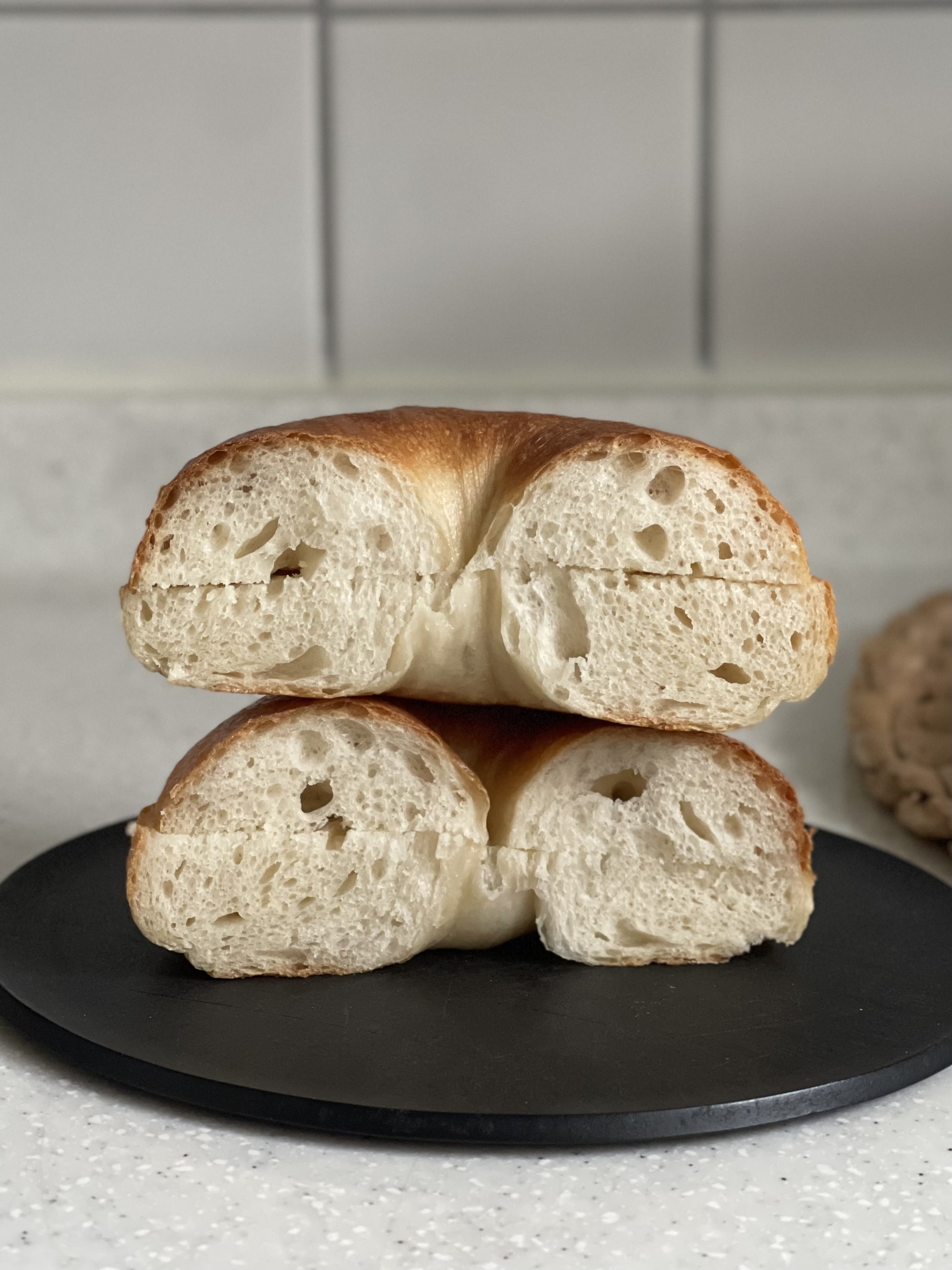 단면을 보면, 정통 베이글의 조밀한 크럼보다는 식빵처럼 폭신한 느낌이 든다. 1차 발효를 충분히 했기 때문이기도 하고, 무엇보다 탕종이 주는 수분감과 단맛이 더해져 씹을수록 은근한 단맛이 느껴졌다.