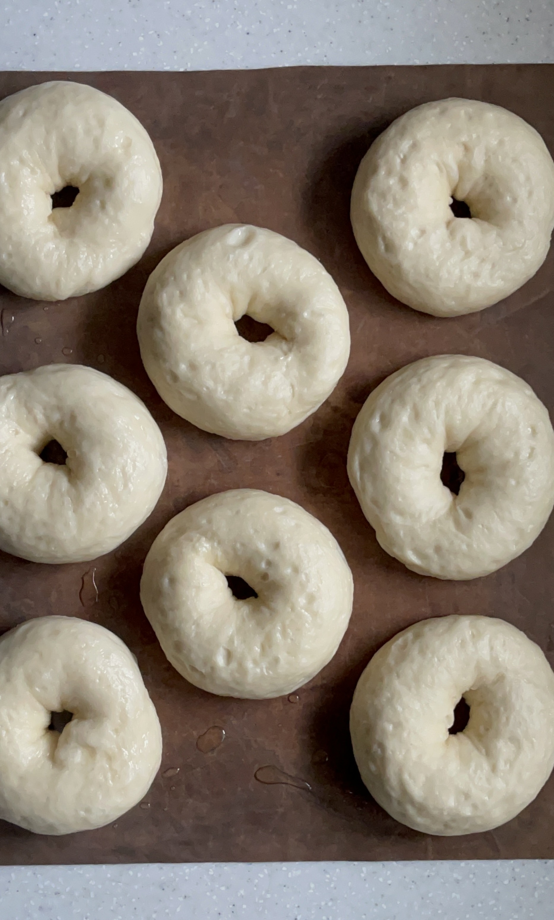 수분이 많은 탕종 덕분에 반죽이 찐득하고 성형이 까다로웠지만, 조심스럽게 성형을 마쳤다. 매끄럽게 마무리하지 못한 점이 아쉬웠지만, 탕종 반죽 특성상 어느 정도 감안해야 할 부분인 것 같다. 베이글 특유의 쫄깃함을 살리기 위해 2차 발효는 짧게 20분만 진행했고, 3-2-3 배열로 8개를 한 판에 빼곡히 팬닝했다.