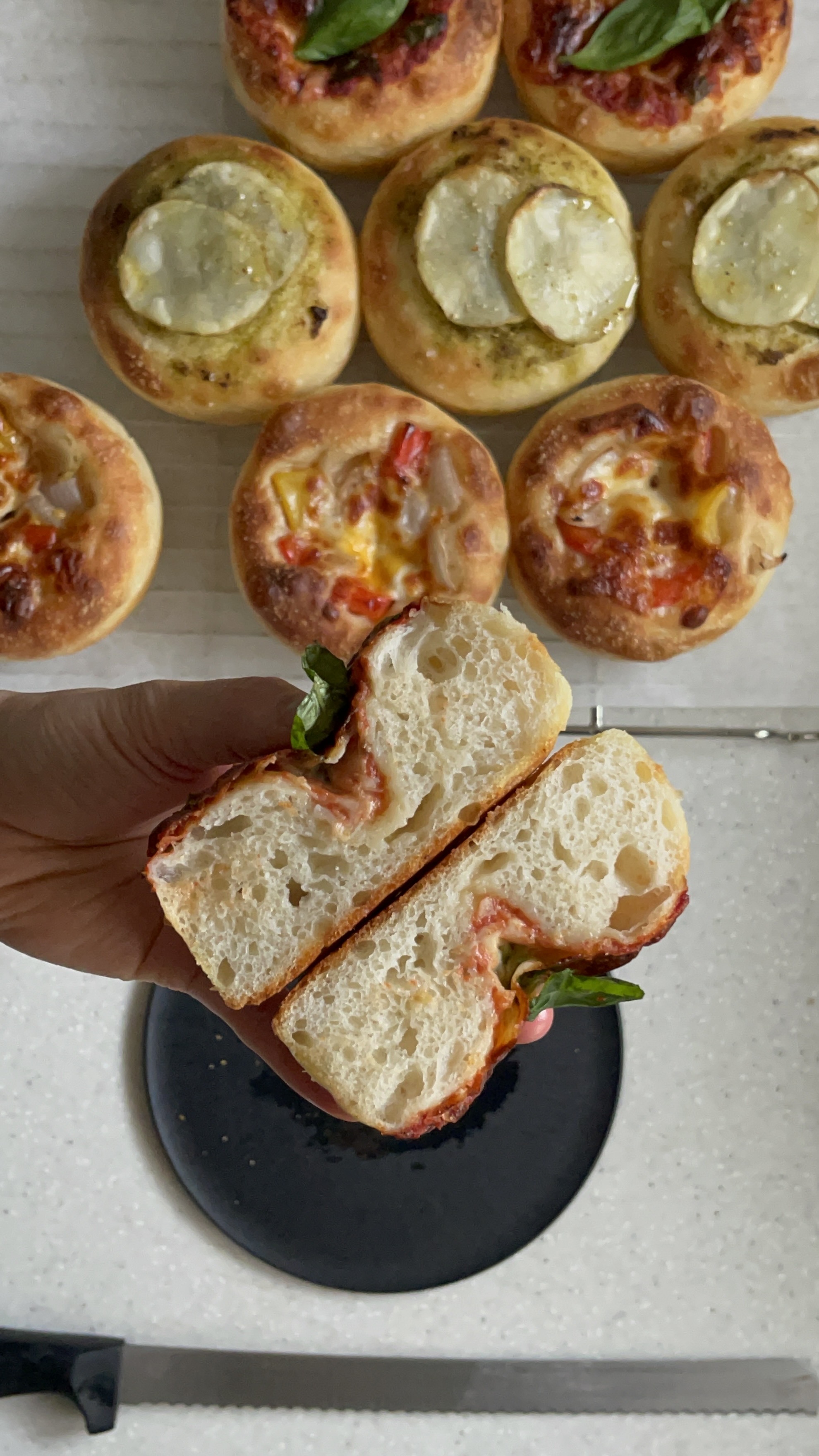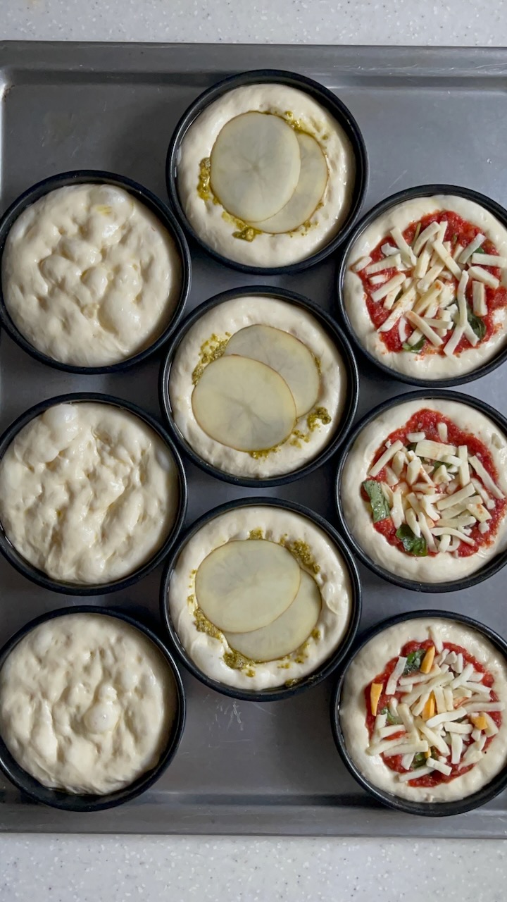 다음날 실온에 20분간 꺼내두었고, 수분율이 높은 포카치아 반죽이라 분할 후 둥글리기가 다소 까다로웠다. 하지만 토핑으로 가리면 되니까...! 나처럼 진 반죽 성형이 어려운 경우, 냉장고에서 바로 꺼내 분할하고 실온화와 벤치 타임을 동시에 진행하는 방법이 더 수월하겠다.