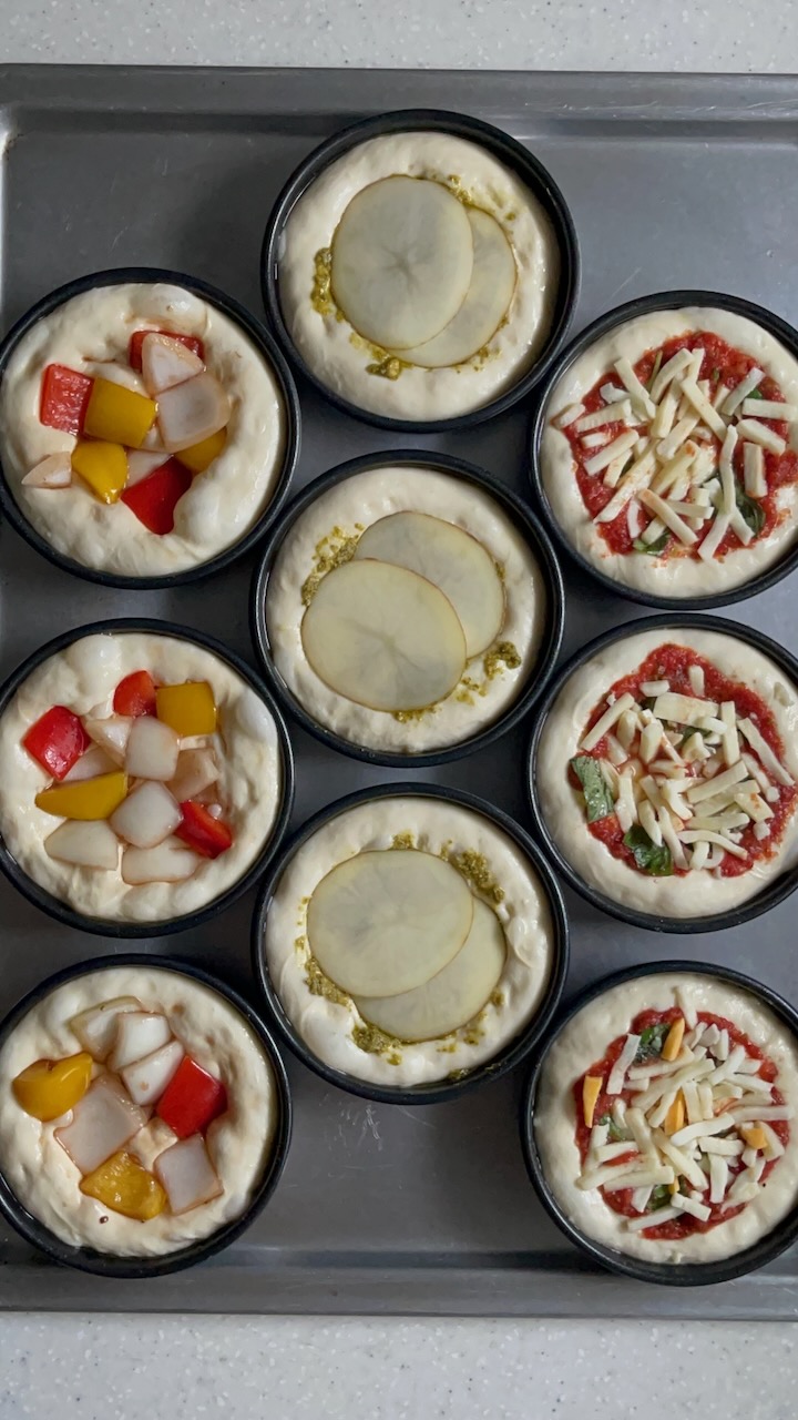 2차 발효는 총 1시간이며, 30분이 지나면 한 번 더 손가락으로 눌러준 뒤 준비한 토핑을 얹는다. 이후 30분간 더 발효했고, 반죽이 틀 높이보다 살짝 올라왔을 때 오븐에 넣었다.