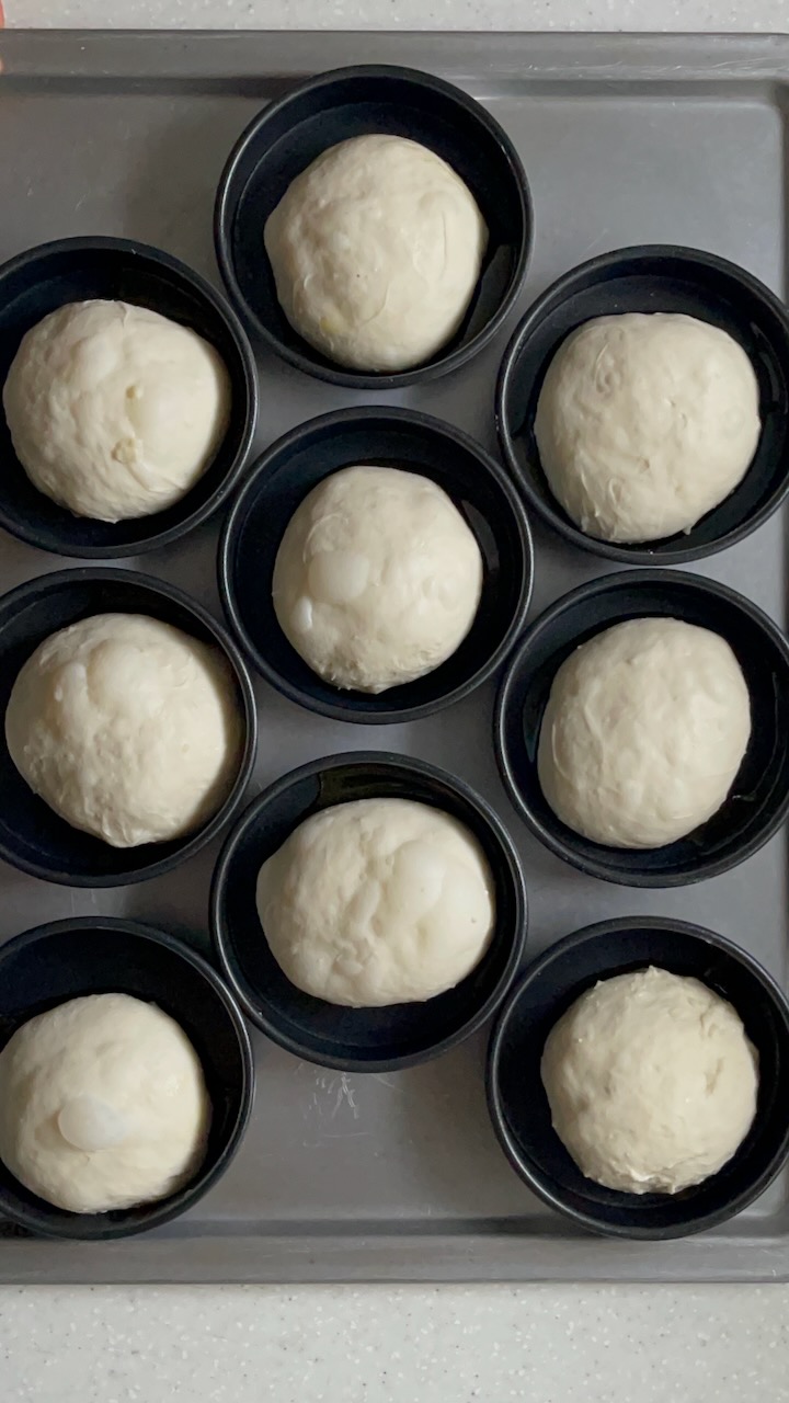 10cm 원형 팬에 올리브오일을 1큰술씩 두른 뒤, 둥글리기한 반죽을 팬닝하고 15분간 벤치 타임을 갖는다.