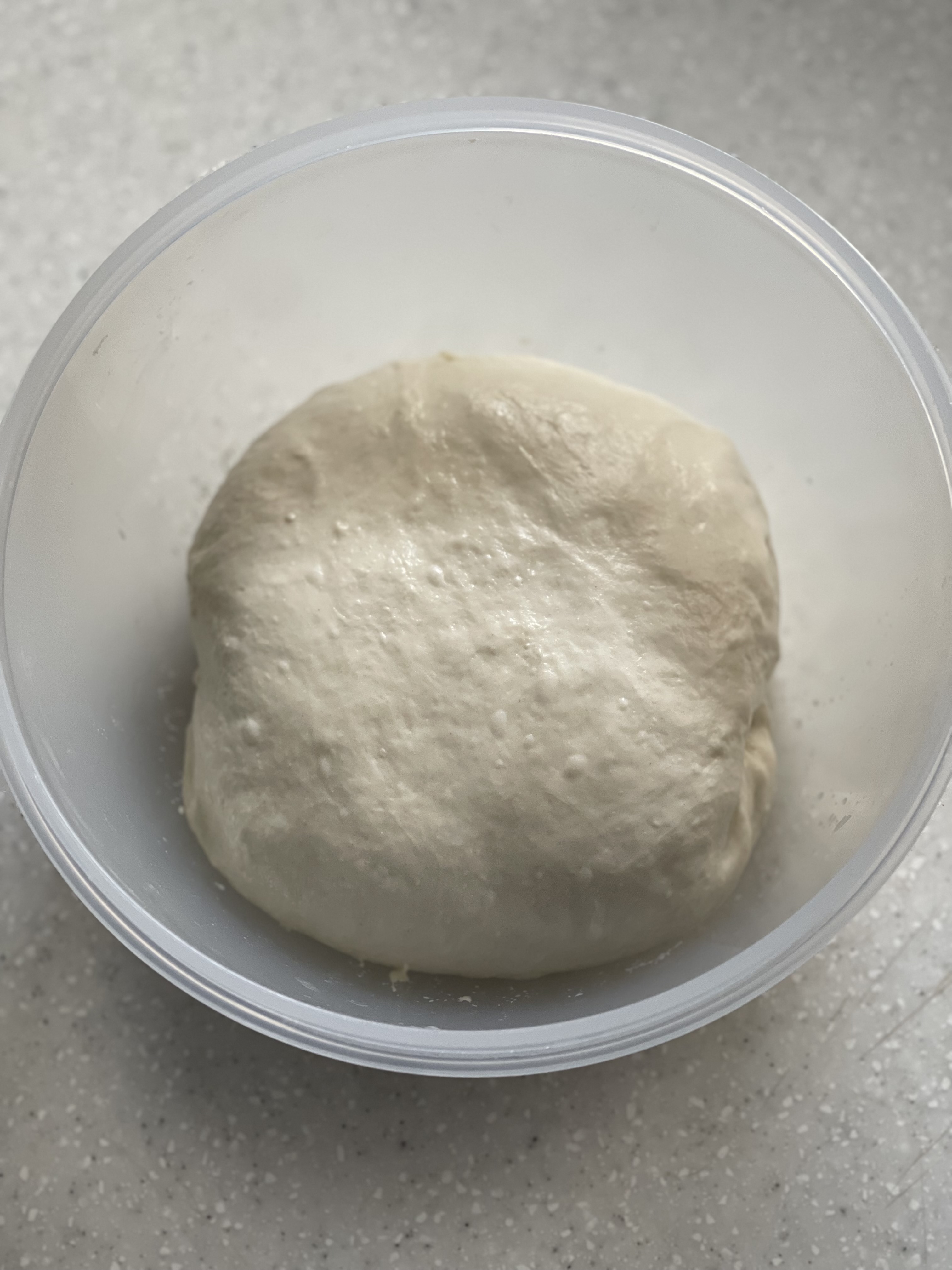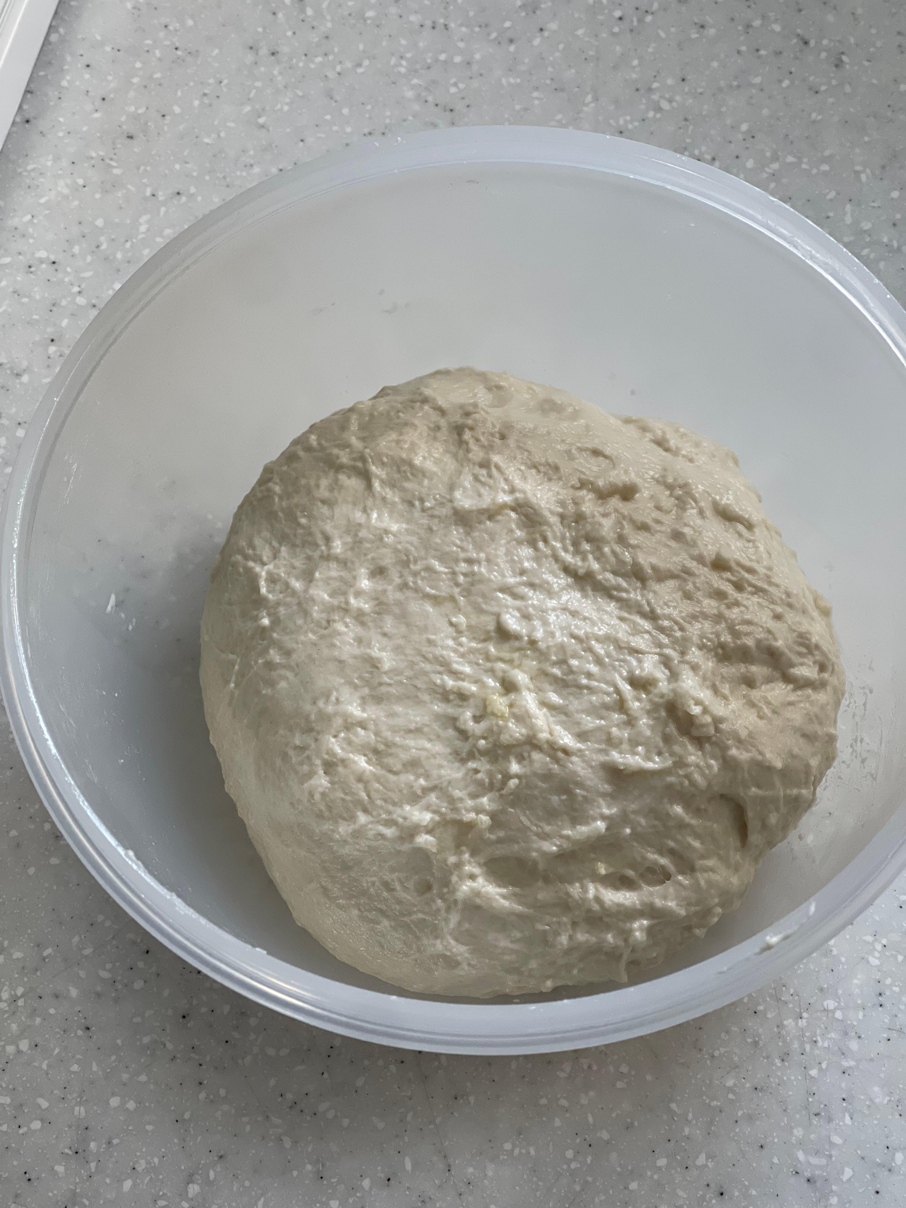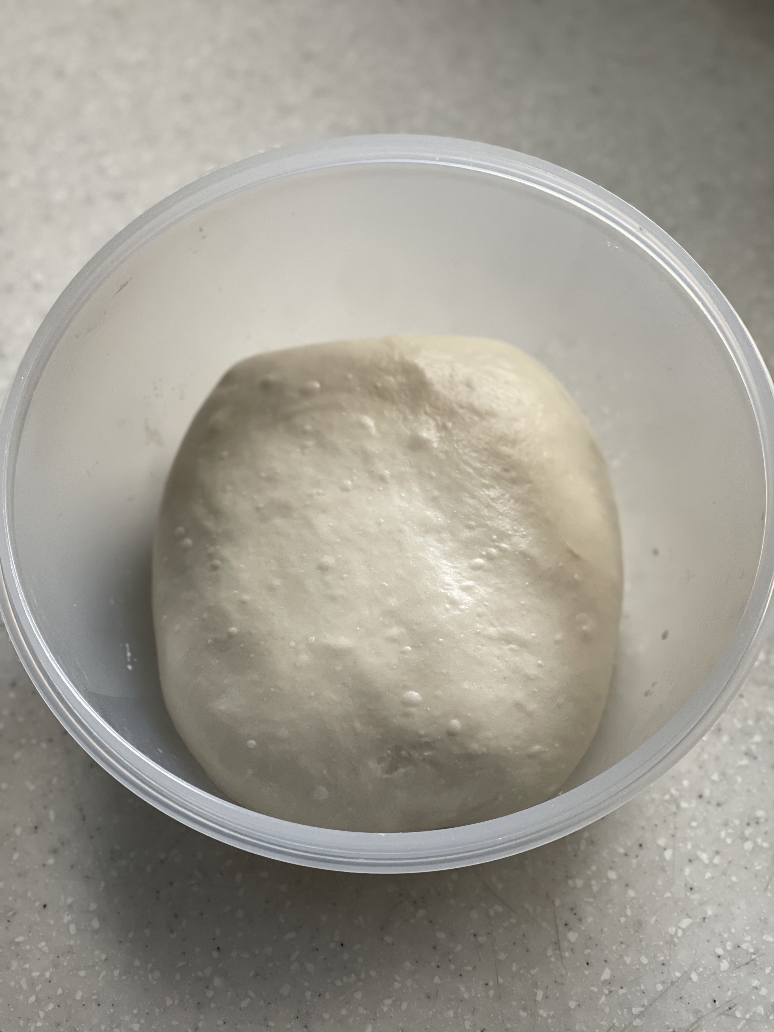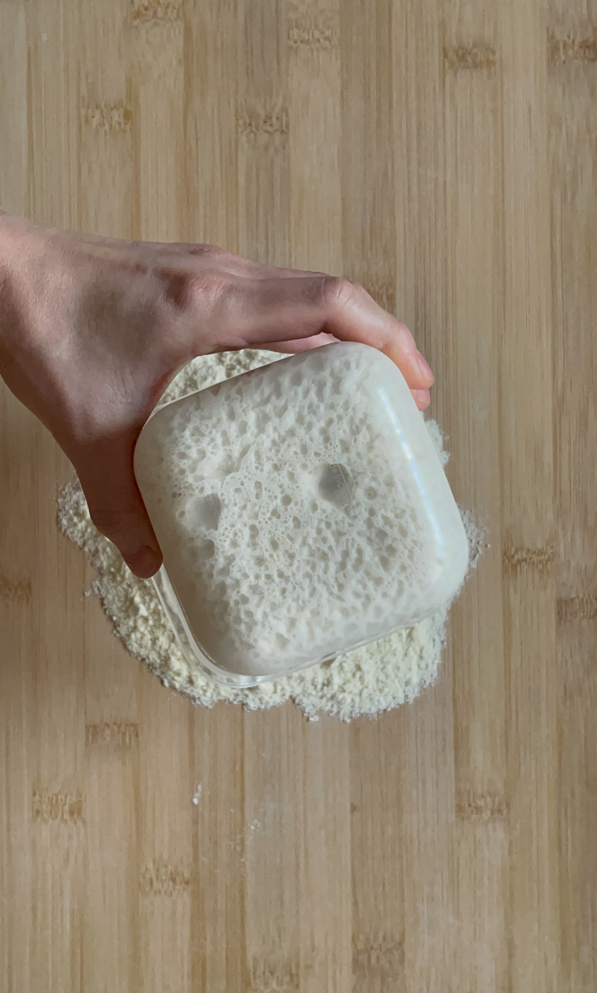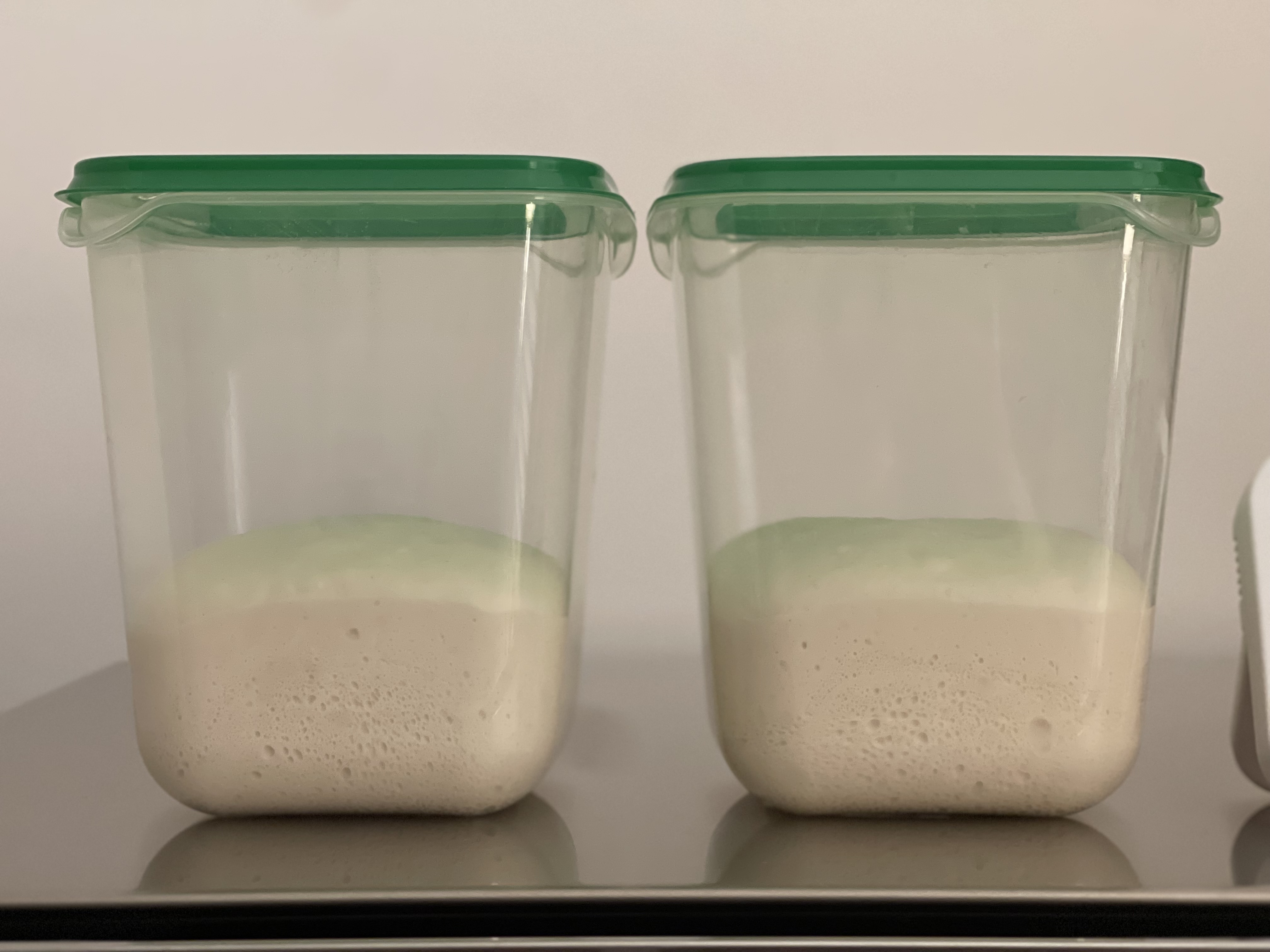 2개로 분할한 반죽은 이케아 푸르타 1L 용기에 옮겨 담고, 냉장 전에 실온에서 2시간 20분 동안 2배로 부풀 때까지 발효했다.