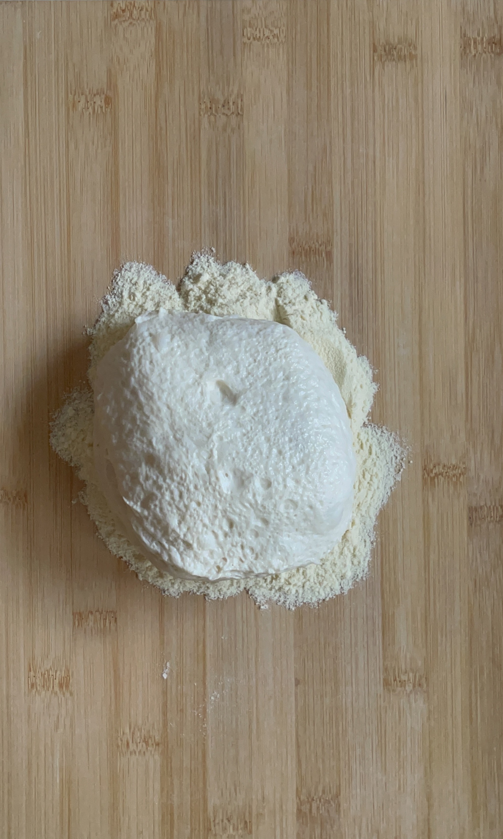 믹싱기 없이 오토리즈와 폴딩 4회를 통해 피자 도우에 필요한 글루텐을 만들었다.
