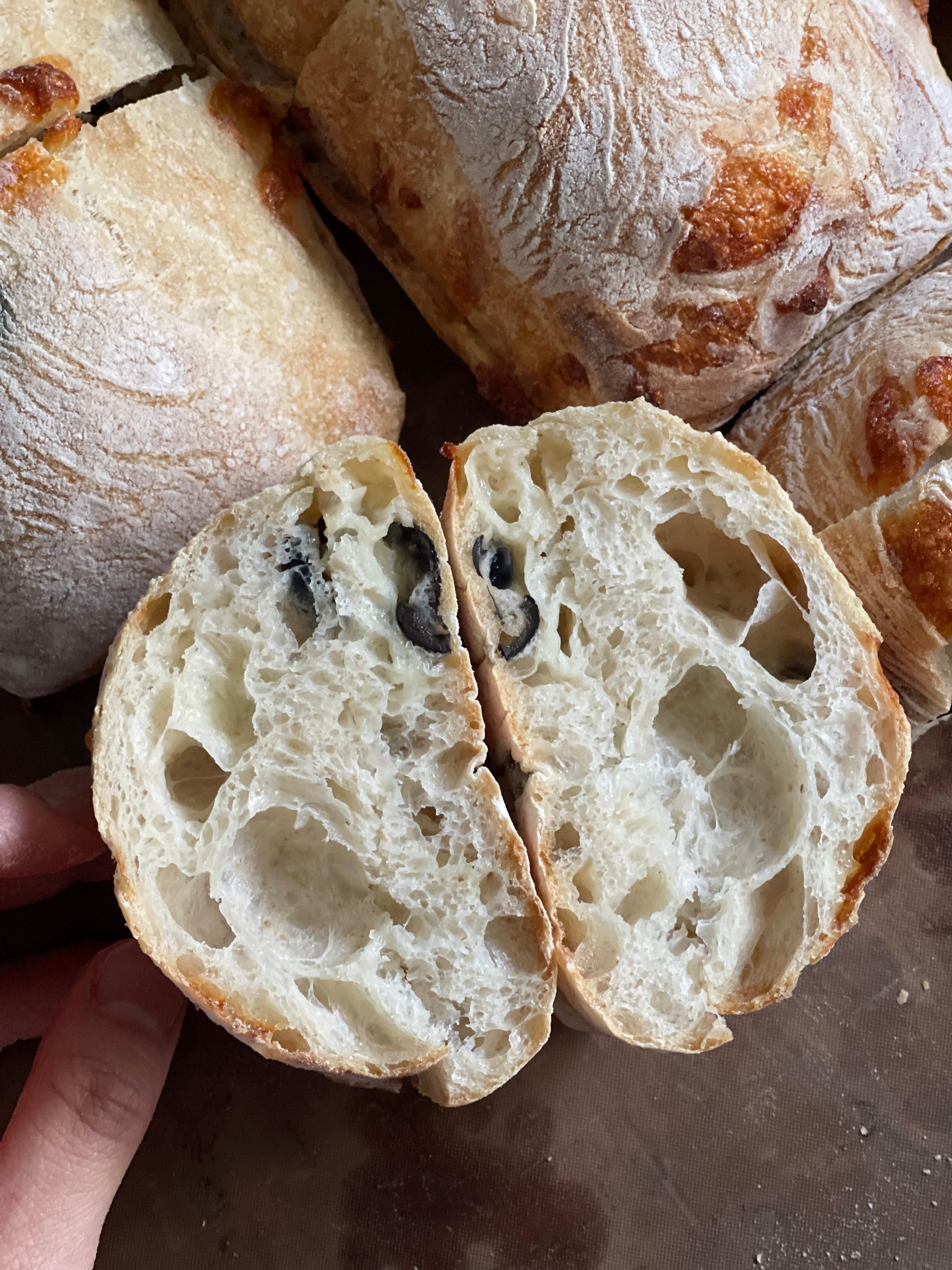 르방 치아바타 특유의 쫀득함과 산미는 없지만, 풀리쉬로도 높은 오븐스프링과 보존력 좋은 치아바타를 만들 수 있었다. 게다가 식감도 더 부드럽다. 요즘 SNS에서 올리브가 잔뜩 들어간 빵들을 보며 너무 먹고 싶었는데, 이번 치아바타 덕분에 올리브 병이 조금은 가신 것 같다!