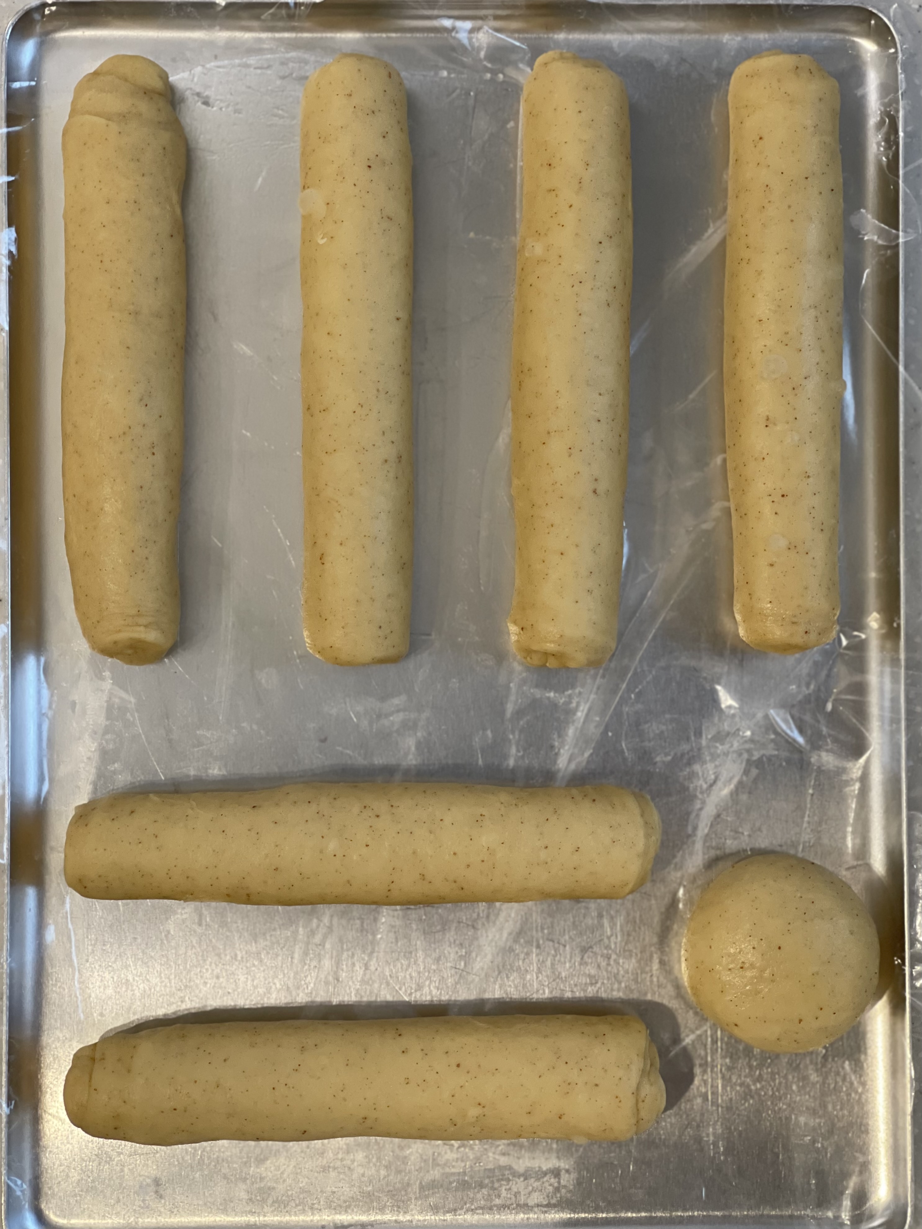 밀대로 밀어 가스를 빼준 뒤, 길다란 막대 모양으로 성형한다.