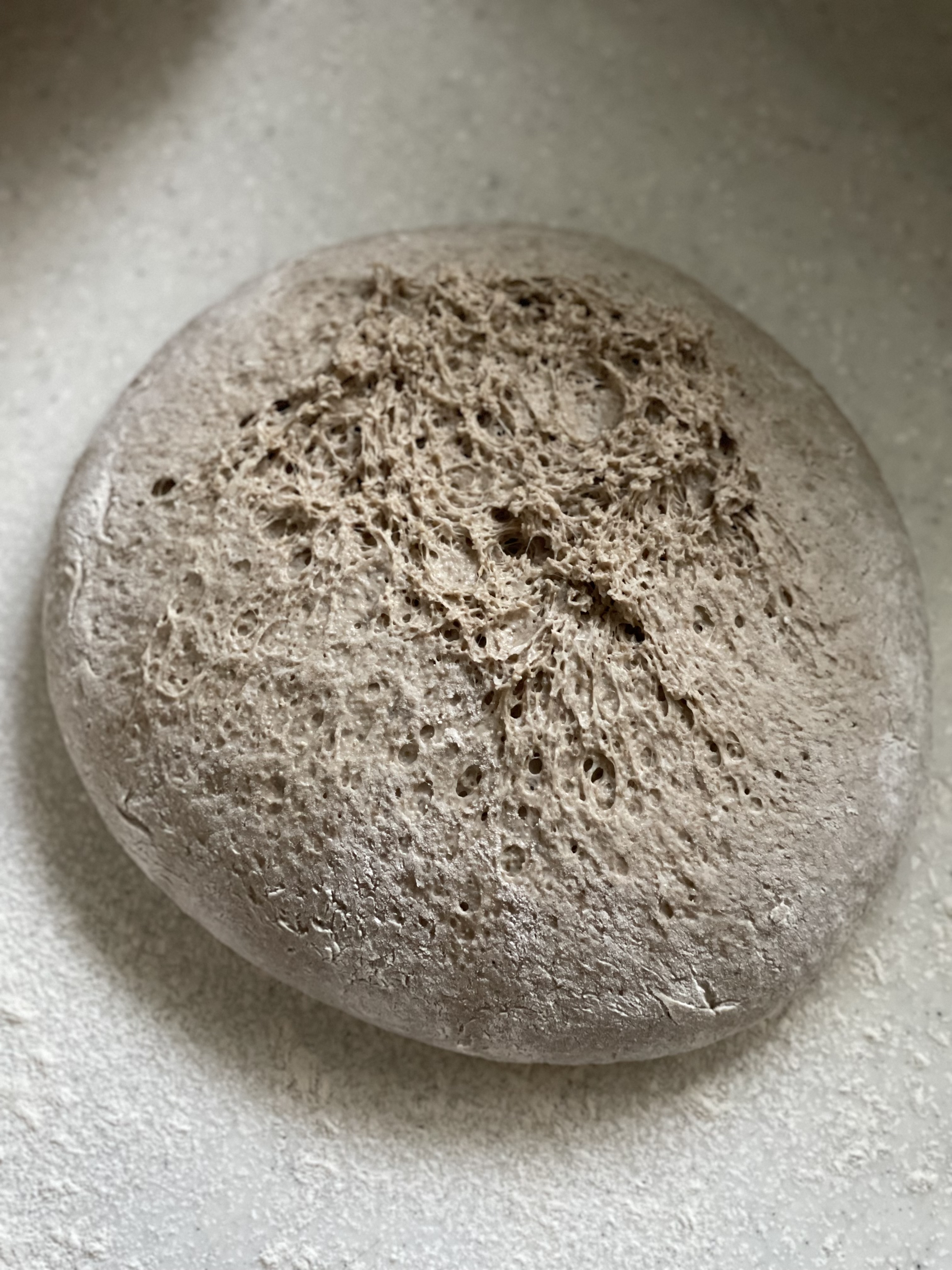 1차 발효가 끝난 반죽을 반느통에 옮겨 담고 실수로 눌러 정리했다. 호밀빵은 1차 발효에 생성된 가스를 최대한 건드리지 않아야 봉긋하게 구울 수 있다.