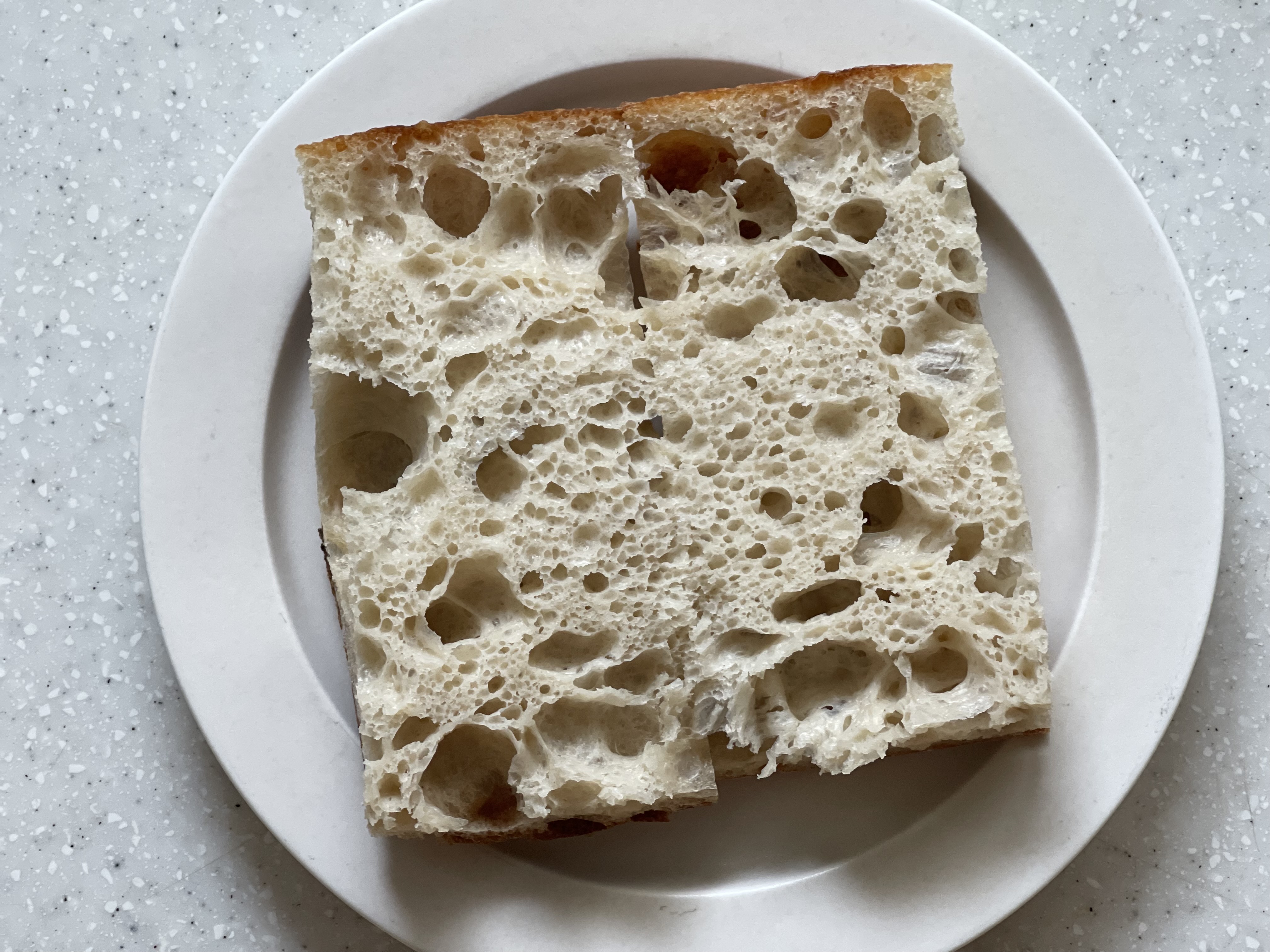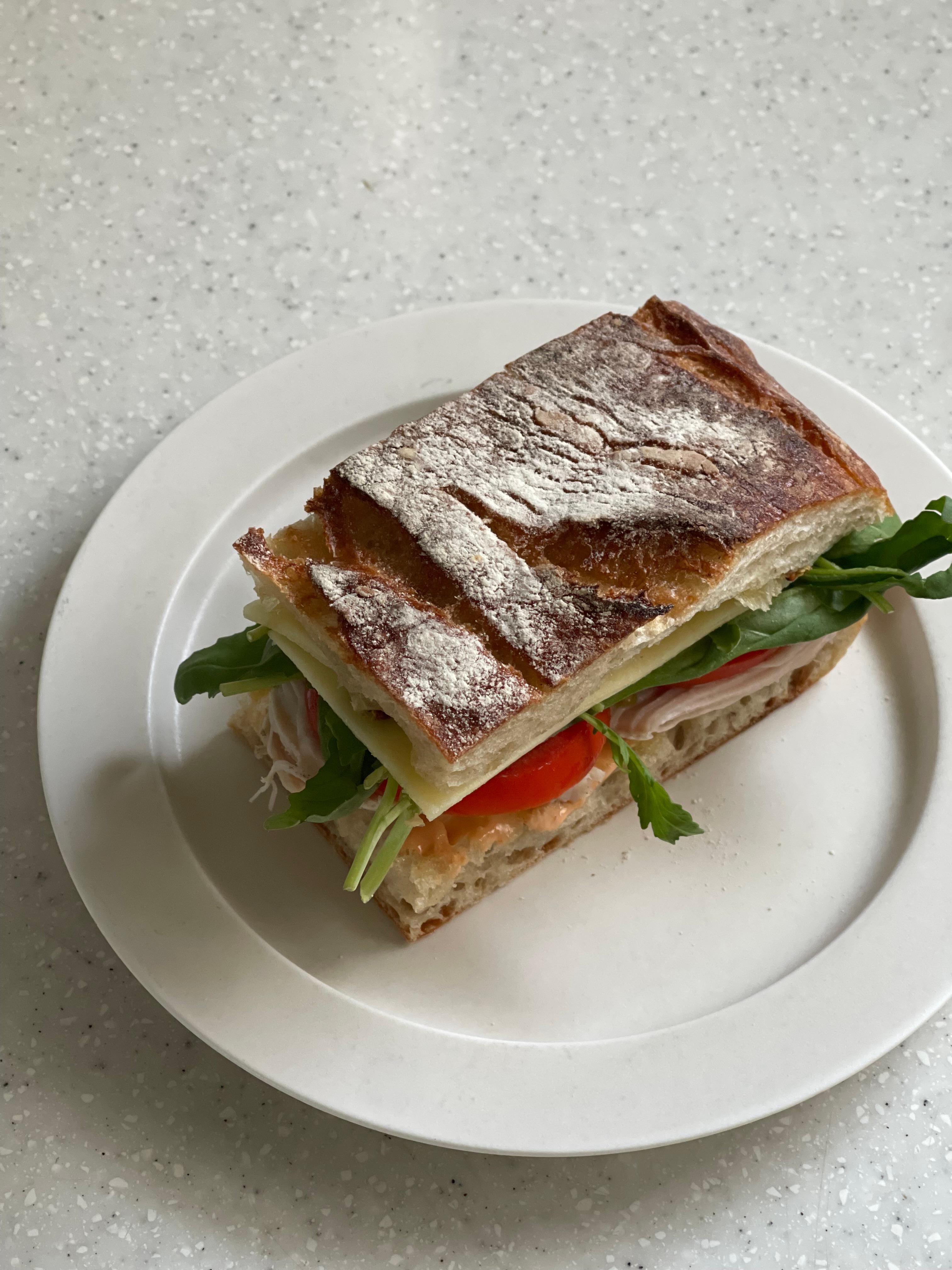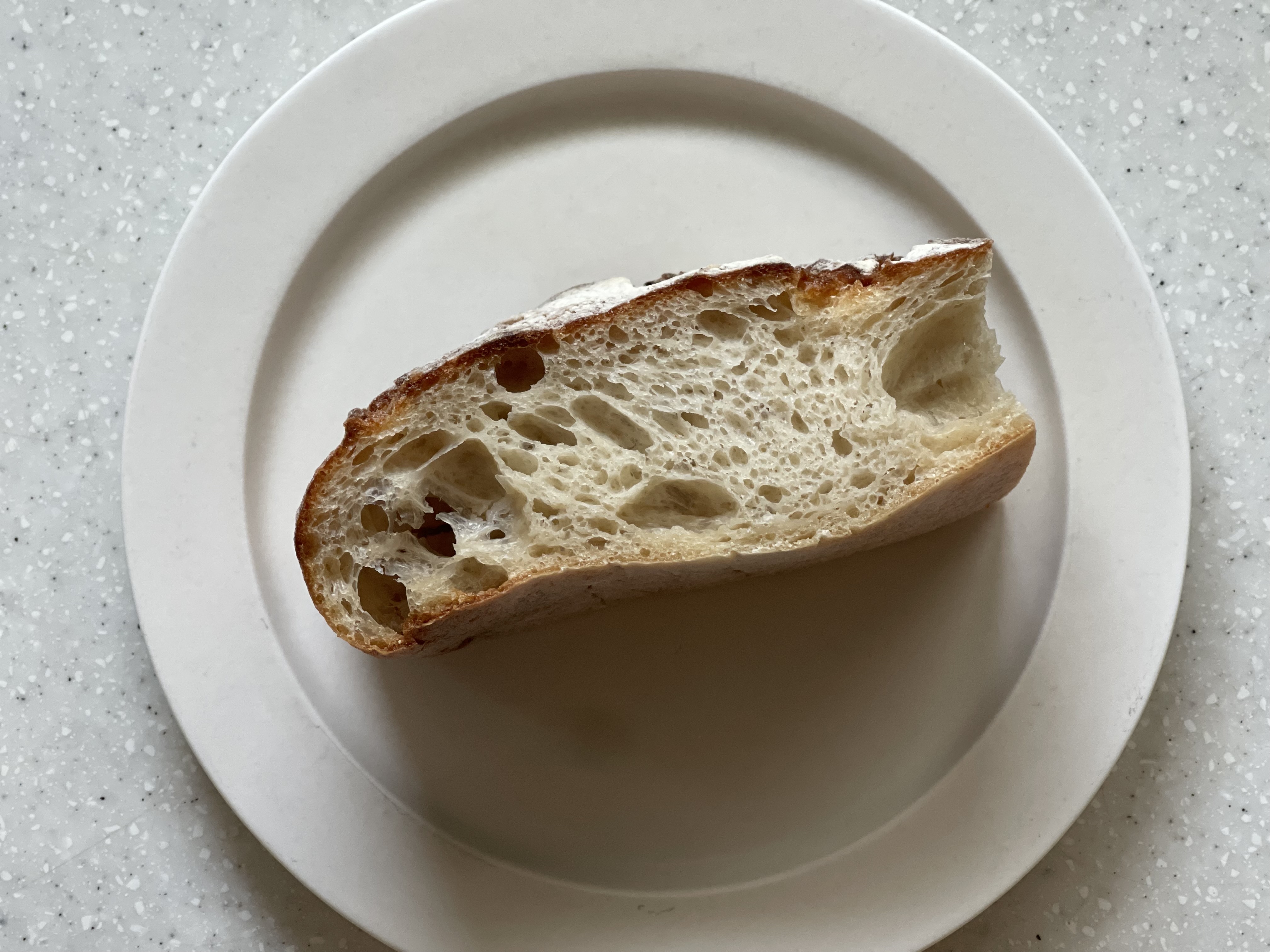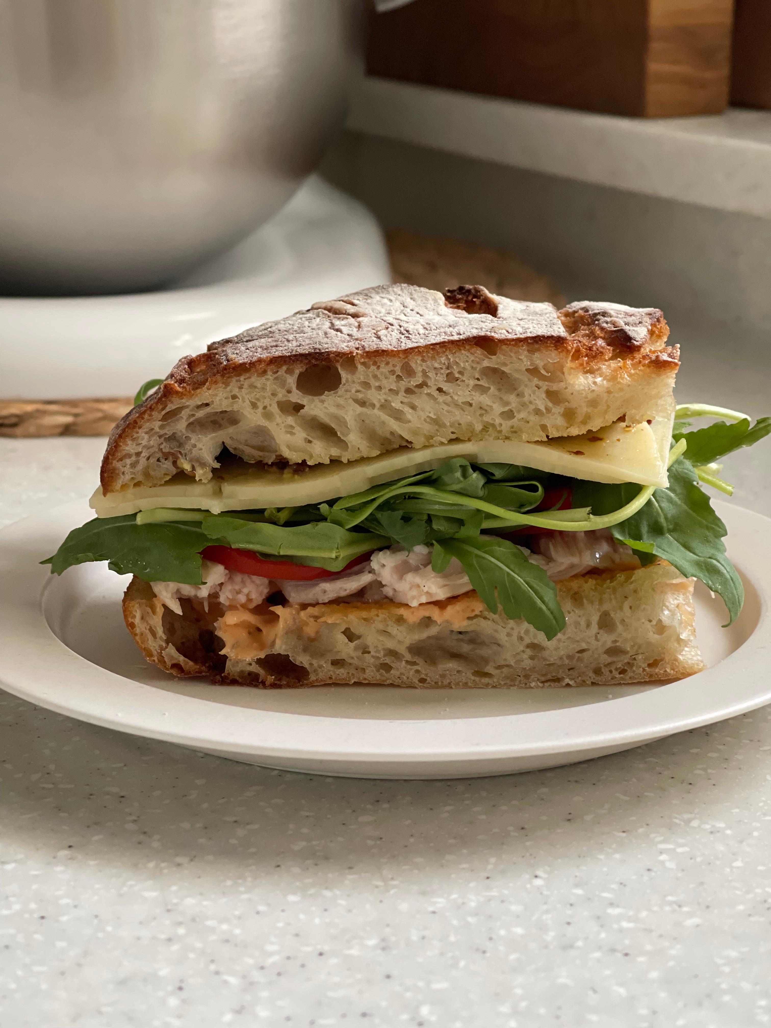에어프라이어에 크러스트가 위로 오도록 살짝 구운 뒤 샌드위치를 만들어 먹었는데, 신맛이 거의 없고 폭신한 식감이 샌드위치용으로 제격이었다.