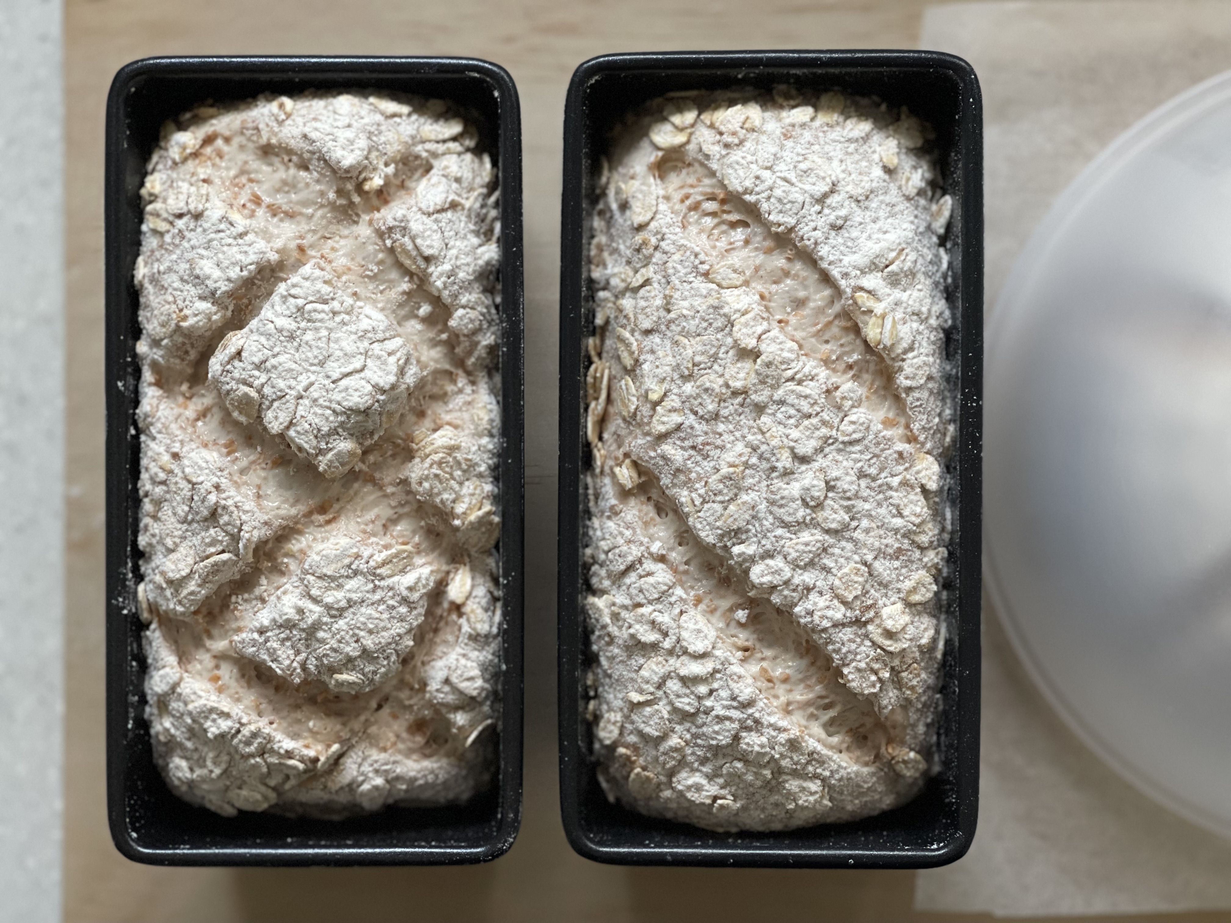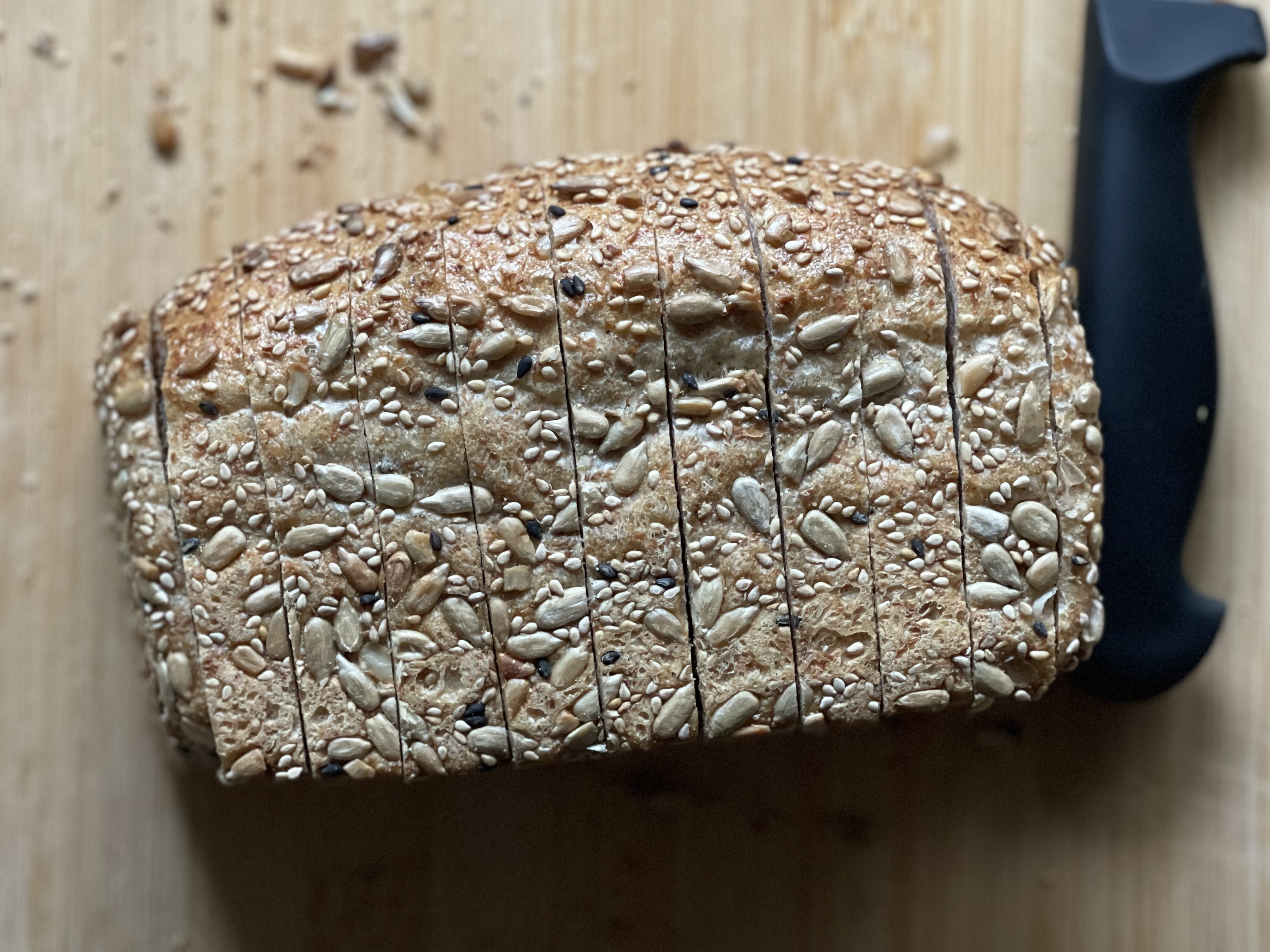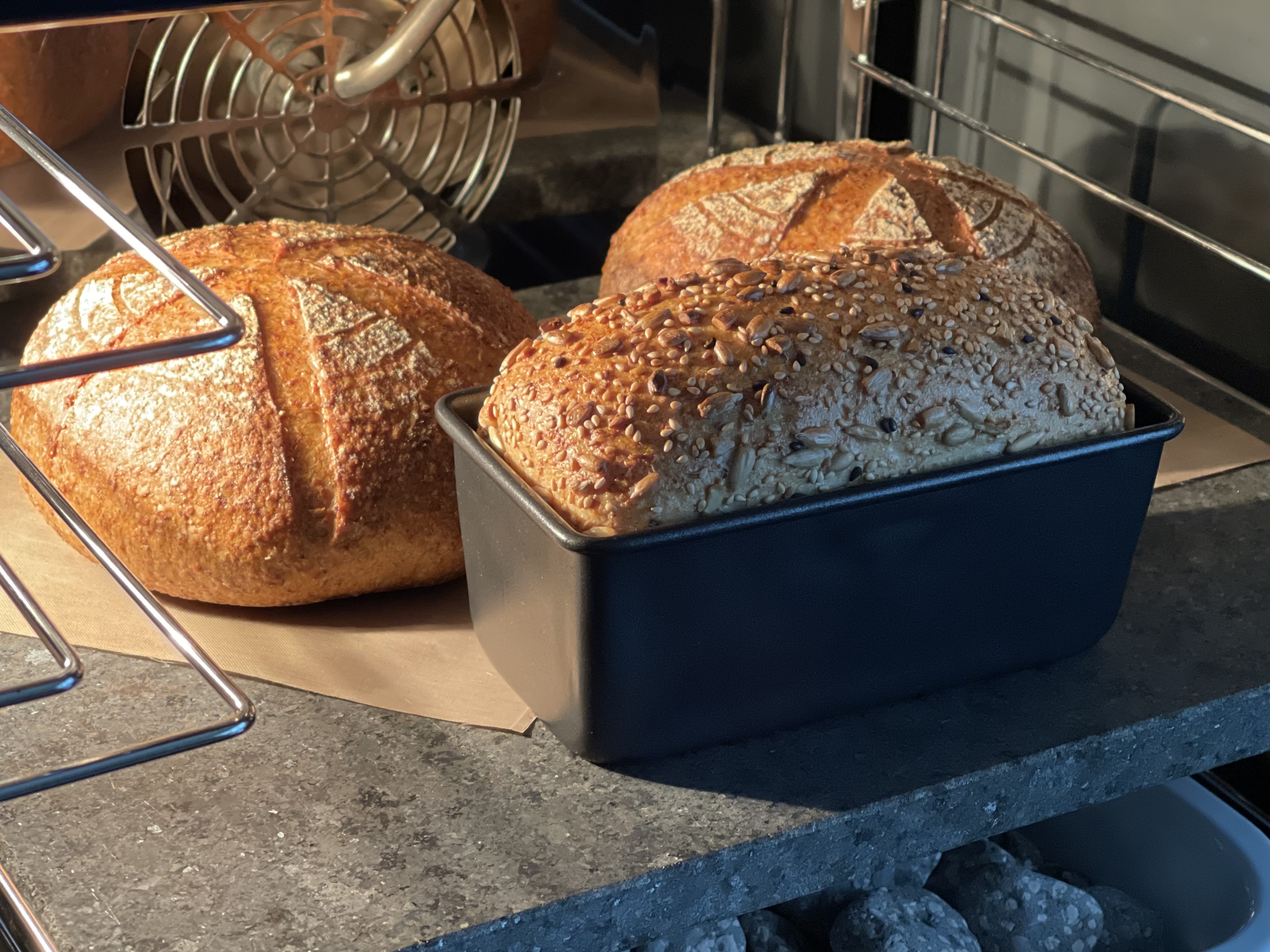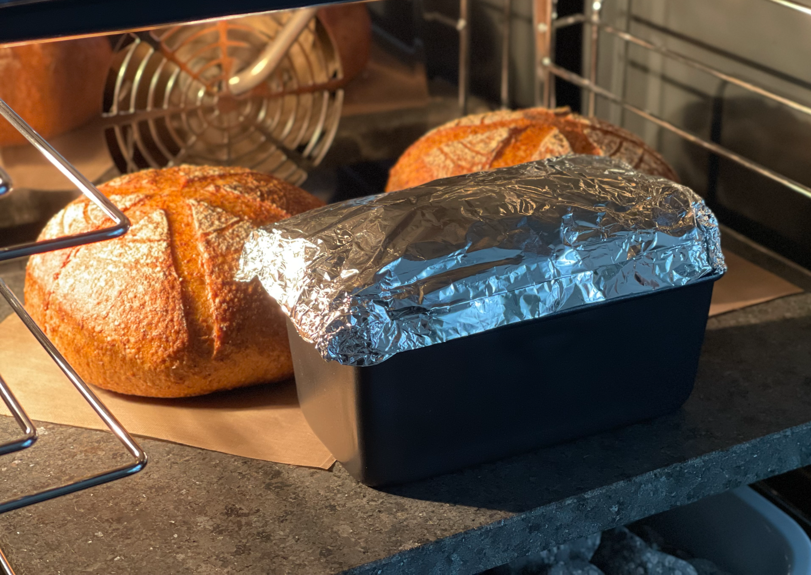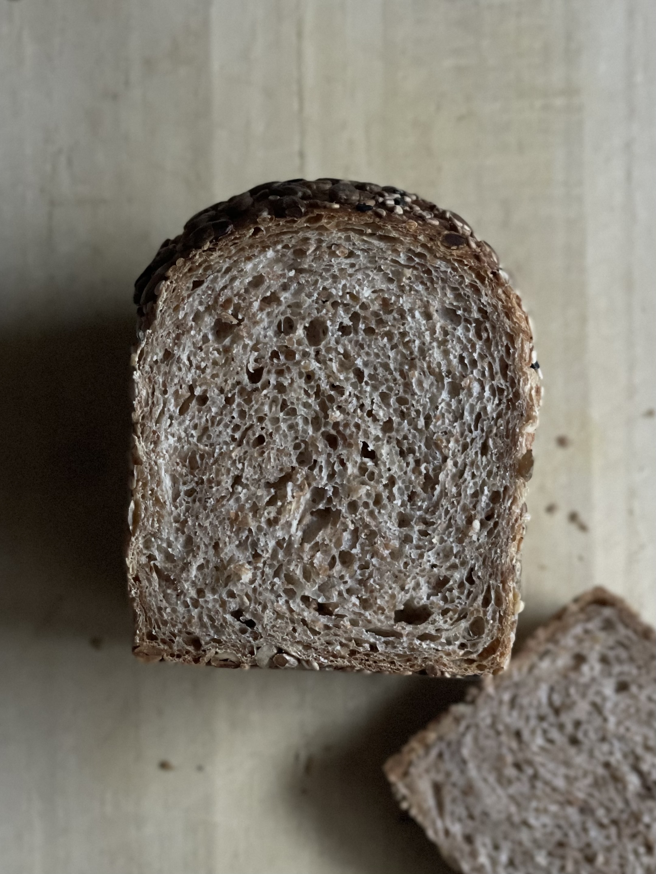반죽 온도와 믹싱, 발효 시간을 조정하며 세 번째 도전을 했다. 쿠프가 얕게 들어간 건 아쉽지만 볼륨은 확실히 개선되었다. 식빵 틀에 굽는 경우 씨앗이 타지 않도록 호일을 덮어 구웠는데, 먹음직스럽게 잘 나왔다.
