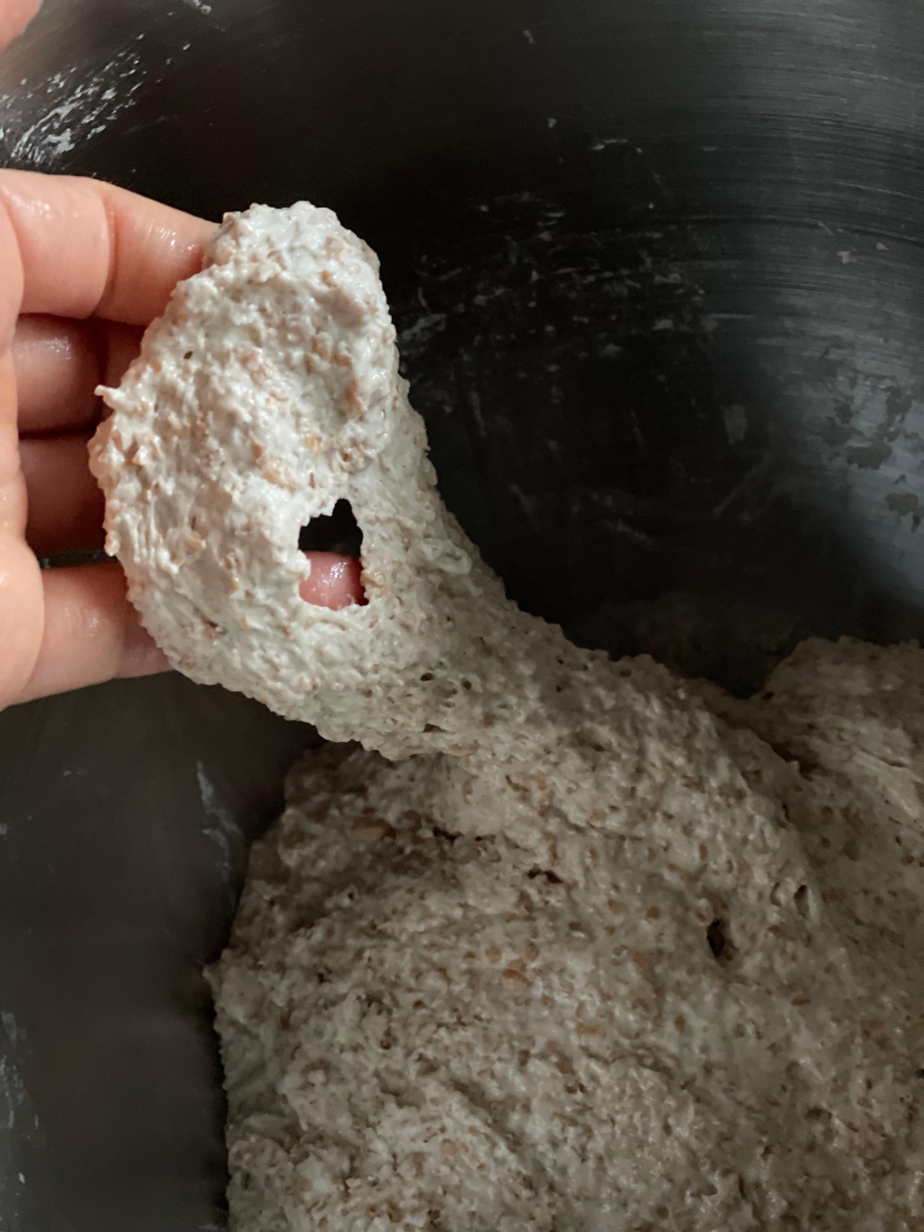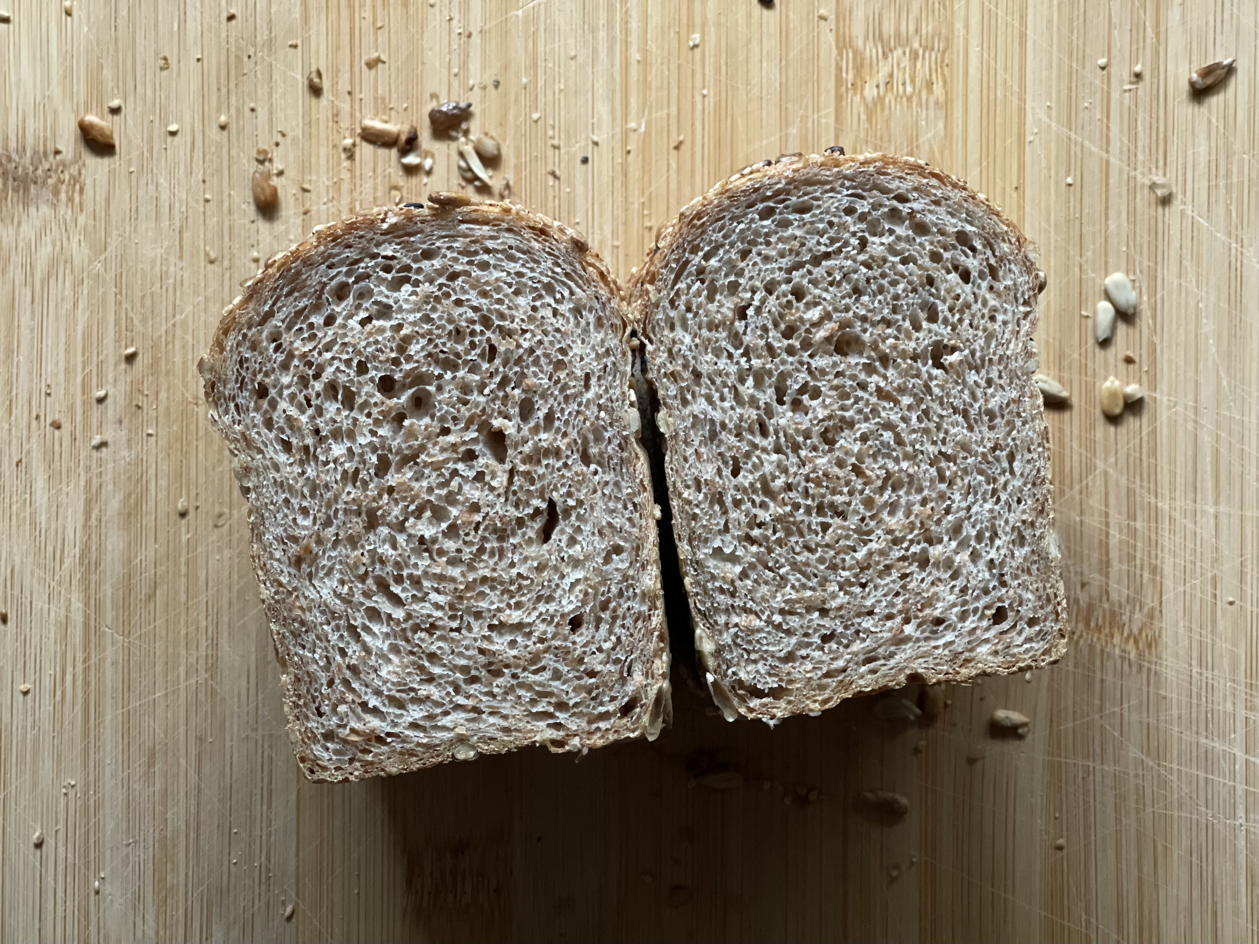 수분율은 낮았지만 오토리즈를 2시간 충분히 진행해 밀기울이 충분히 불었기에 퍽퍽하지 않고 오히려 촉촉하고 맛있었다.