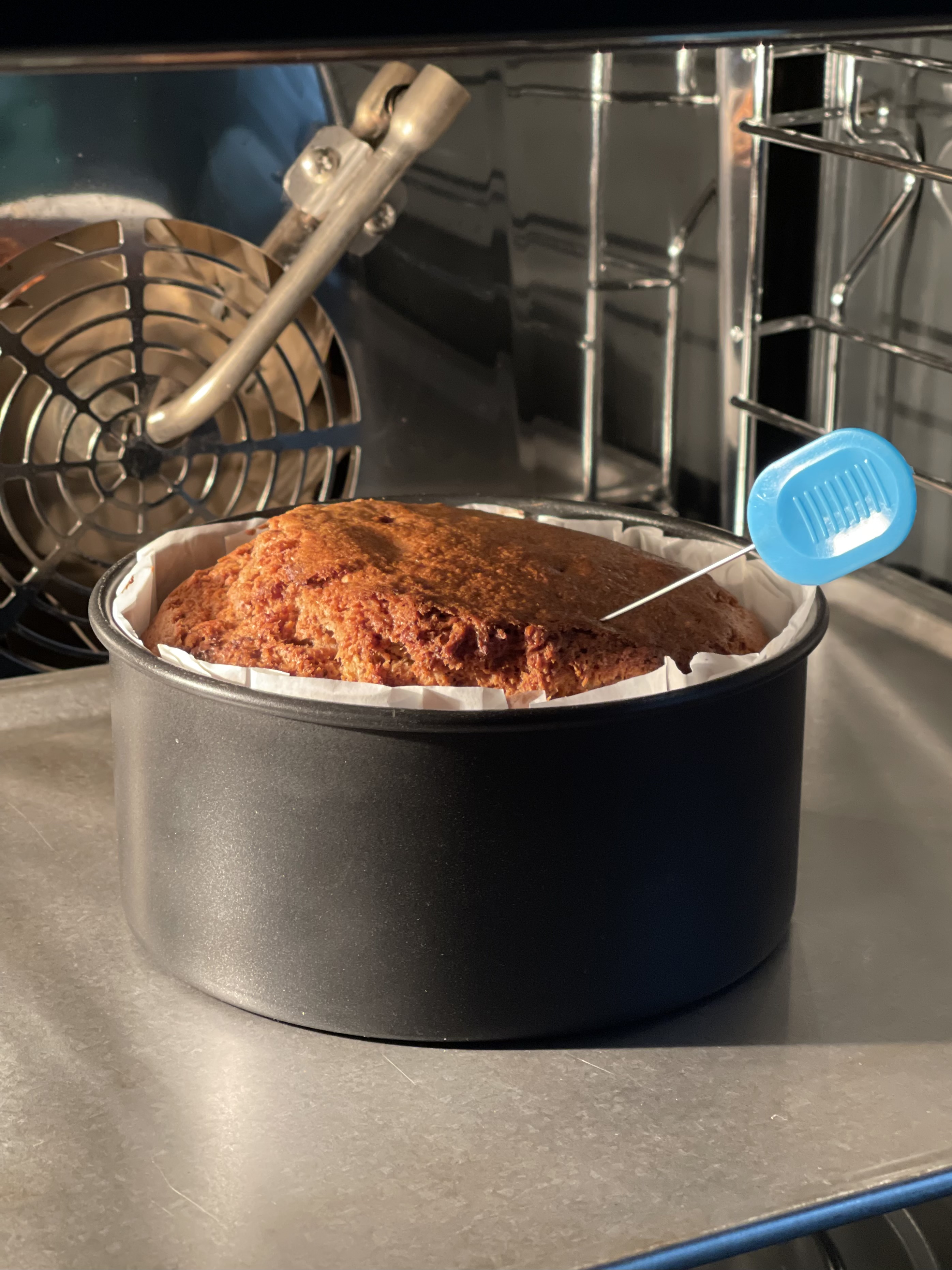 굽기는 180도 예열 후 컨벡션 모드 165도에서 25분, 이후 윗면이 타지 않도록 위에 팬 한개를 덮고 30분 더 구웠다. 총 55분간 구운 뒤 꼬치로 확인했을 때 반죽이 묻어나오지 않았다. 실온에서 한 시간 정도 식힌 뒤 랩핑해 냉장 숙성했다.