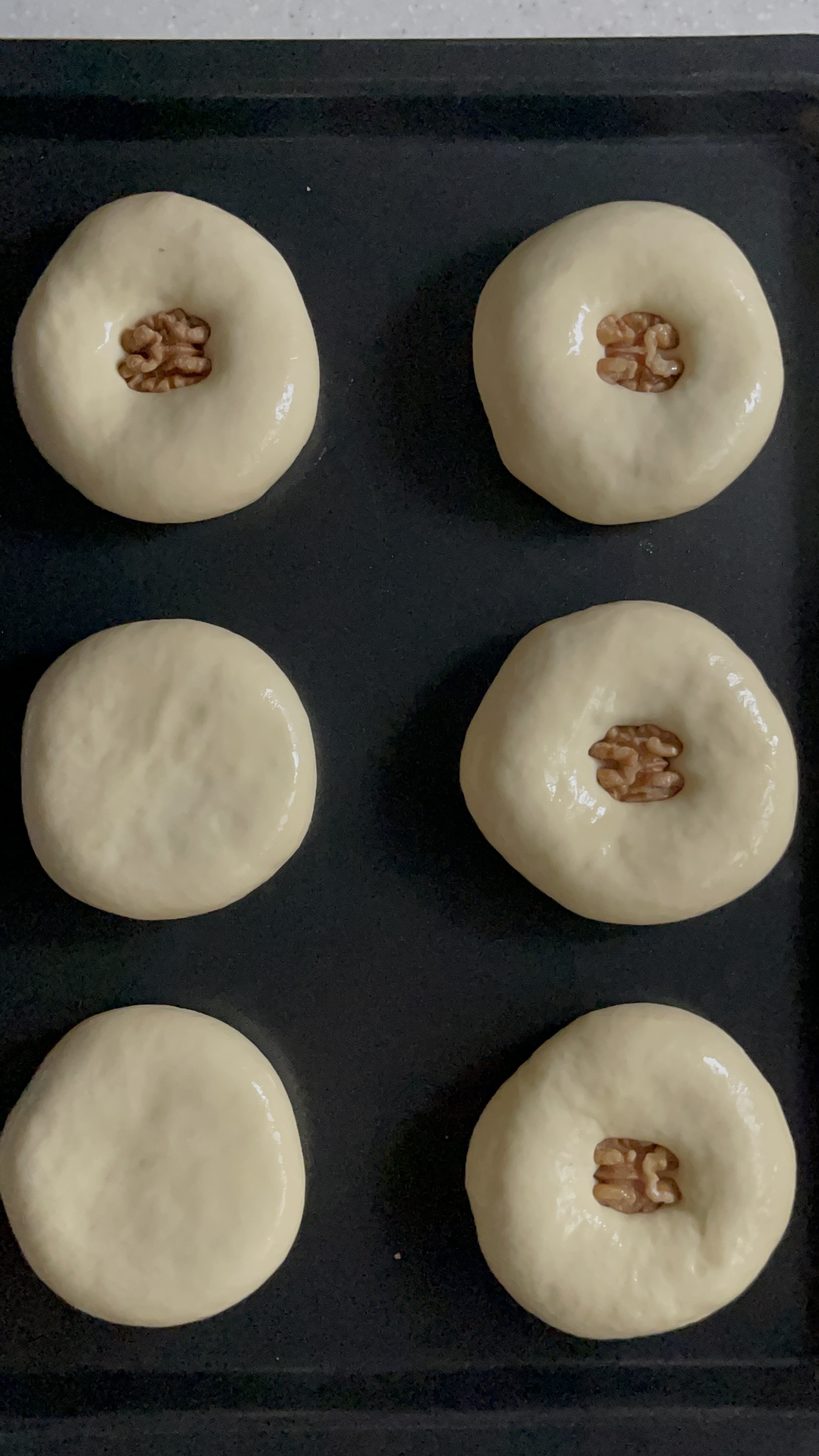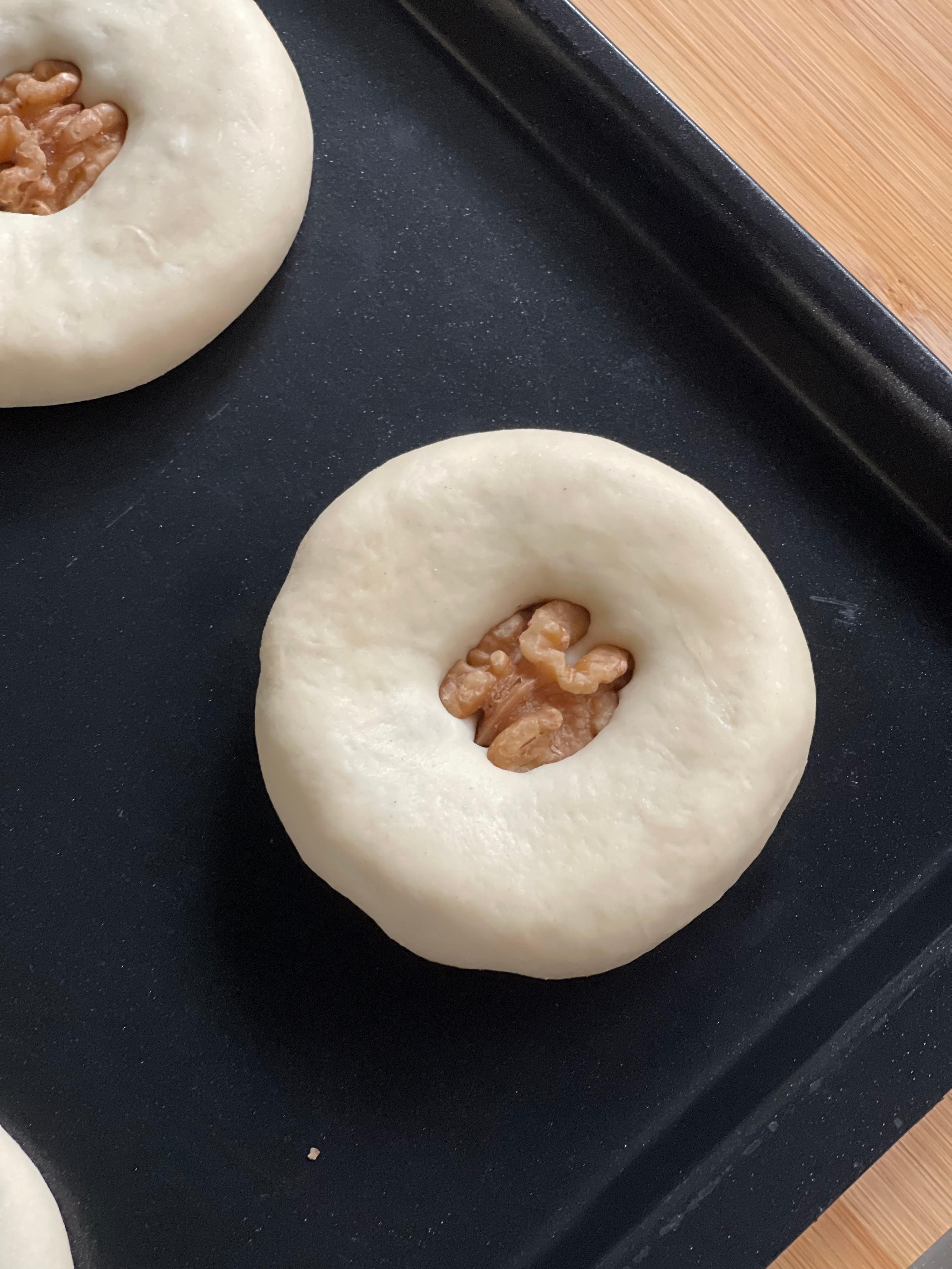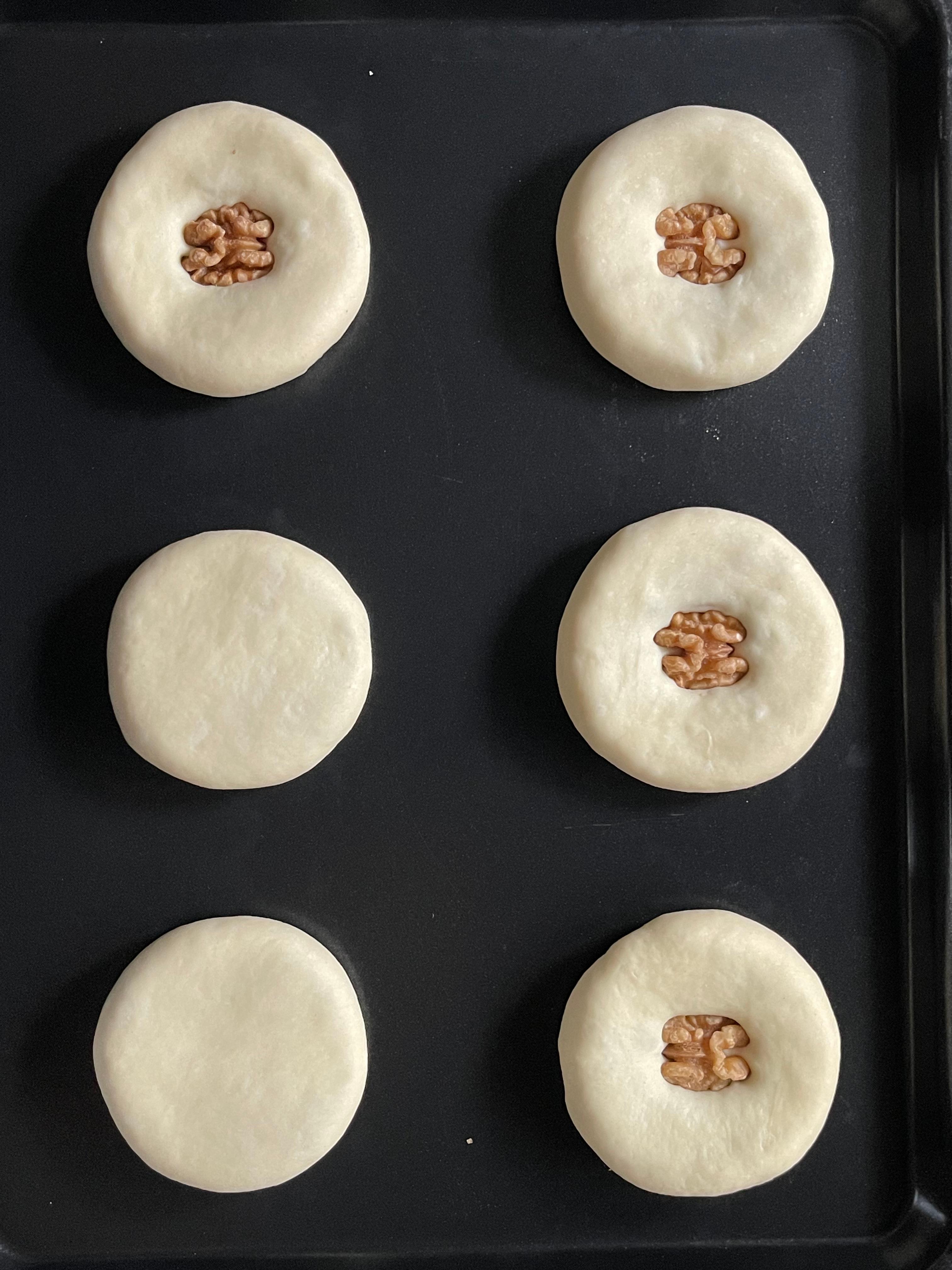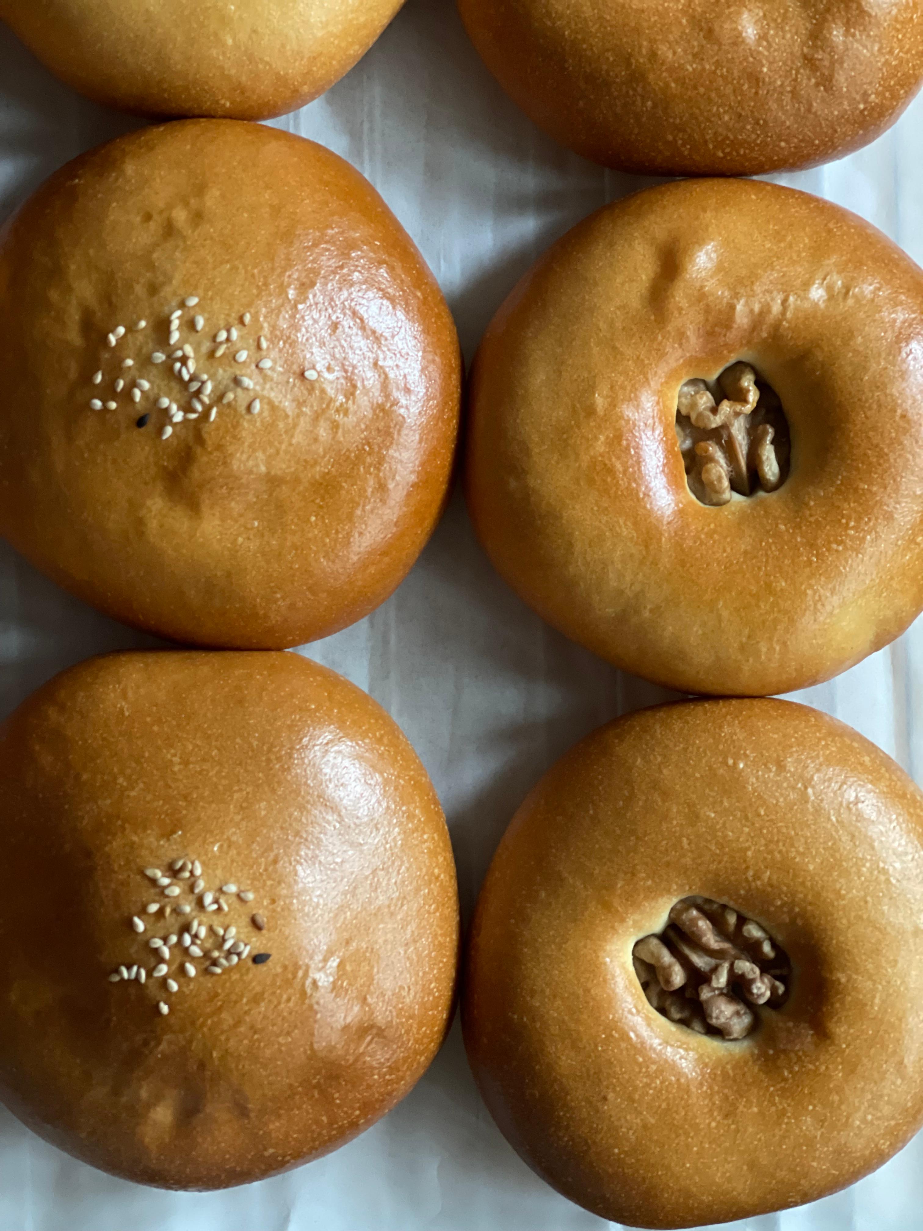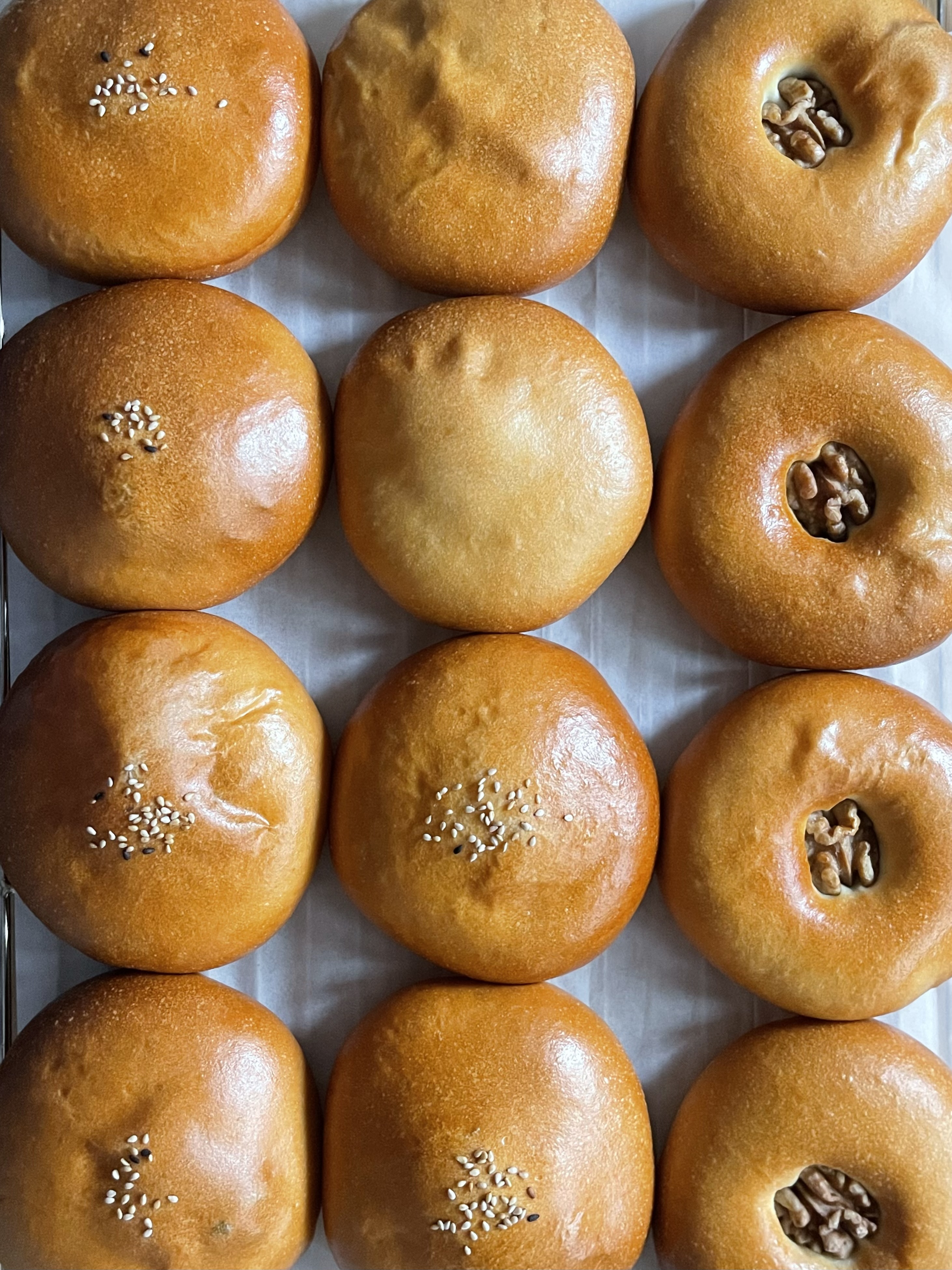 12개 중 4개는 호두 반태를 꾹 눌러 장식했고, 나머지는 굽기 직전에 체에 거른 계란물을 바르고 깨를 뿌려 마무리했다.