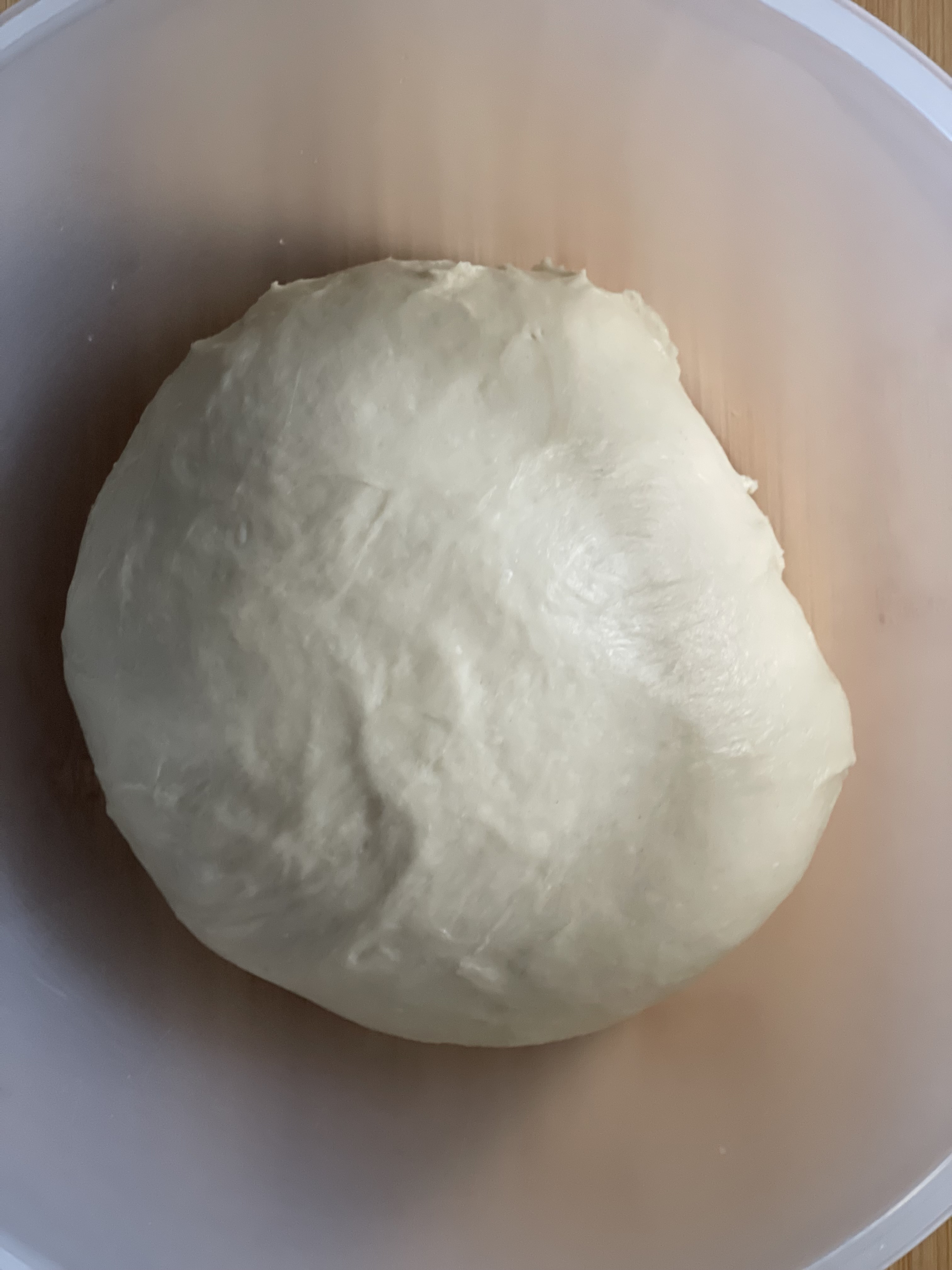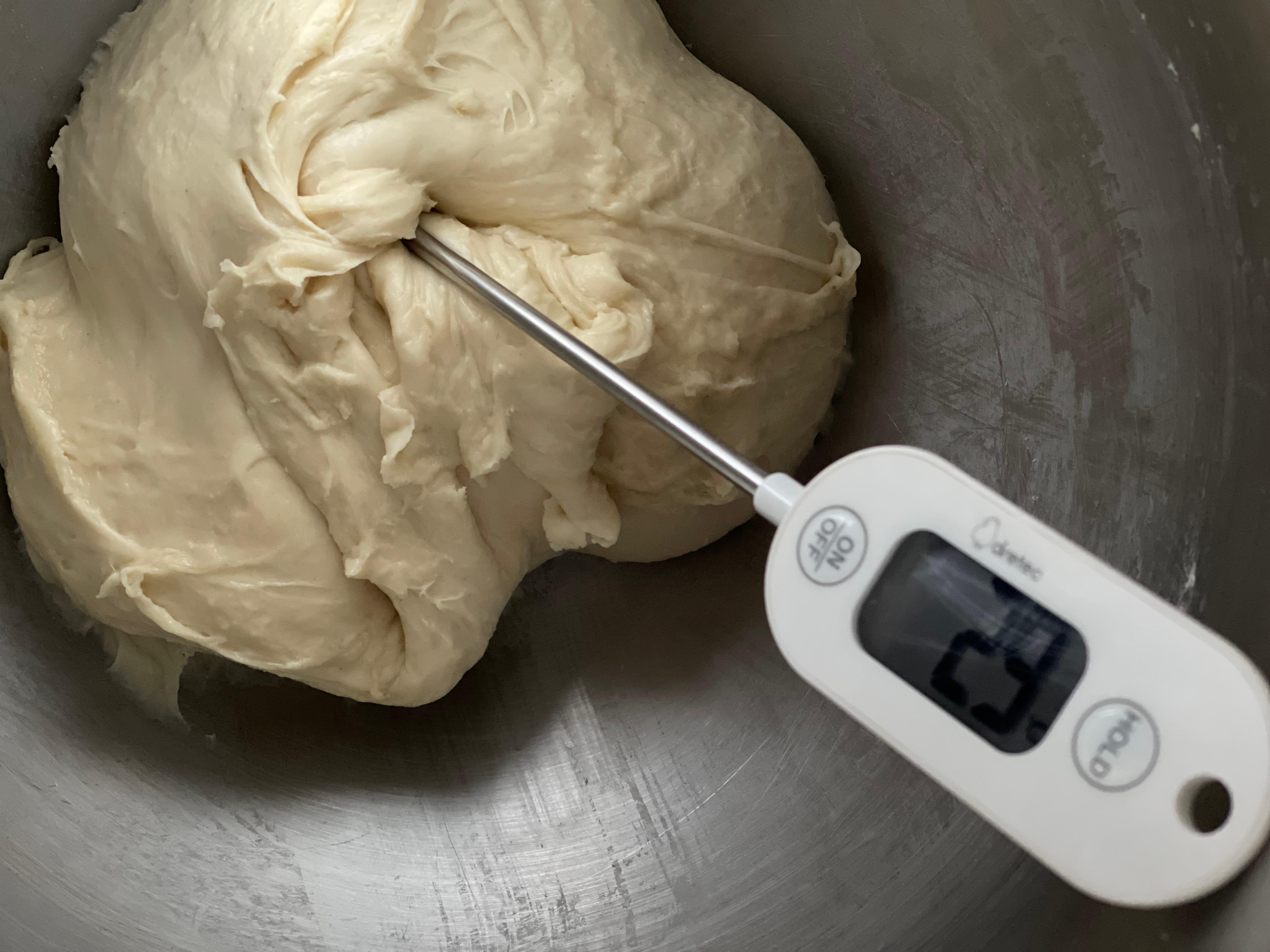 버터와 계란, 설탕이 들어가는 단과자빵 반죽이라 목표 반죽 온도는 27~28도. T55가 들어가서 글루텐이 잡히기까지 시간이 조금 더 걸려서 반죽 온도가 높게 나왔다. 그래서 1차 발효 시간을 조금 조정했다.