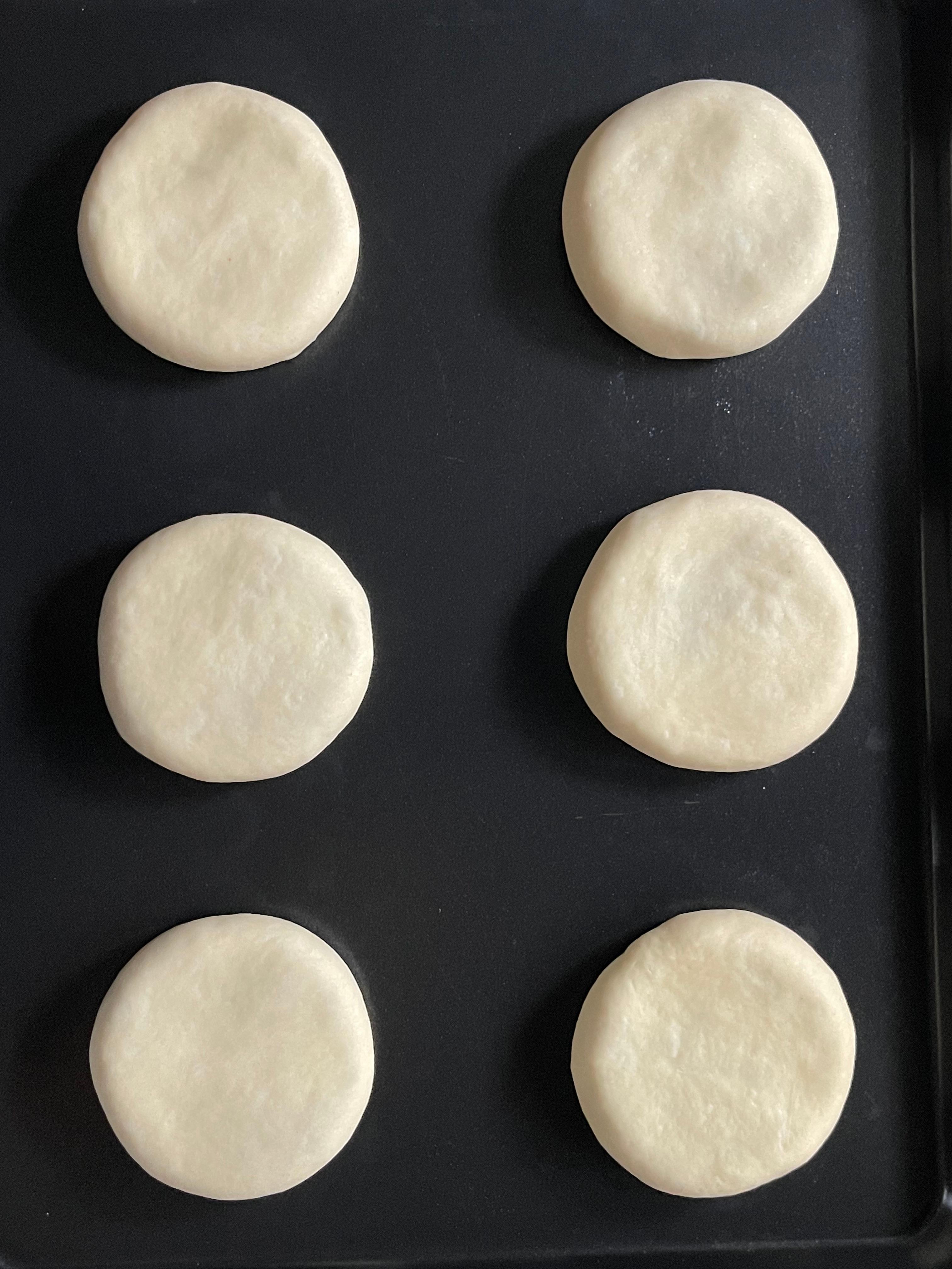 1차 발효가 끝난 반죽은 개당 52~53g으로 12개 분할 후 15분간 벤치 타임을 주었다. 벤치 타임이 끝난 반죽은 덧가루를 뿌리고 밀대를 사용해 납작한 원형으로 밀어편다.