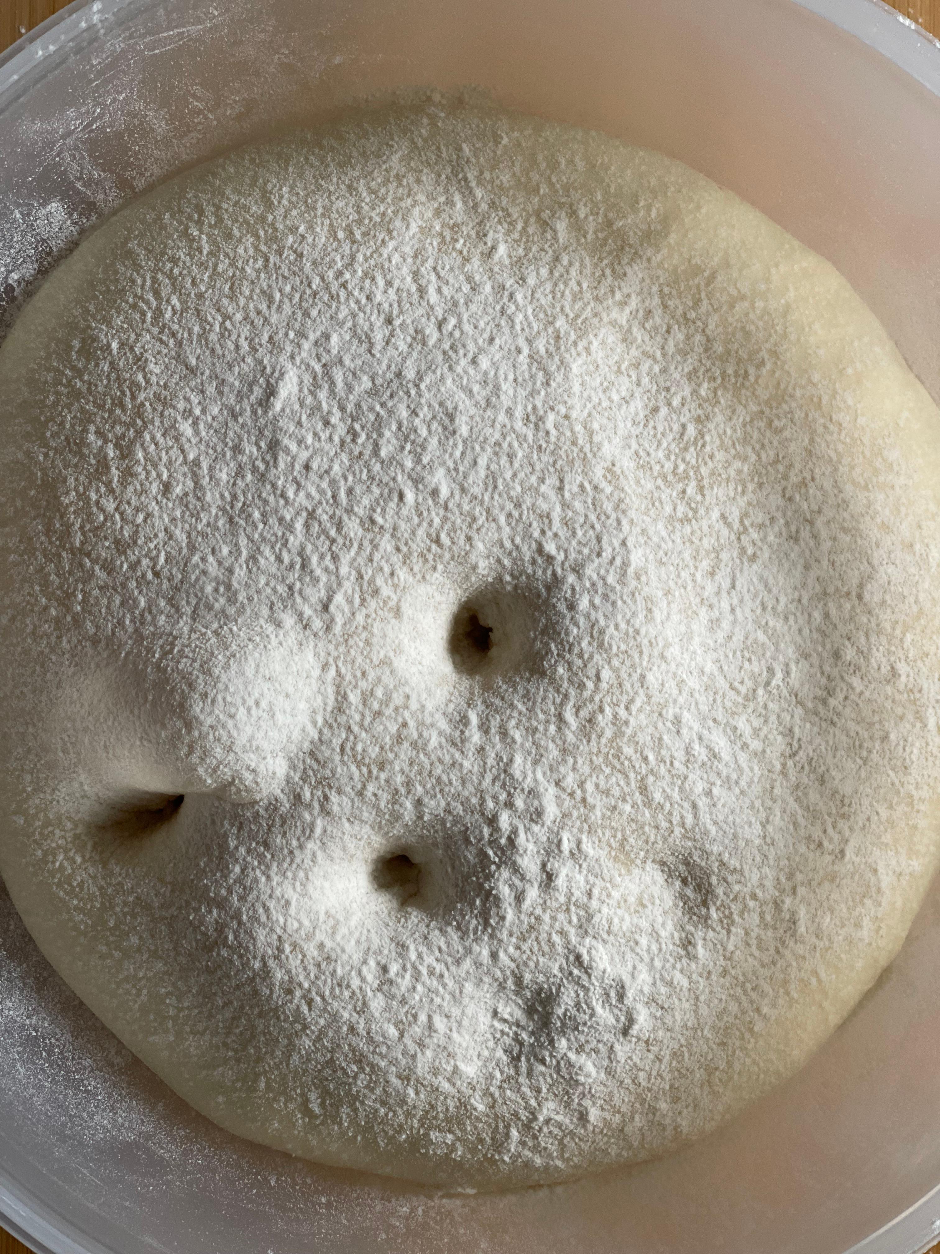 따뜻한 오븐(30도)에서 약 50분간 1차 발효를 진행했다. 발효 후에는 핑거 테스트로 상태를 확인했다.