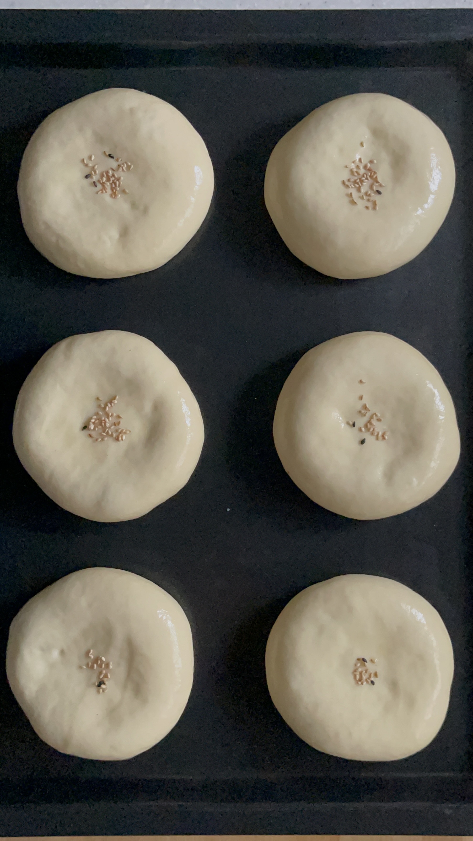 발효가 끝난 반죽 위에 다시 한 번 계란물을 얇게 발라주고, 깨를 뿌려 장식했다.