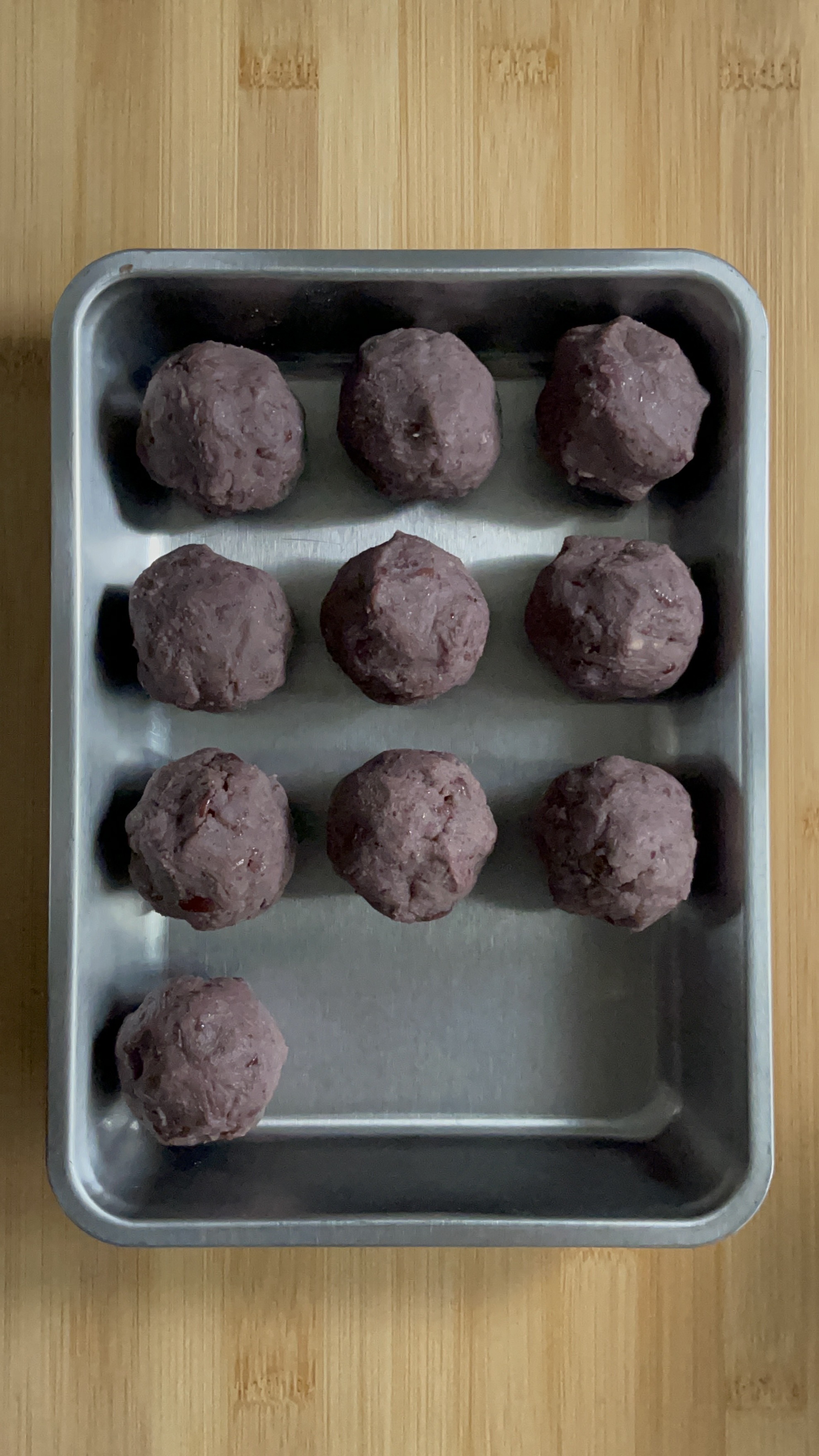 코팅팬에 간격을 맞춰 팬닝한 뒤 손바닥으로 살짝 눌러 납작하게 만들어 주었다.