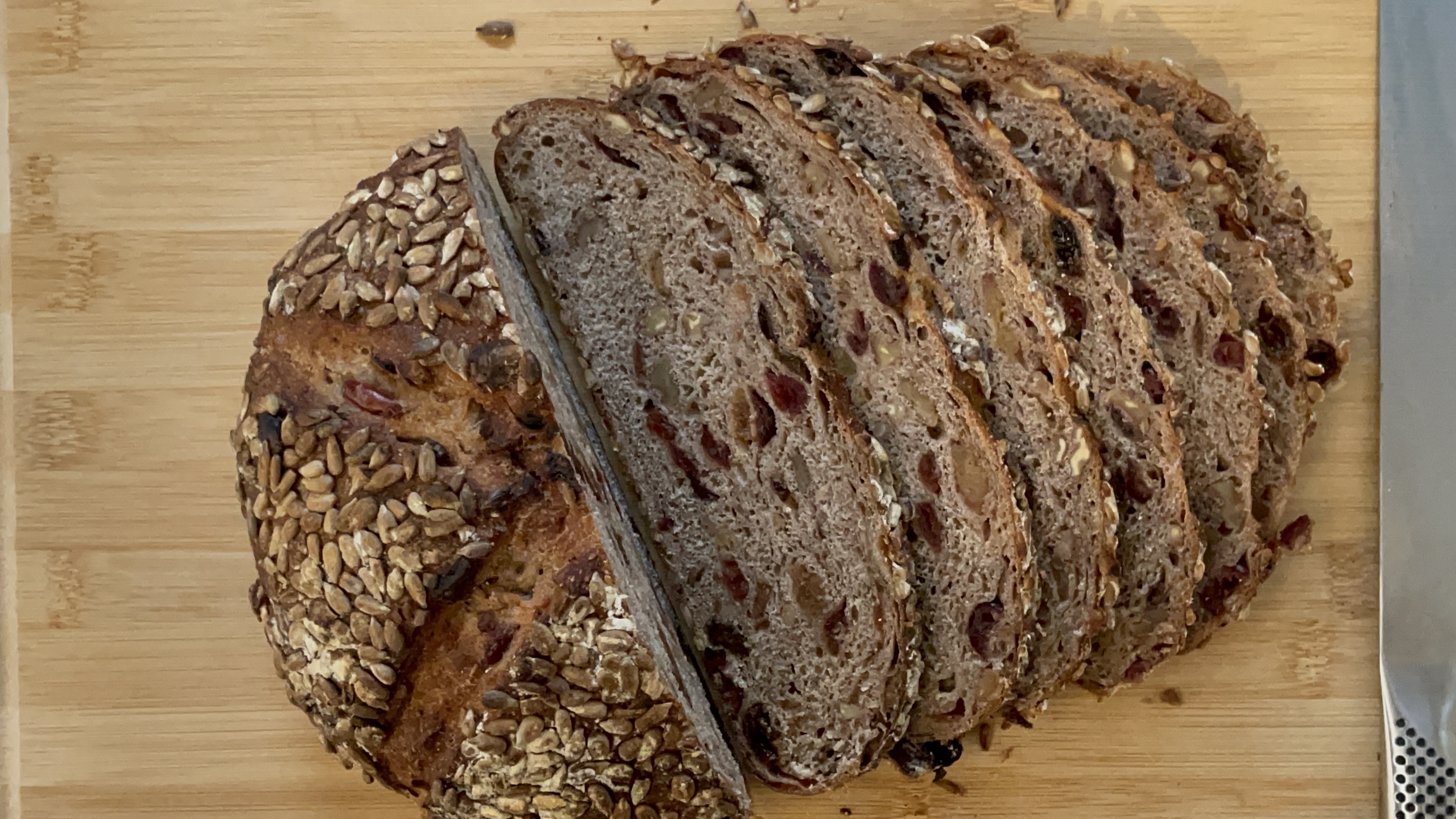 앙꼬님의 넛츠 통밀빵은 달콤한 건과일과 고소한 넛츠가 듬뿍 박힌 통밀빵이다.
