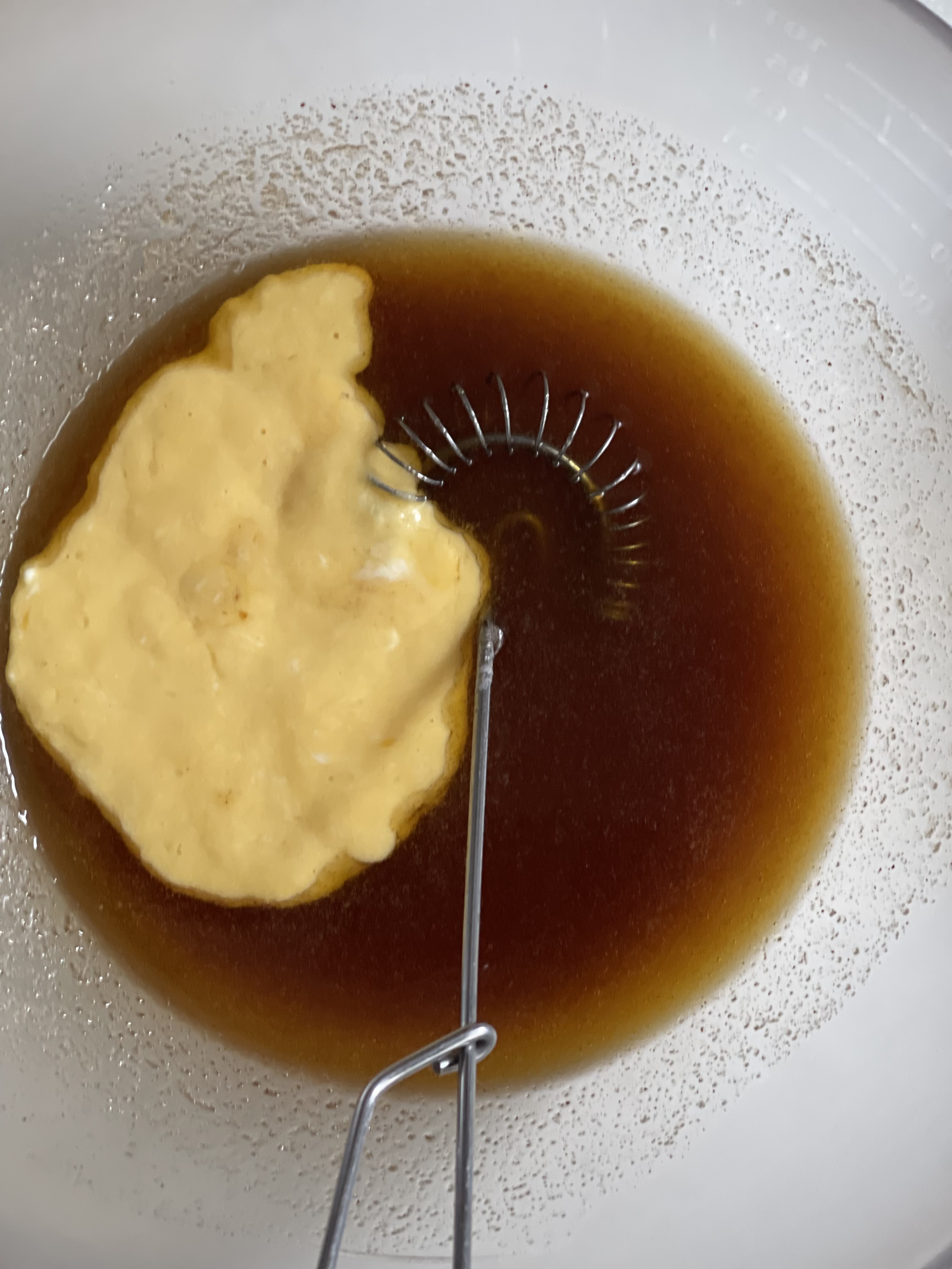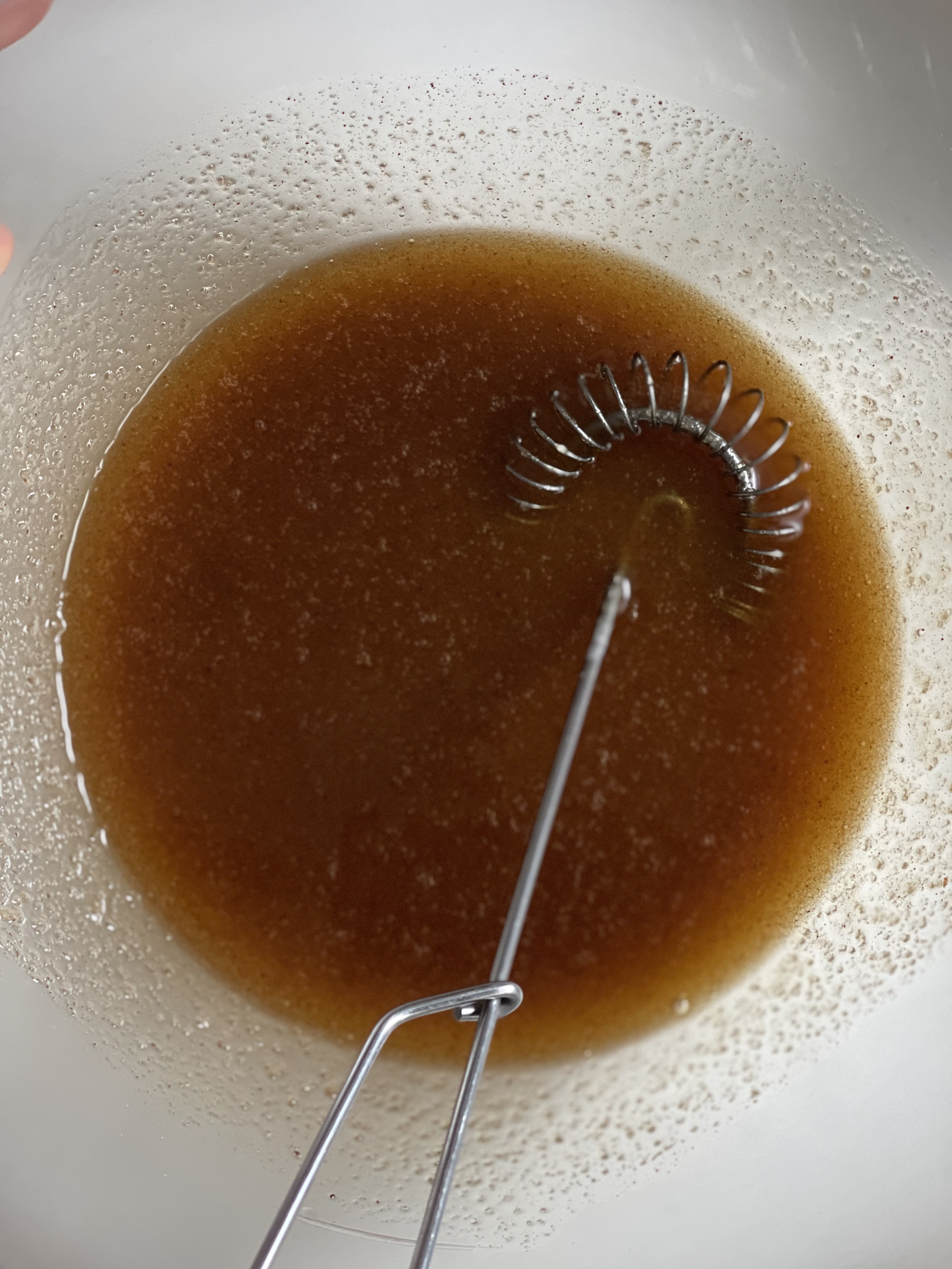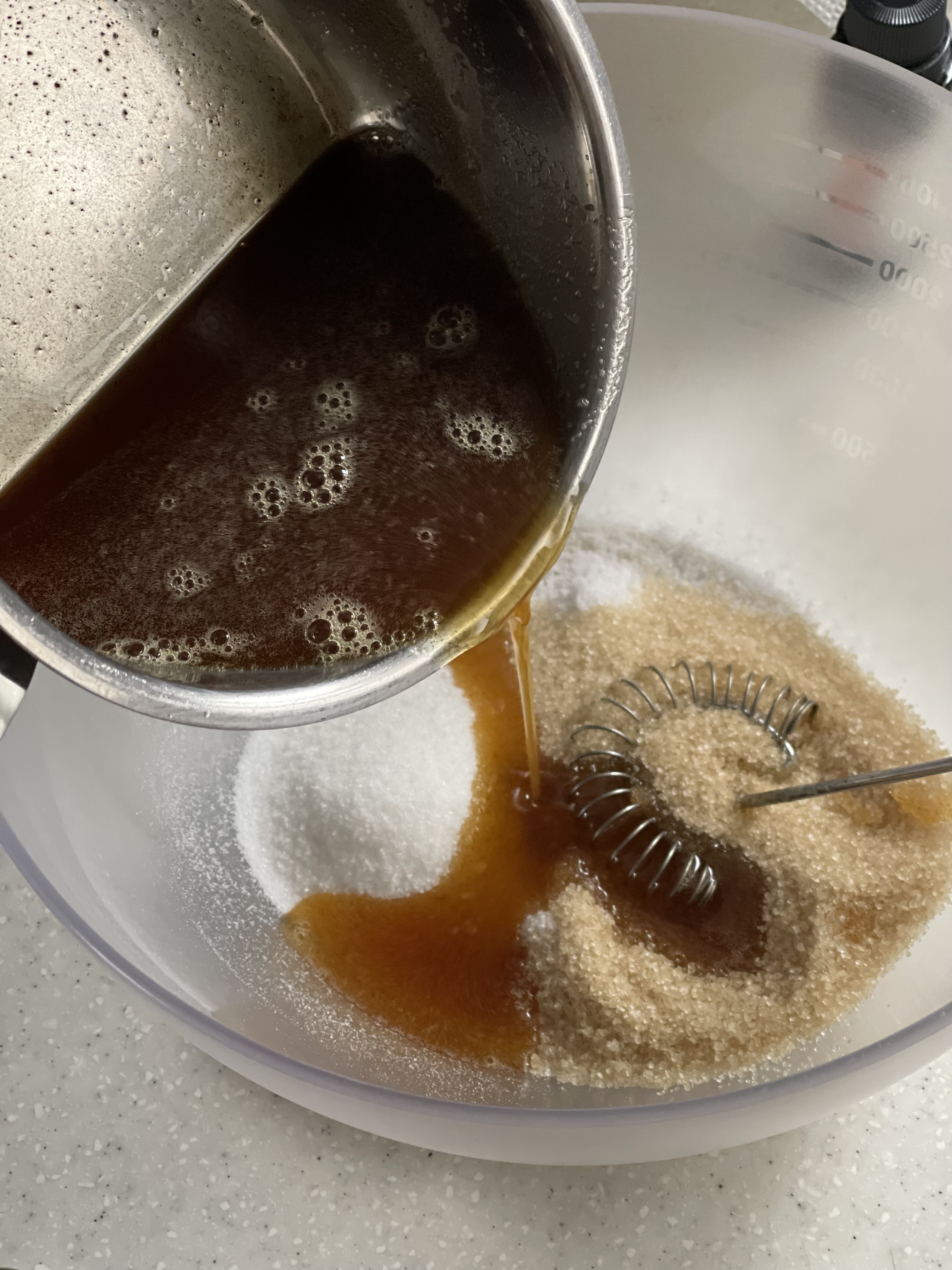 40~45도 정도로 따뜻하게 식힌 뒤 설탕 2종과 소금에 부어 섞는다.