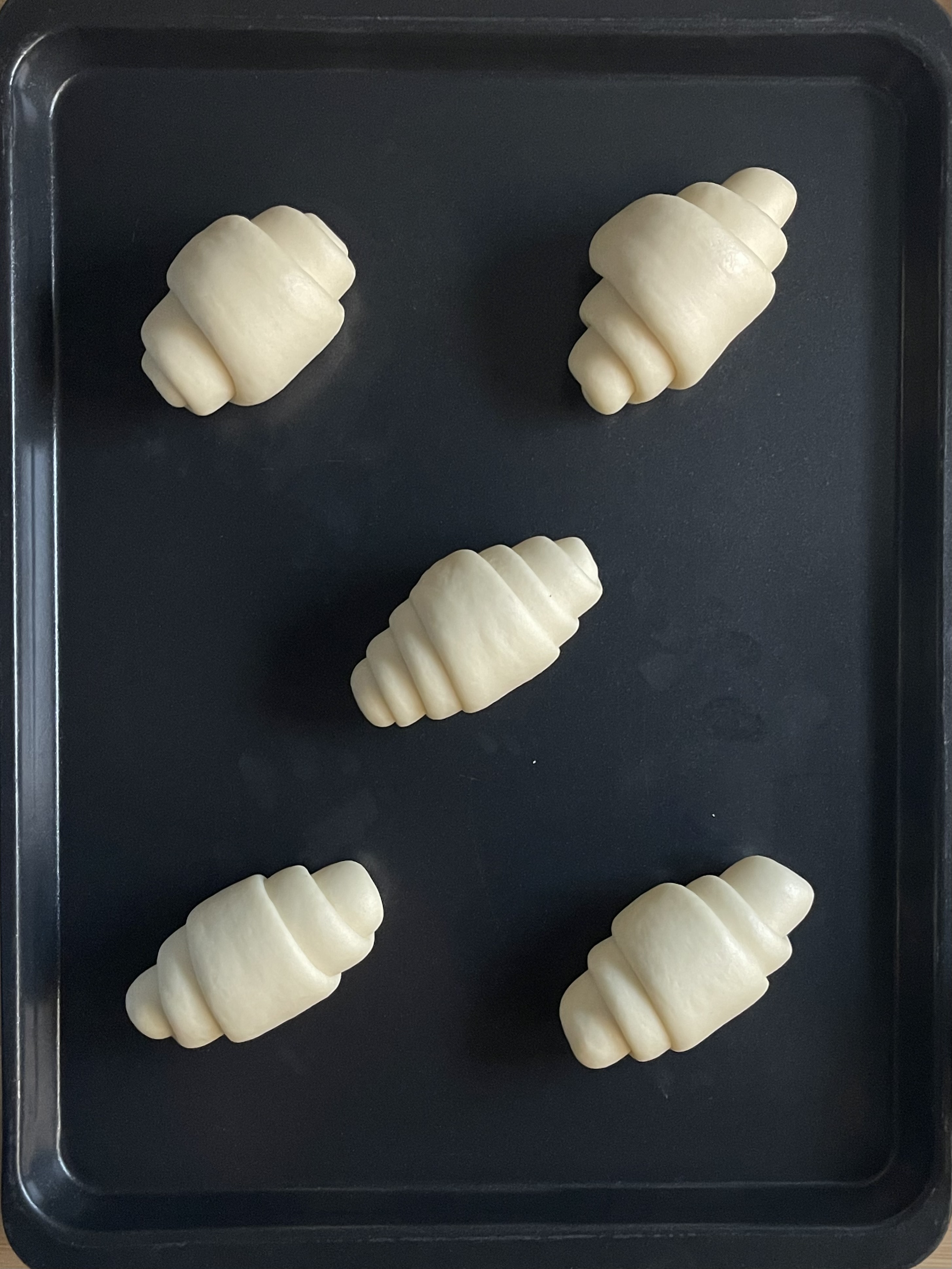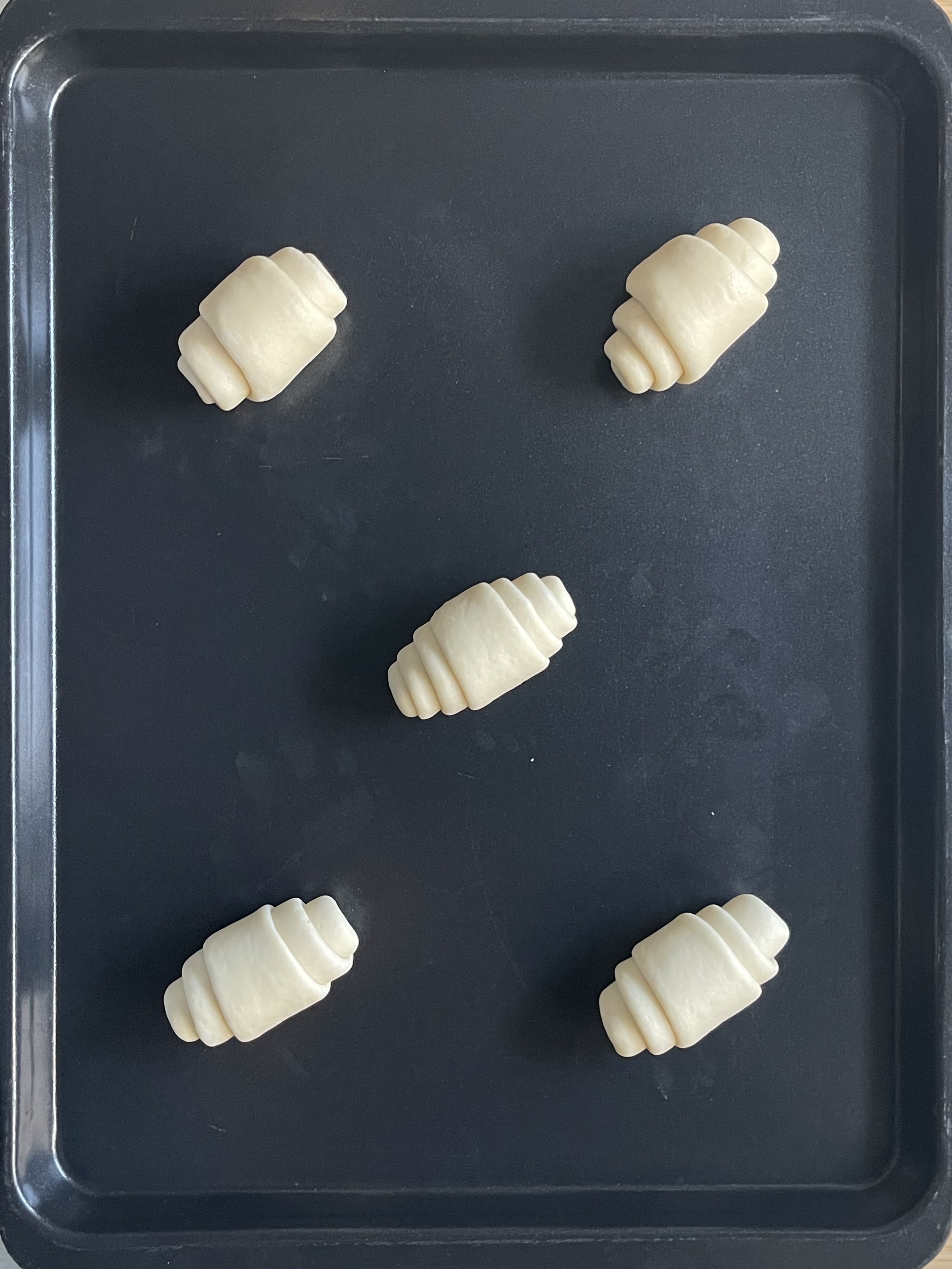 버터롤은 여기서 올챙이 모양으로 성형 후 15분 벤치 타임. 그리고 소금빵처럼 길게 밀어펴고 말아내면 된다.