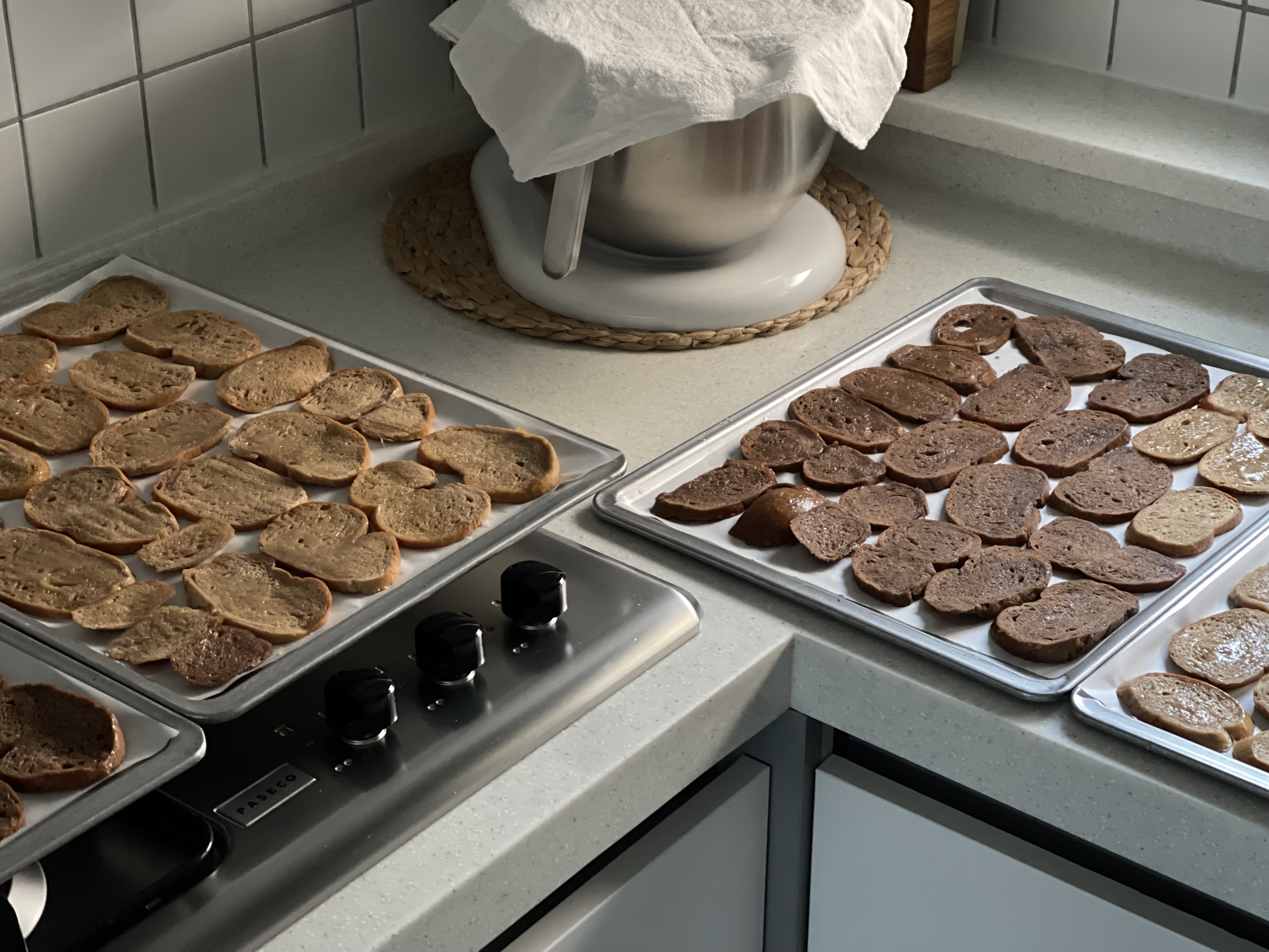 줄지 않는 초강력분 소진을 위해 베이글 12개를 구웠다.