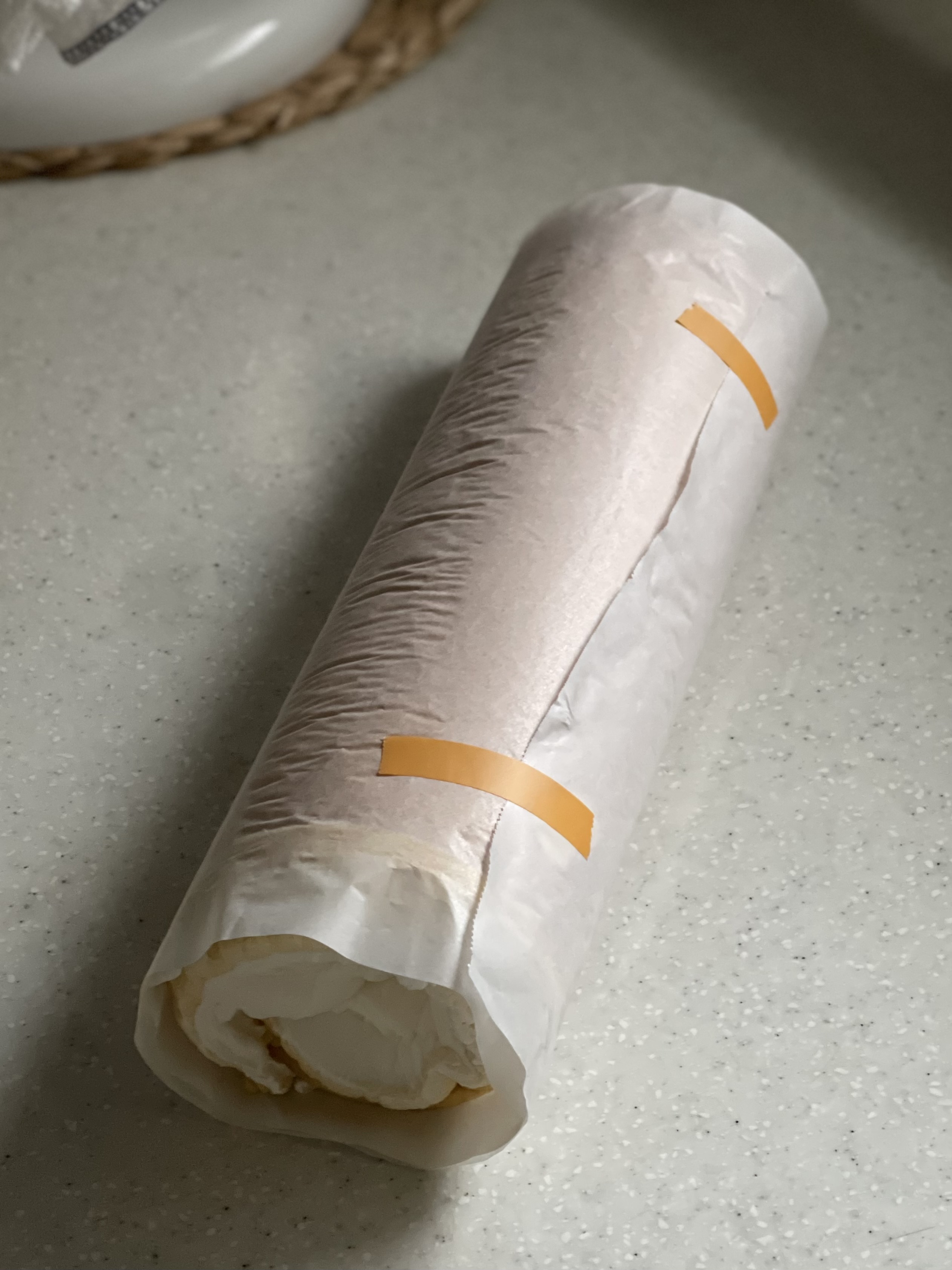 선물하기 하루 전날 미리 시트를 구워두었는데, 그대로 펼쳐두면 다음날 말 때 찢어질 것 같았다. 그래서 다 쓴 랩 심지에 봉지를 씌워 돌돌 말아 실온에 두었다.