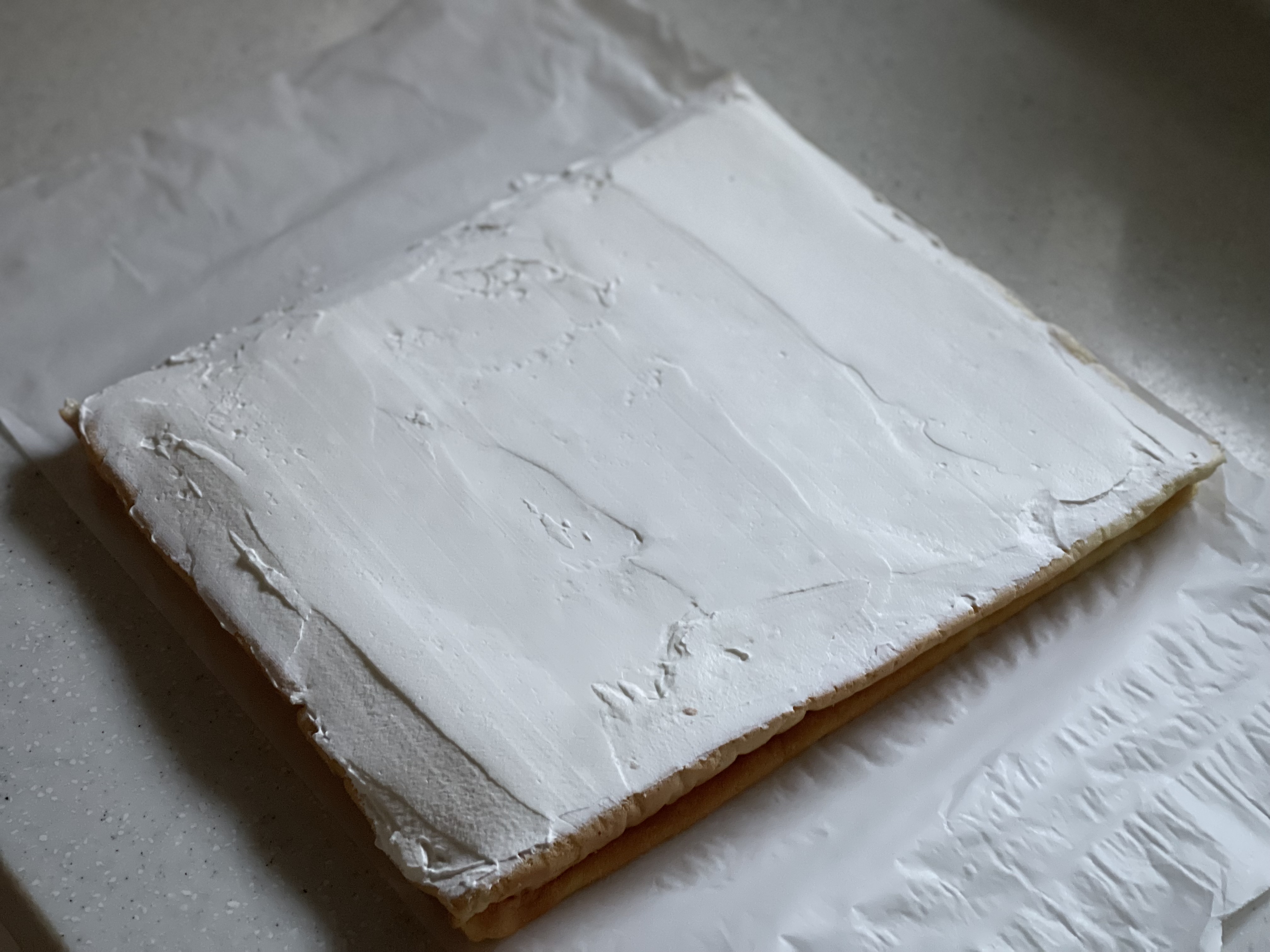 다음 날 아침, 생크림에 마스카포네 대신 크림치즈를 넣고 설탕을 더해 단단하게 휘핑한 뒤 시트에 고르게 펴 바르고 말았다.