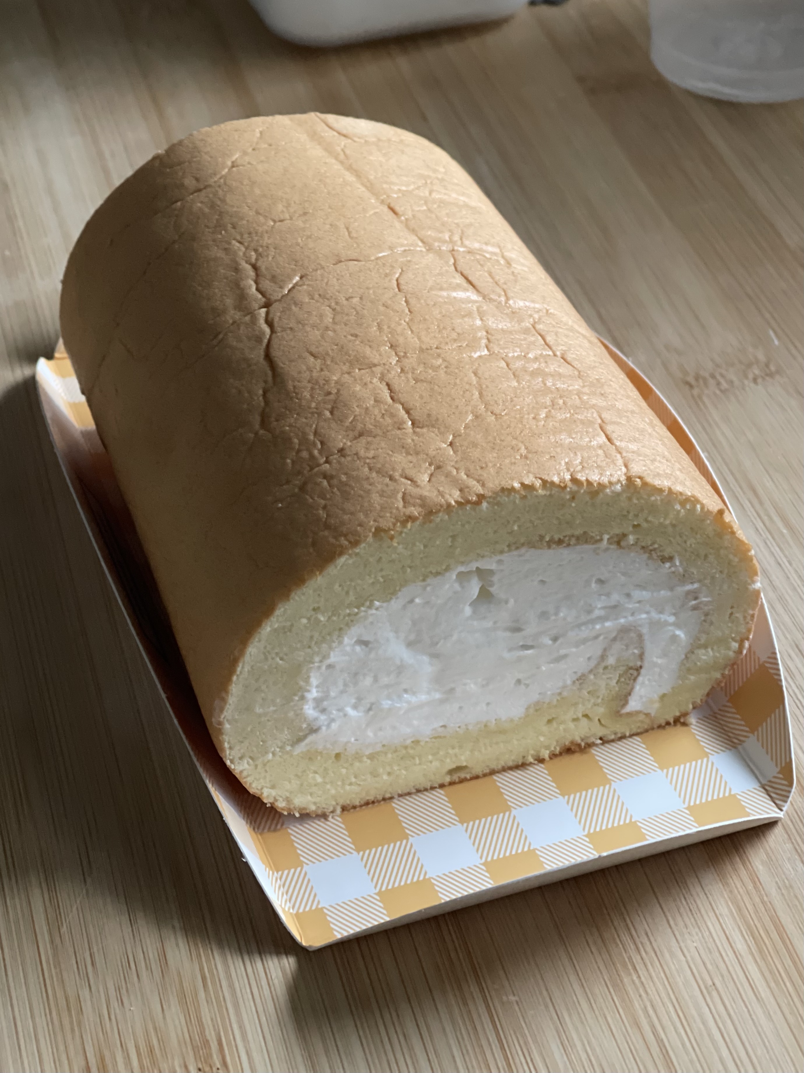 팬닝할 때 평탄화를 제대로 하지 못해서 한쪽 끝이 얇게 나왔다. 윗면은 고르게 구워졌지만, 바닥은 종이호일을 두 장 겹친 탓인지 주름 자국 때문에 색이 조금 고르지 않았다. 크림이 닿는 안쪽이라 다행이었지만.