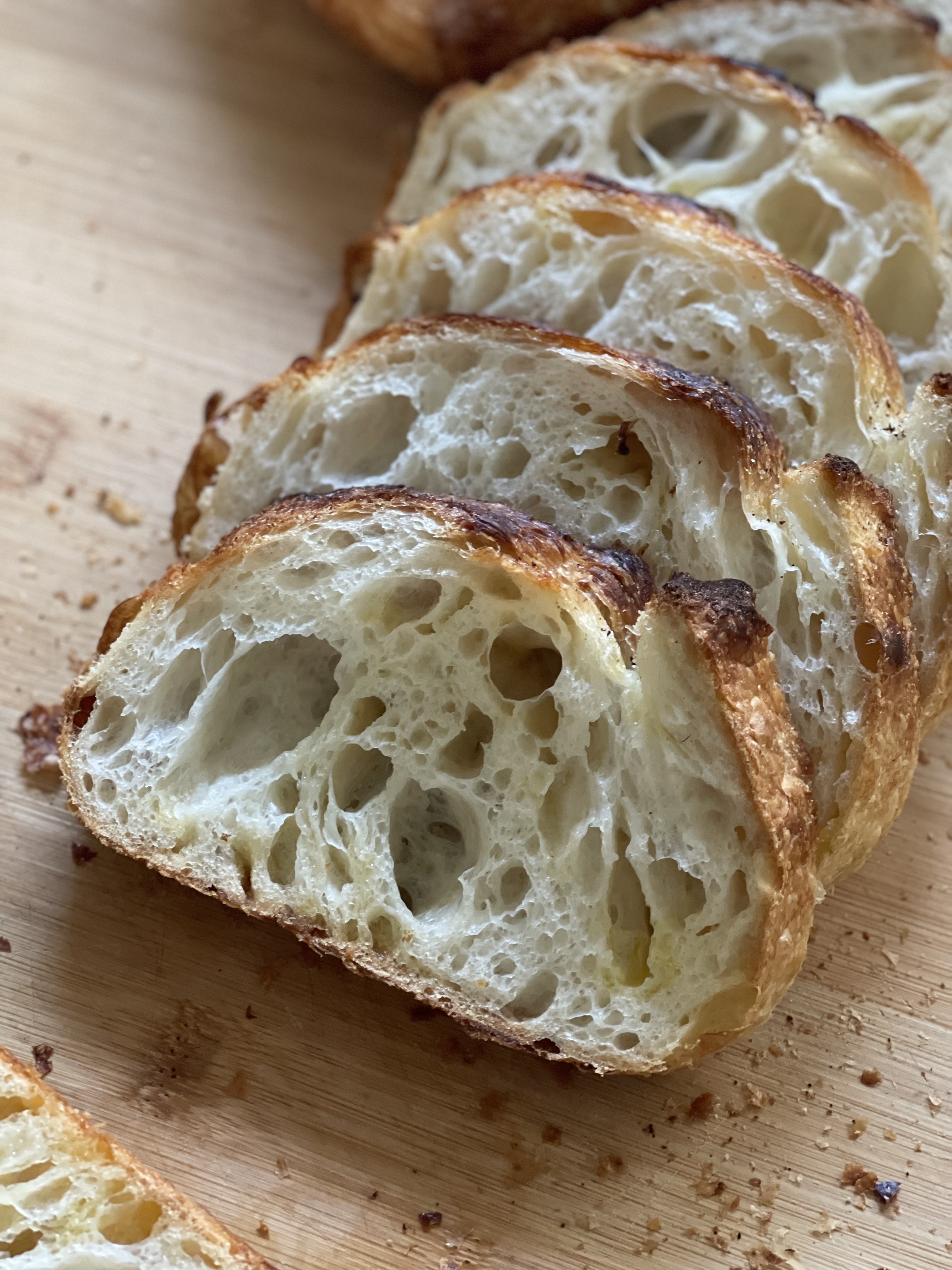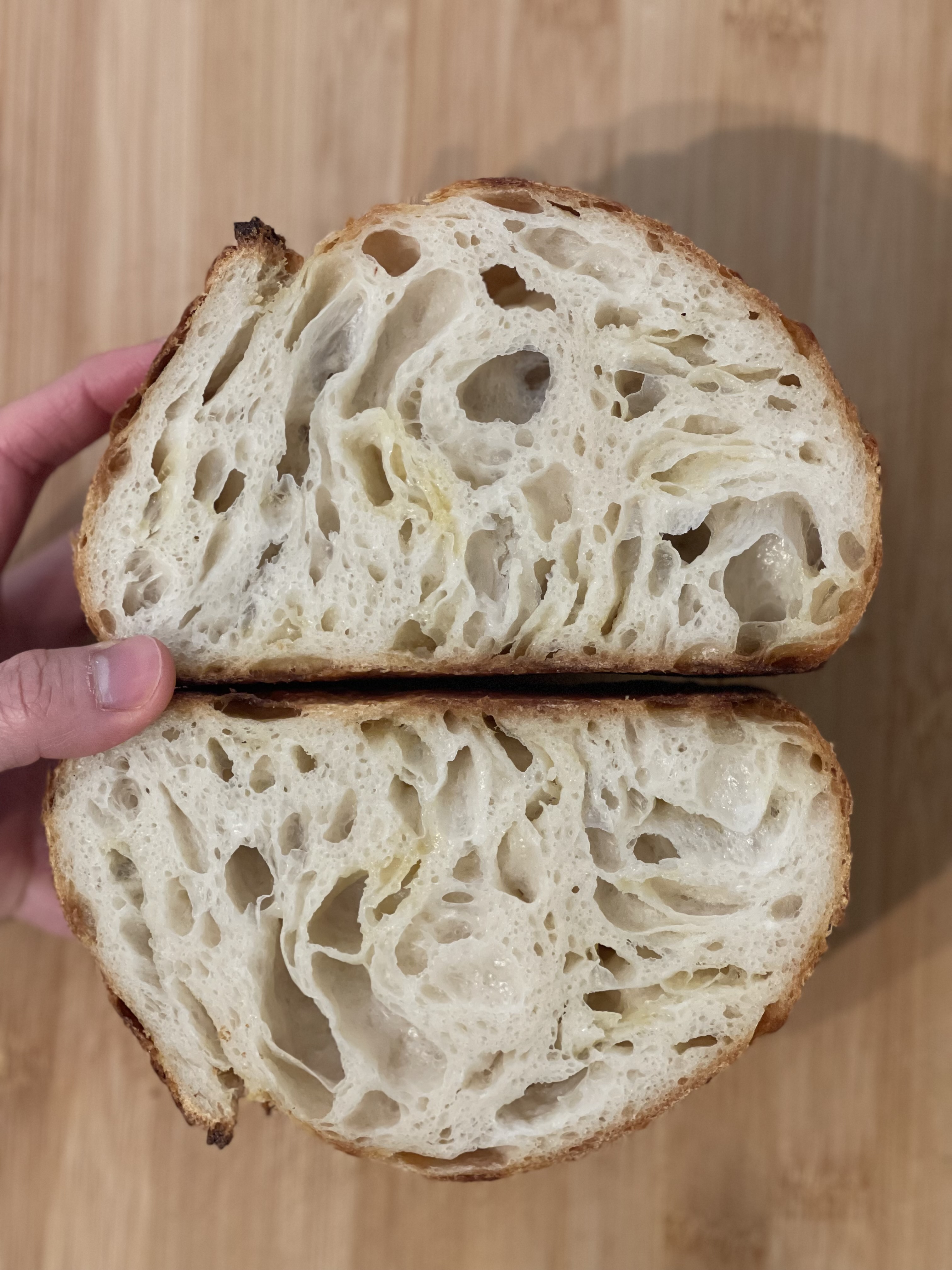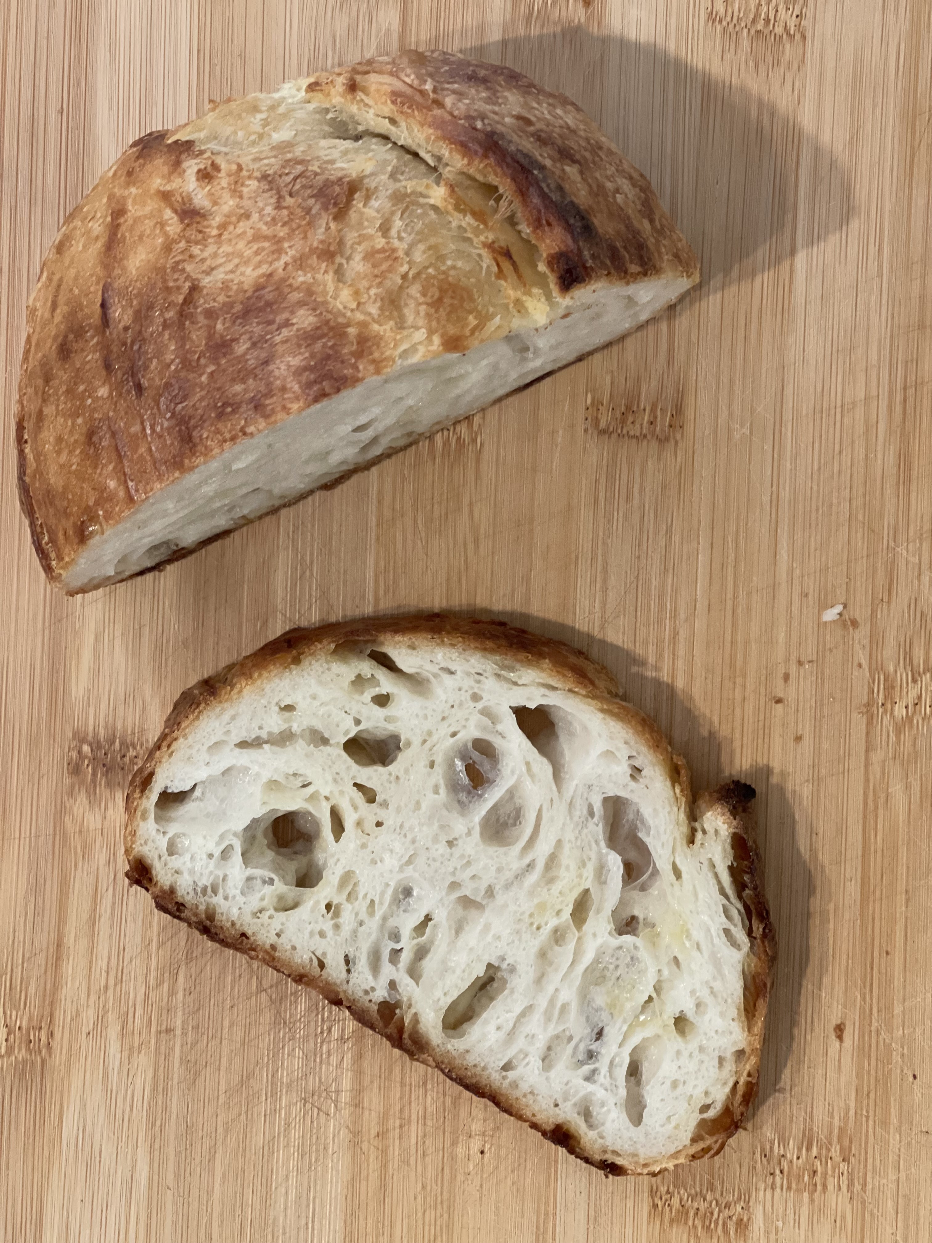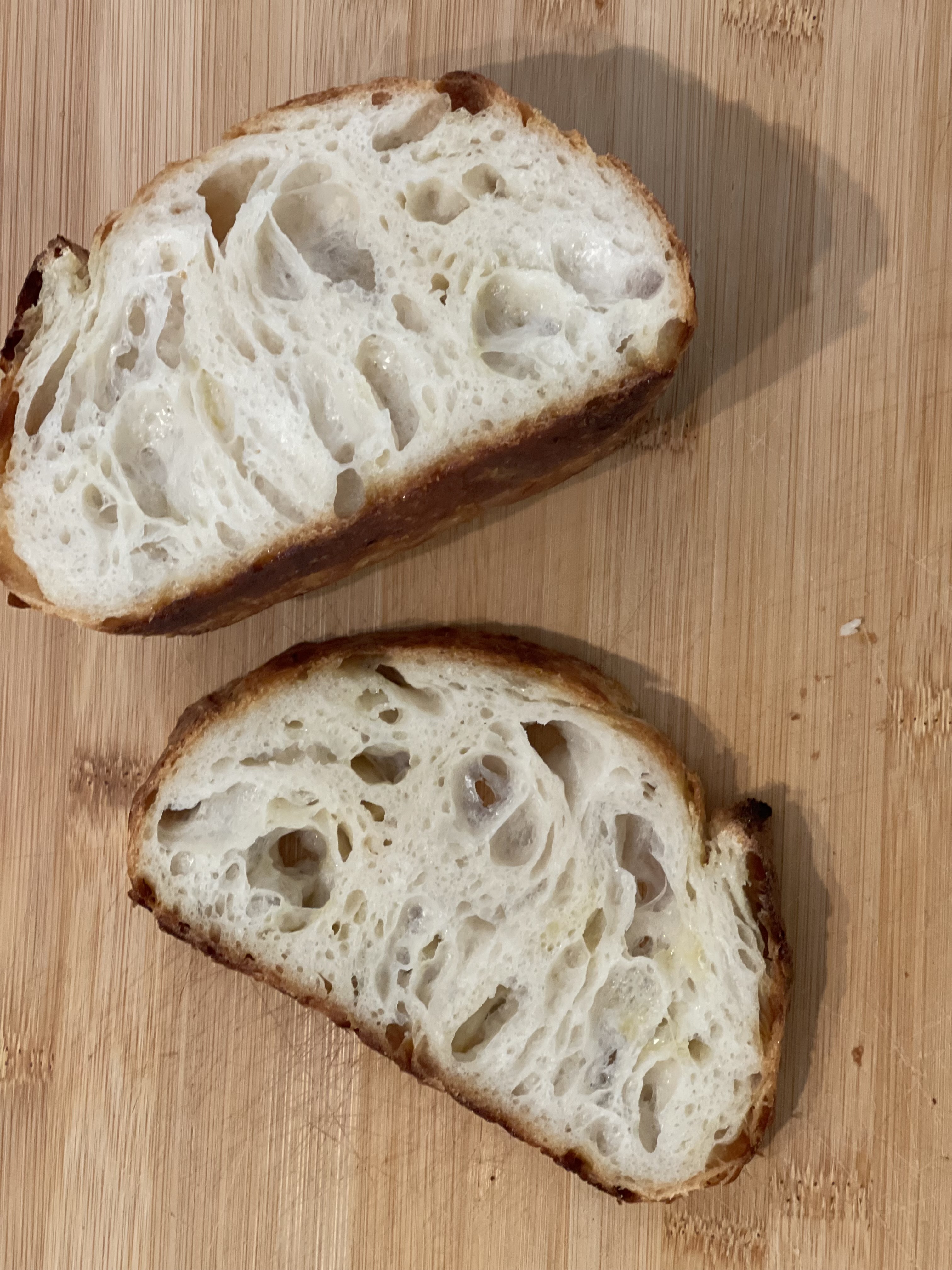 단면을 잘라보니 기공도 질감도 전체적으로 묵직하다. 이전에 만들었던 버터 깜빠뉴는 크럼이 아주 가벼웠는데, 이번에는 찰지고 무거운 질감이 강하다. 버터가 충분히 냉을 먹고, 글루텐도 안정화가 되어야 하는데 역시 2시간은 너무 짧았다.