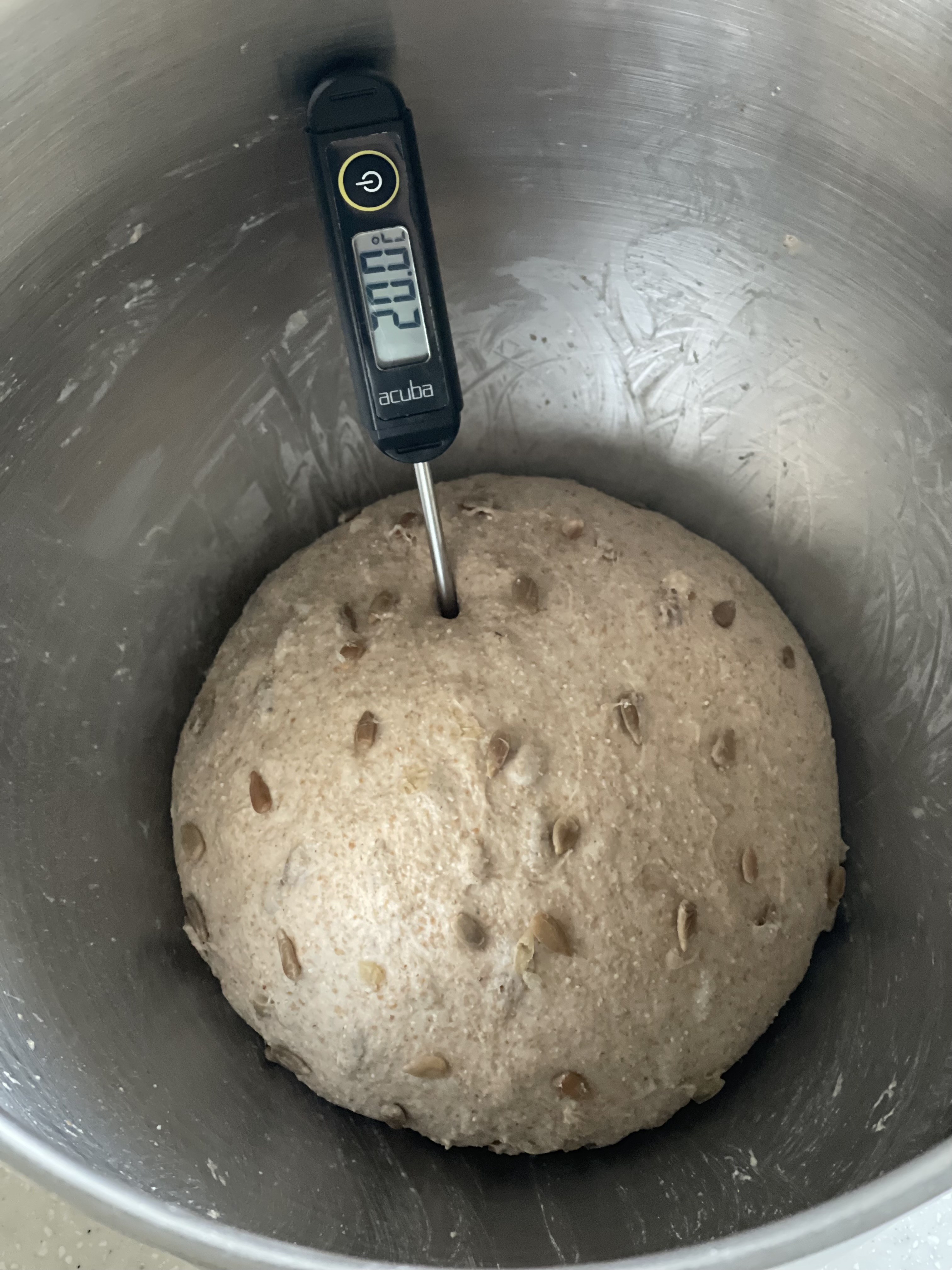 해바라기씨는 쿠진아트 에프에 넣어 165도에서 15분간 로스팅한 뒤, 반죽 속 수분을 뺏기지 않도록 미리 물을 부어 충분히 불렸다. 체로 건져내어 믹싱 마지막에 넣어 섞었다. 이번에는 수분율이 잘 맞았는지 반죽 컨디션이 마음에 들었다. 반죽 온도가 20도로 너무 낮게 나온 점은 아쉬웠지만.