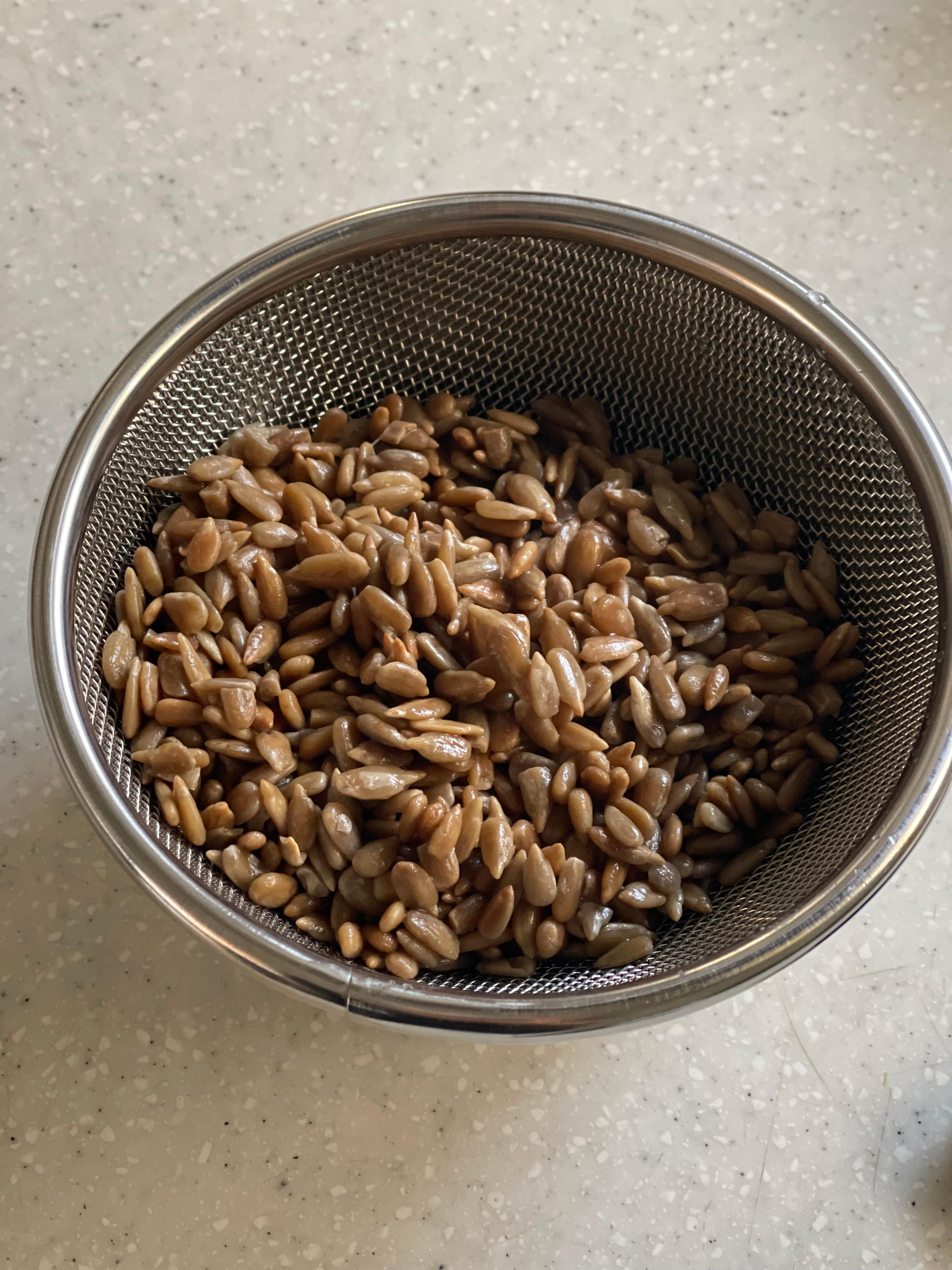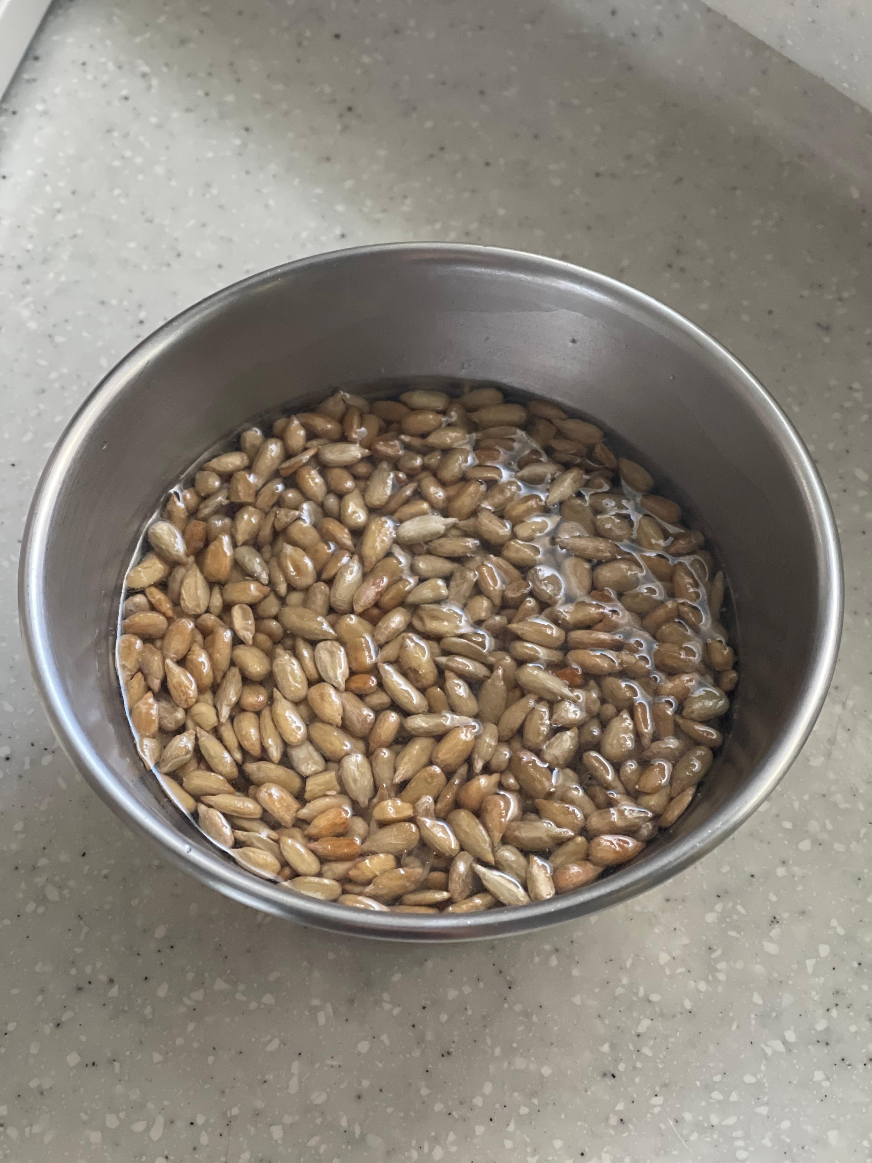 바타르 형태로 성형하고 표면에 물을 묻힌 뒤 해바라기씨를 넉넉하게 붙였다.