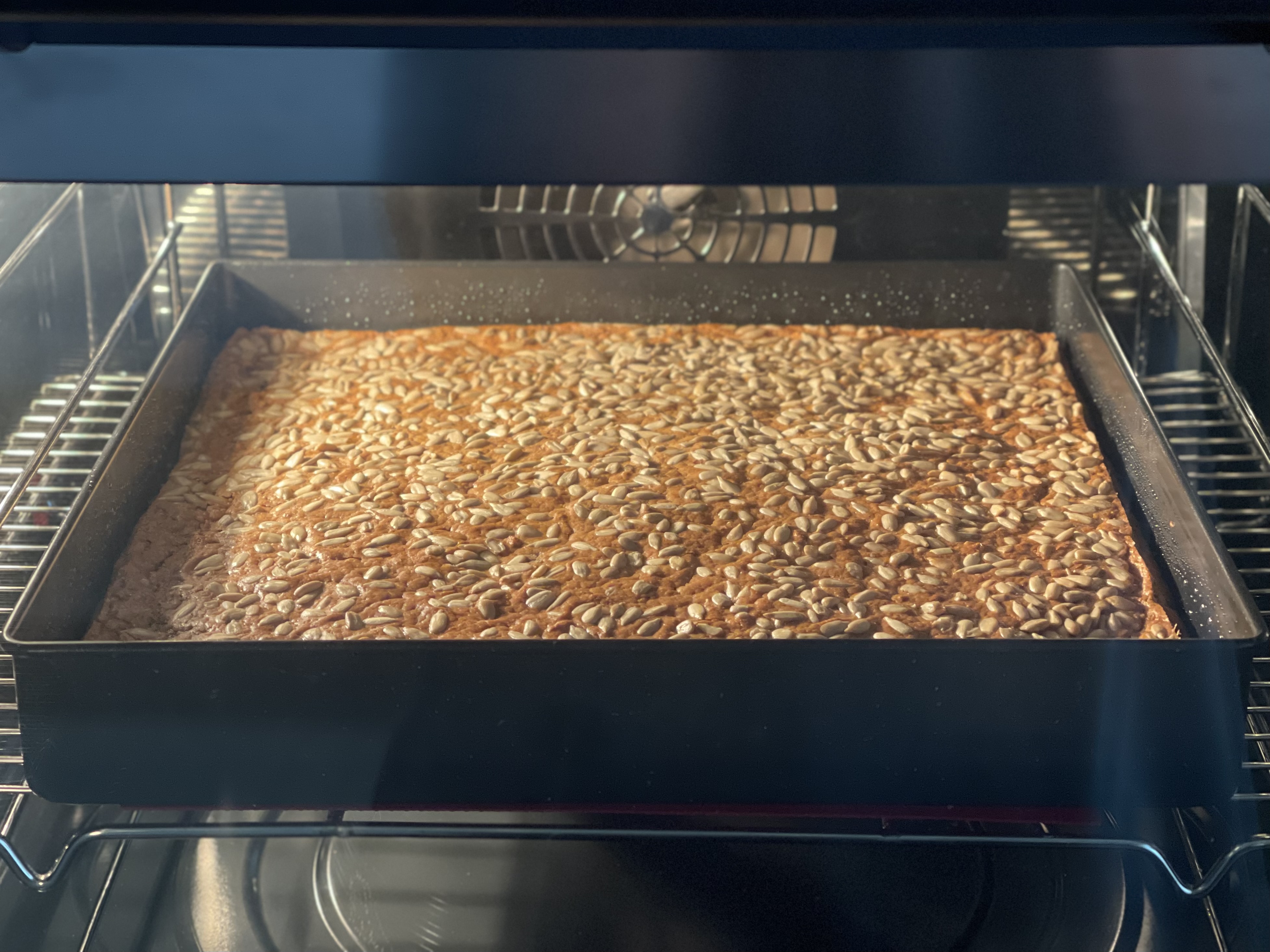 - 오일을 바른 팬에 반죽을 붓고, 윗면에 해바라기씨를 뿌린다.