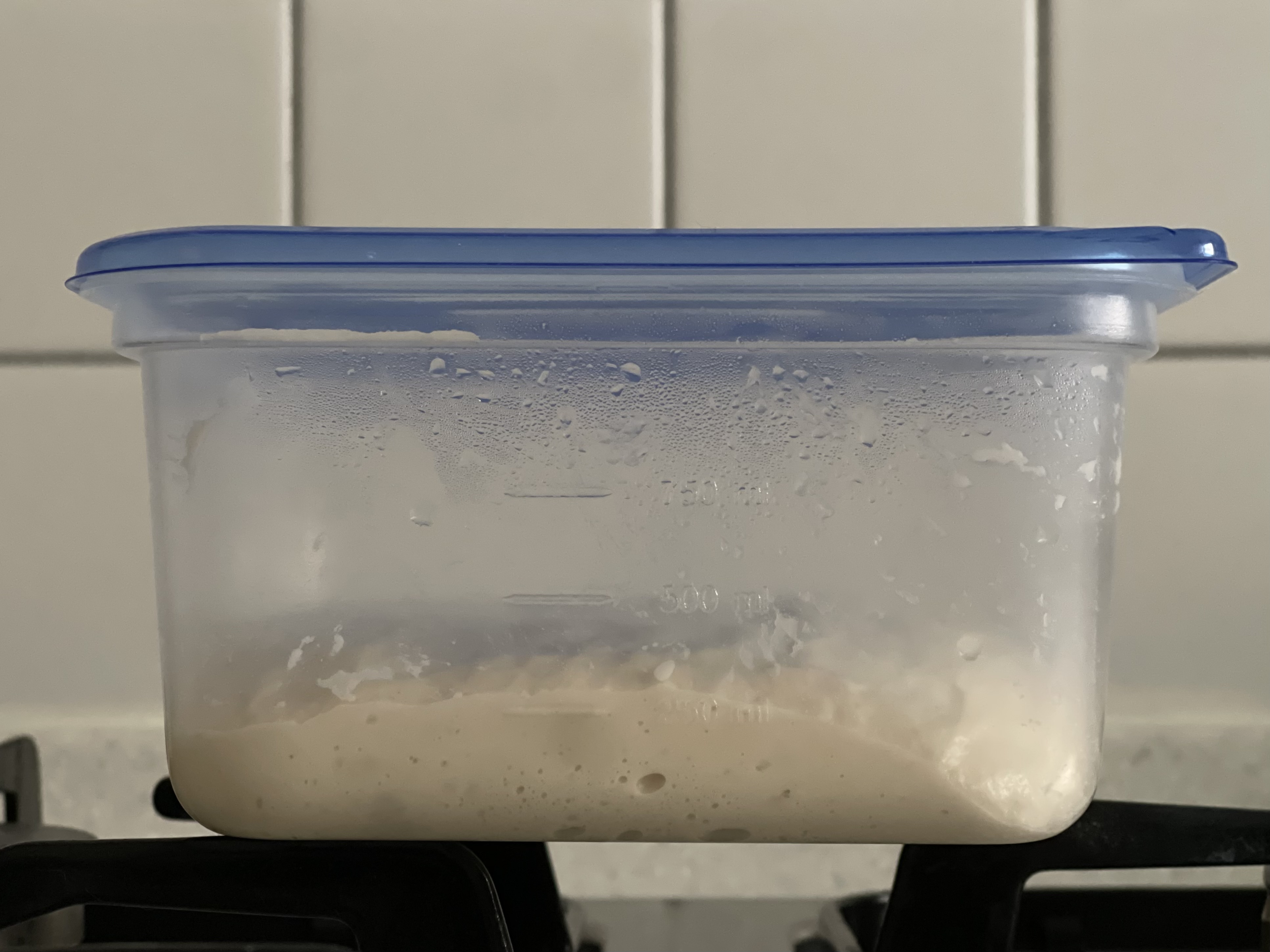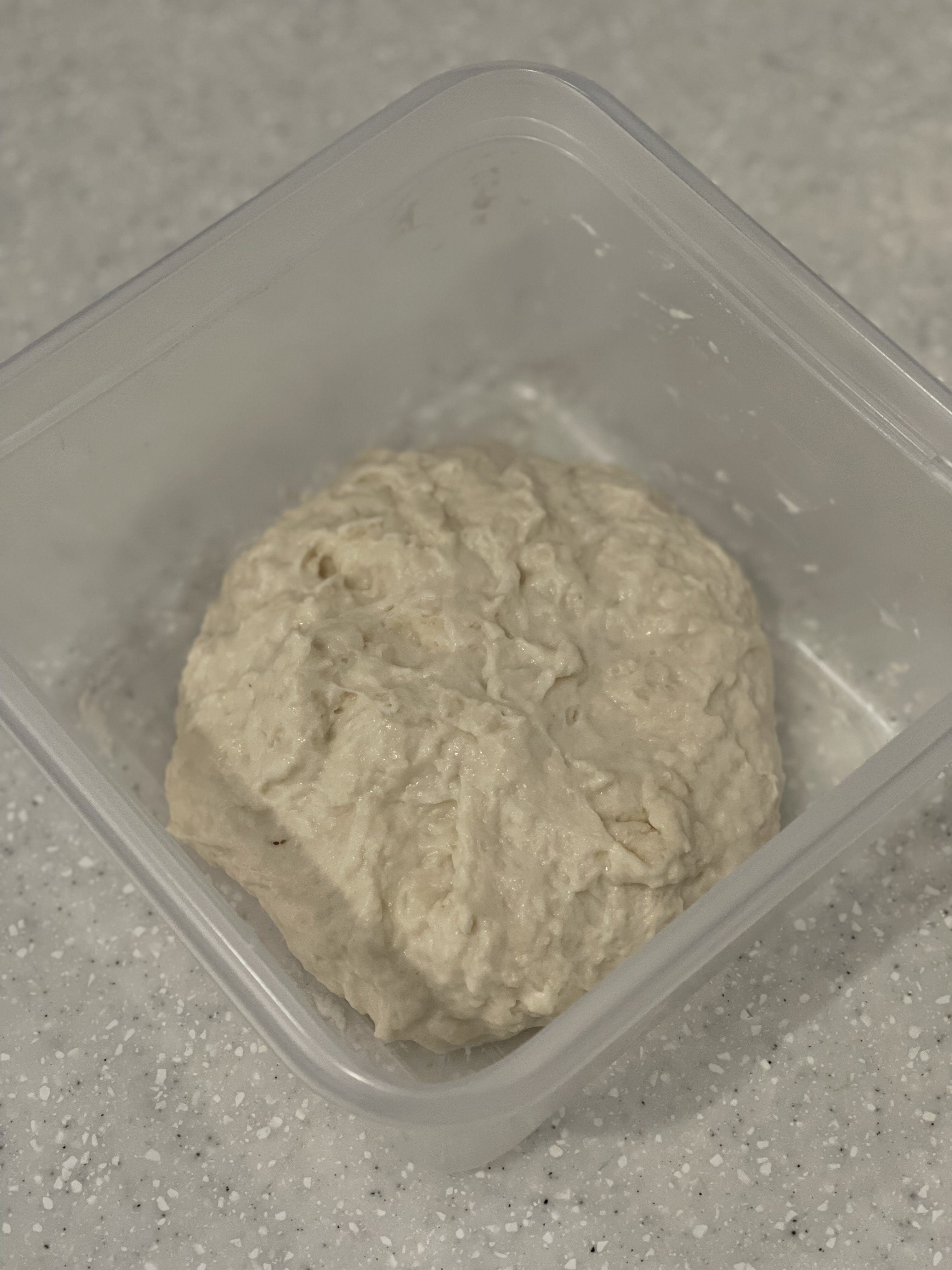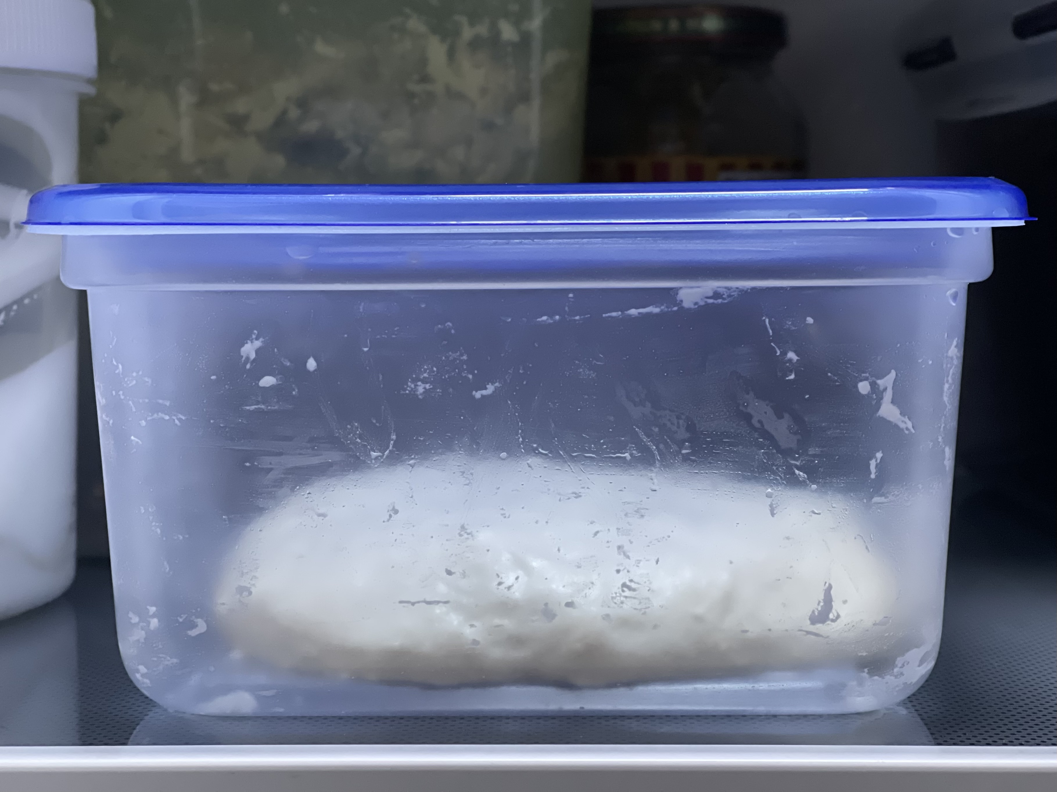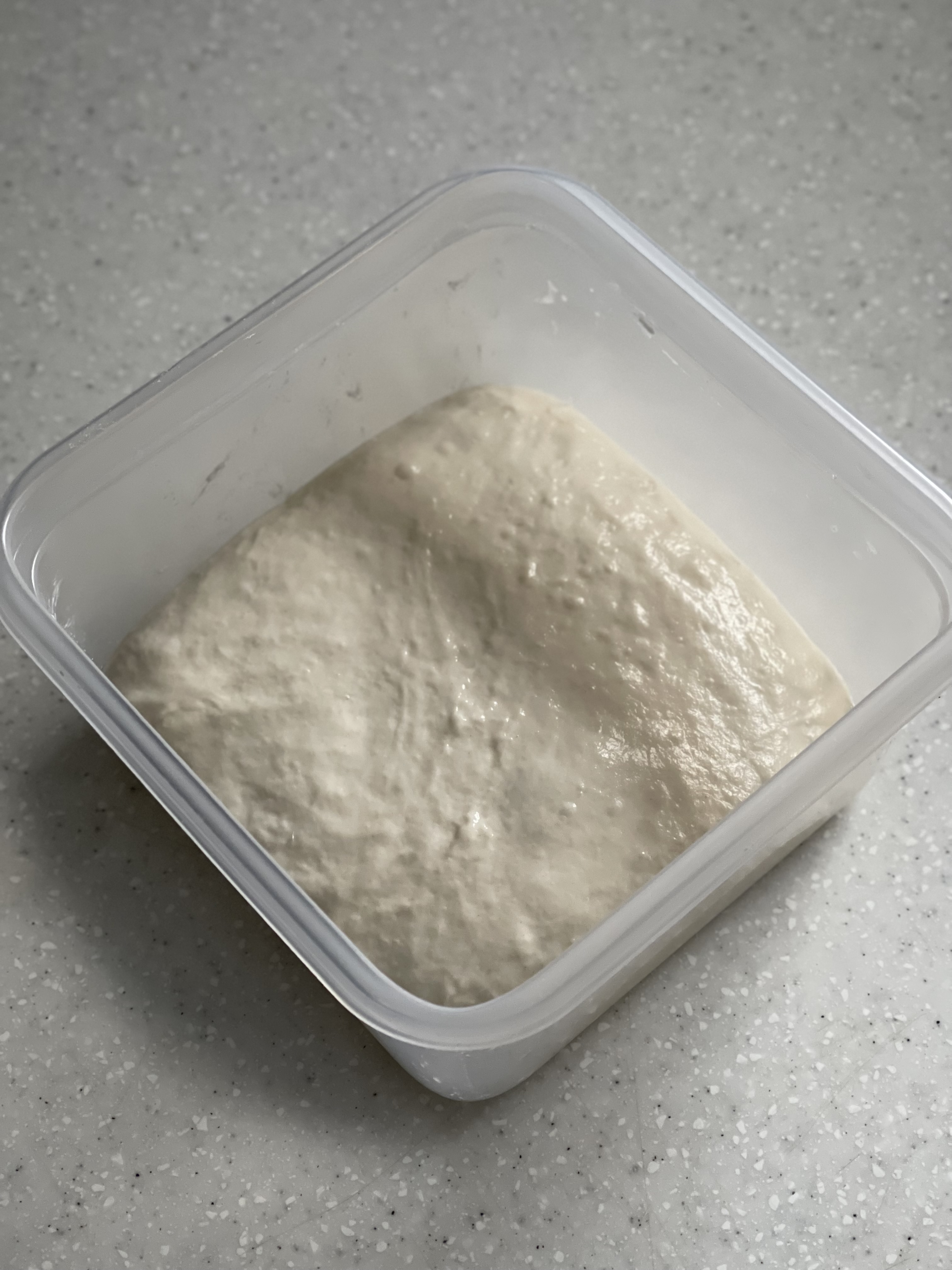 냉장고에서 약 16시간 발효. 역시 반죽량 대비 용기가 커서 발효 크기를 확인하긴 조금 어려웠다.
