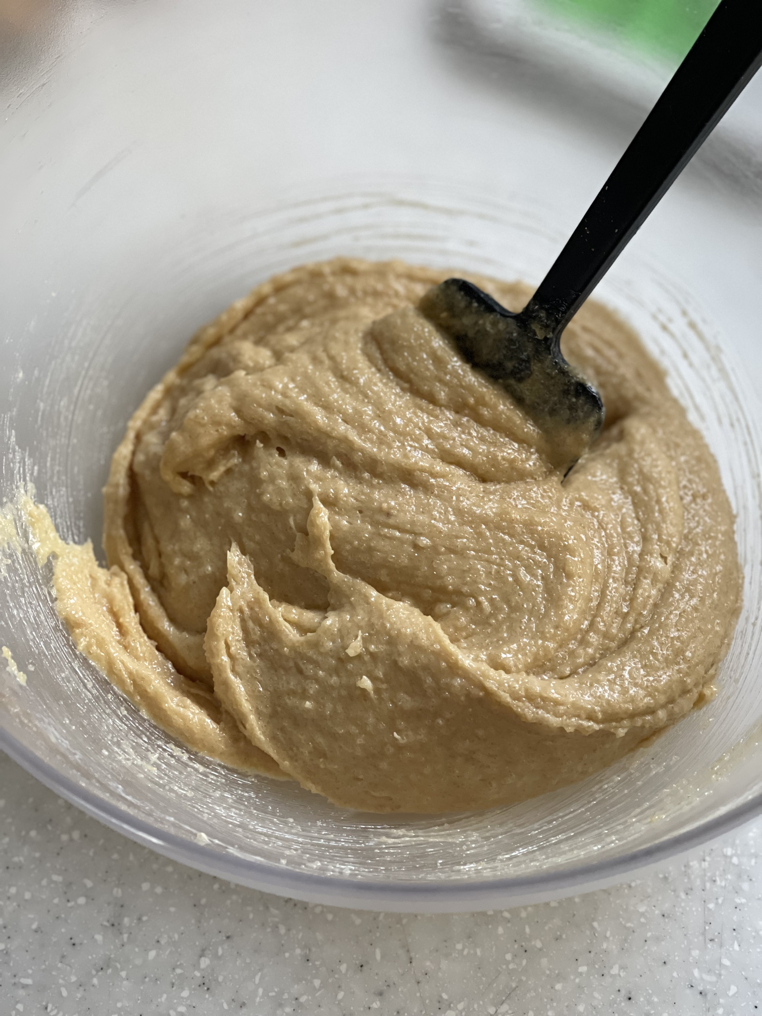 여기에 실온화한 계란과 우유를 넣어 섞고, 체친 가루류와 땅콩 분태를 넣어 반죽을 마무리했다.
