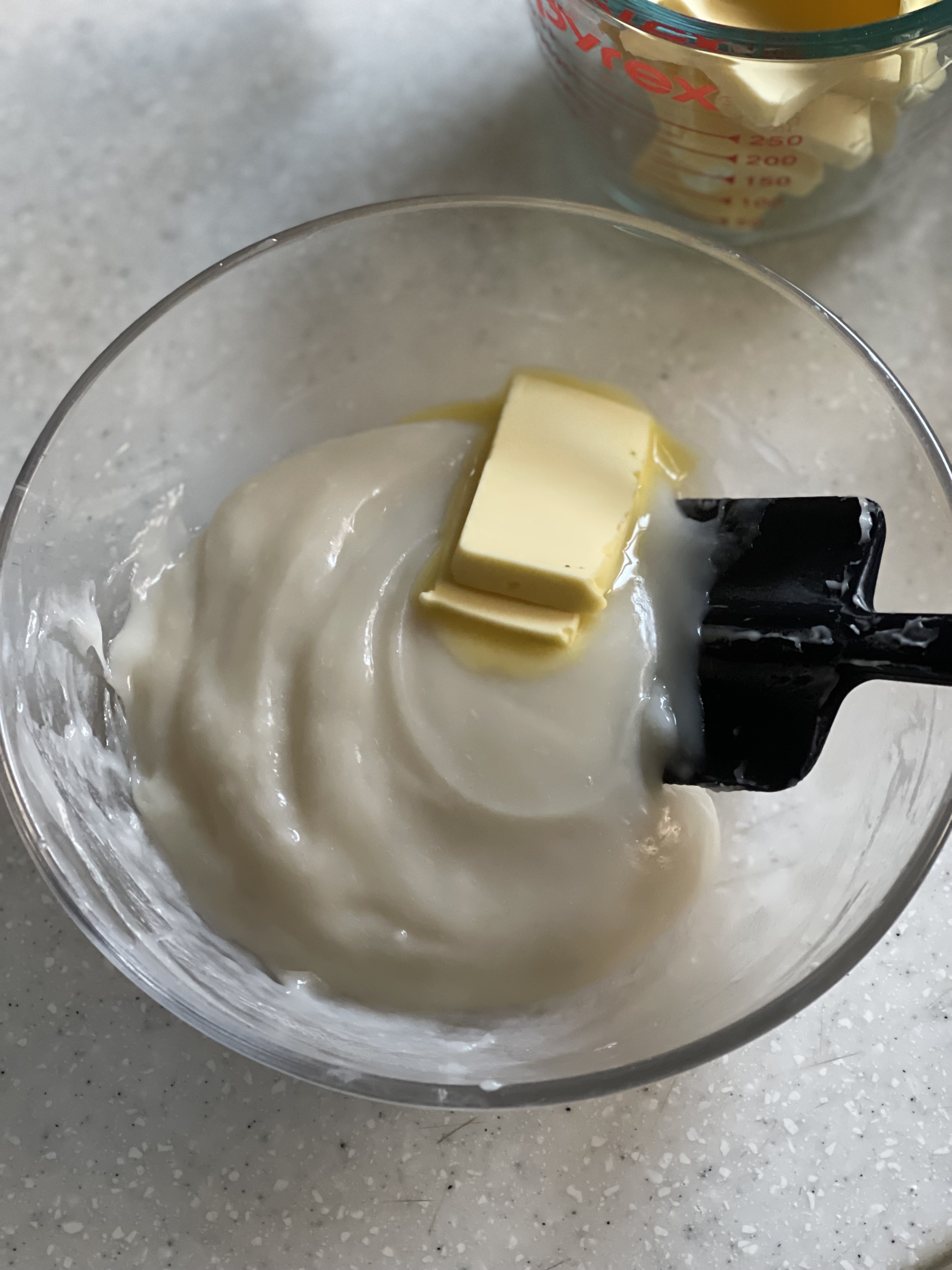 전자레인지에 녹인 버터(40도)에 설탕과 소금을 넣고 휘핑기로 섞은 뒤, 실온 상태의 계란을 넣어 다시 섞었다.