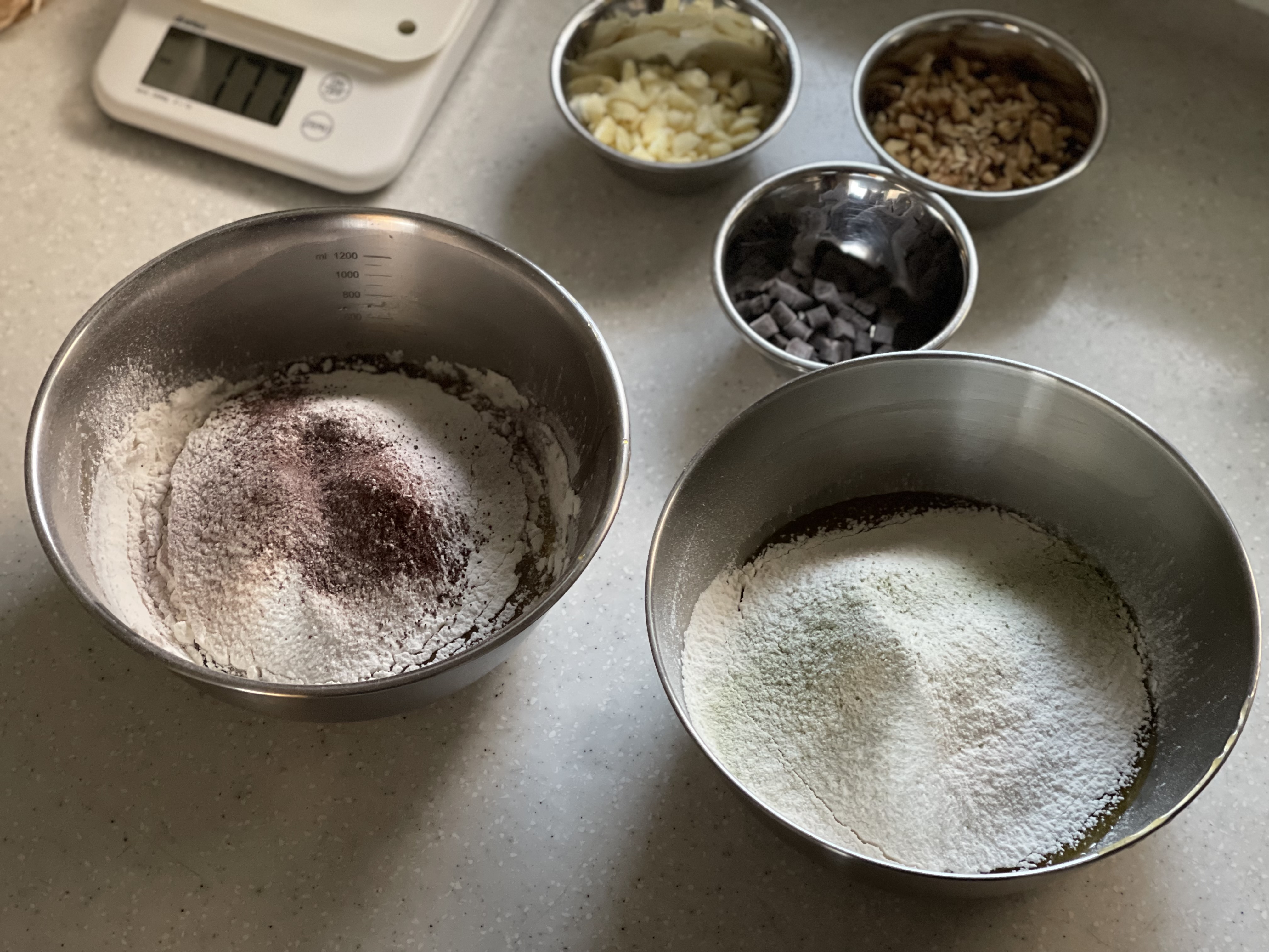 가루류는 초코와 말차를 각각 계량했고, 쿠키 반죽의 버터·설탕·계란은 한 번에 만들어 163g씩 나눠 담은 뒤 각각의 가루를 체쳐 넣었다.
