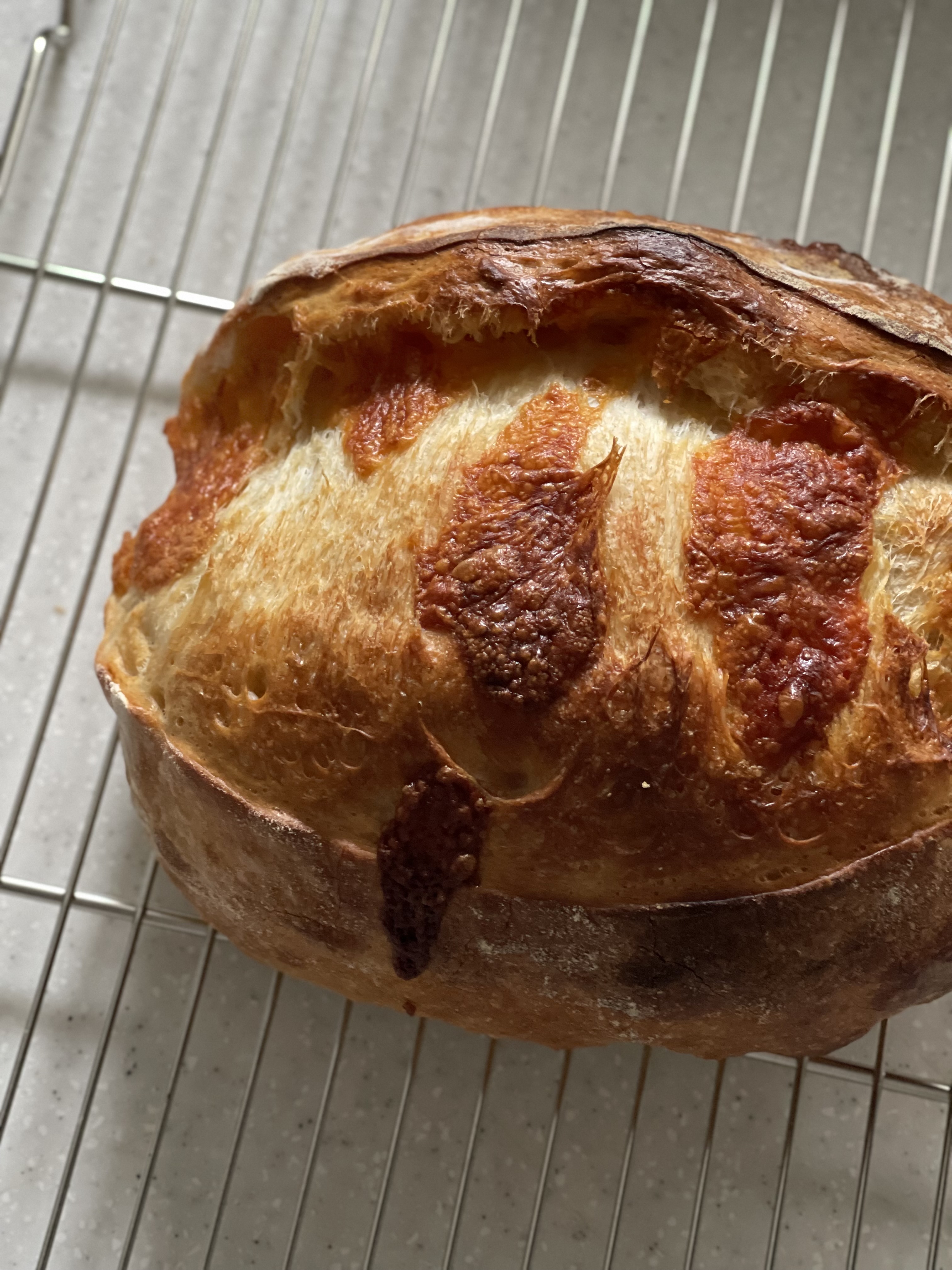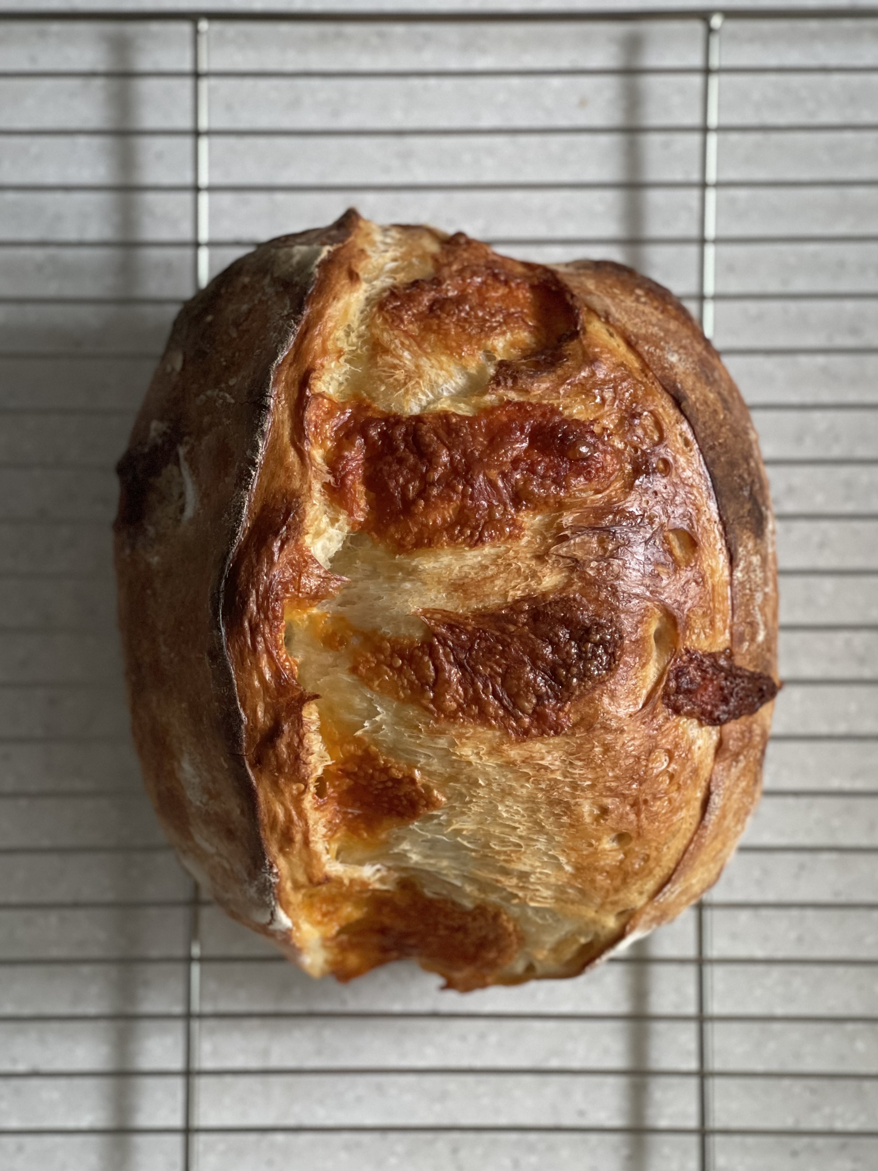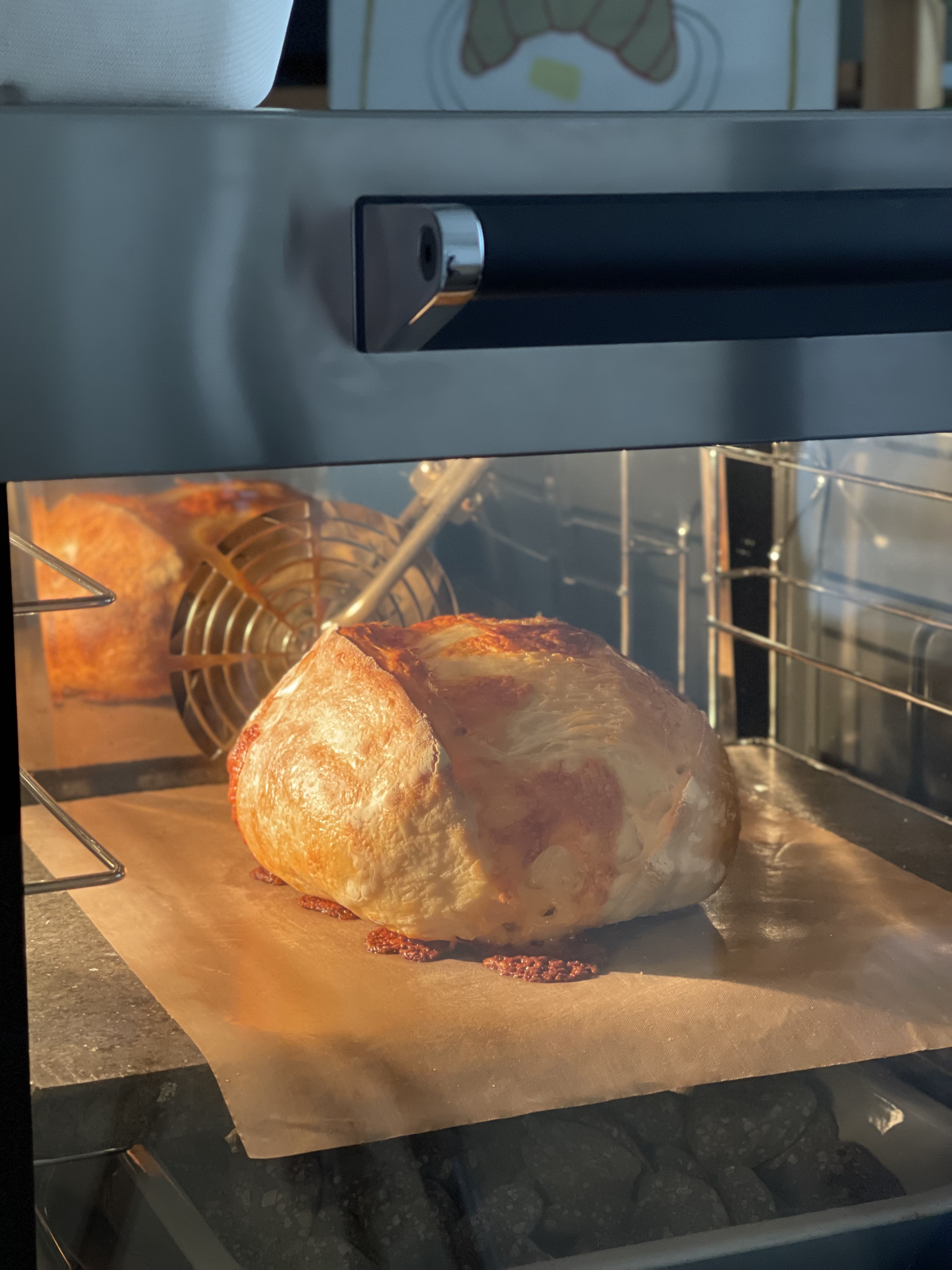 250도에서 10분간 스팀으로 굽고, 문을 열어 스팀을 뺀 뒤 230도에서 15분 더 구웠다. 이후 오븐을 끄고 5분간 그대로 두었다.