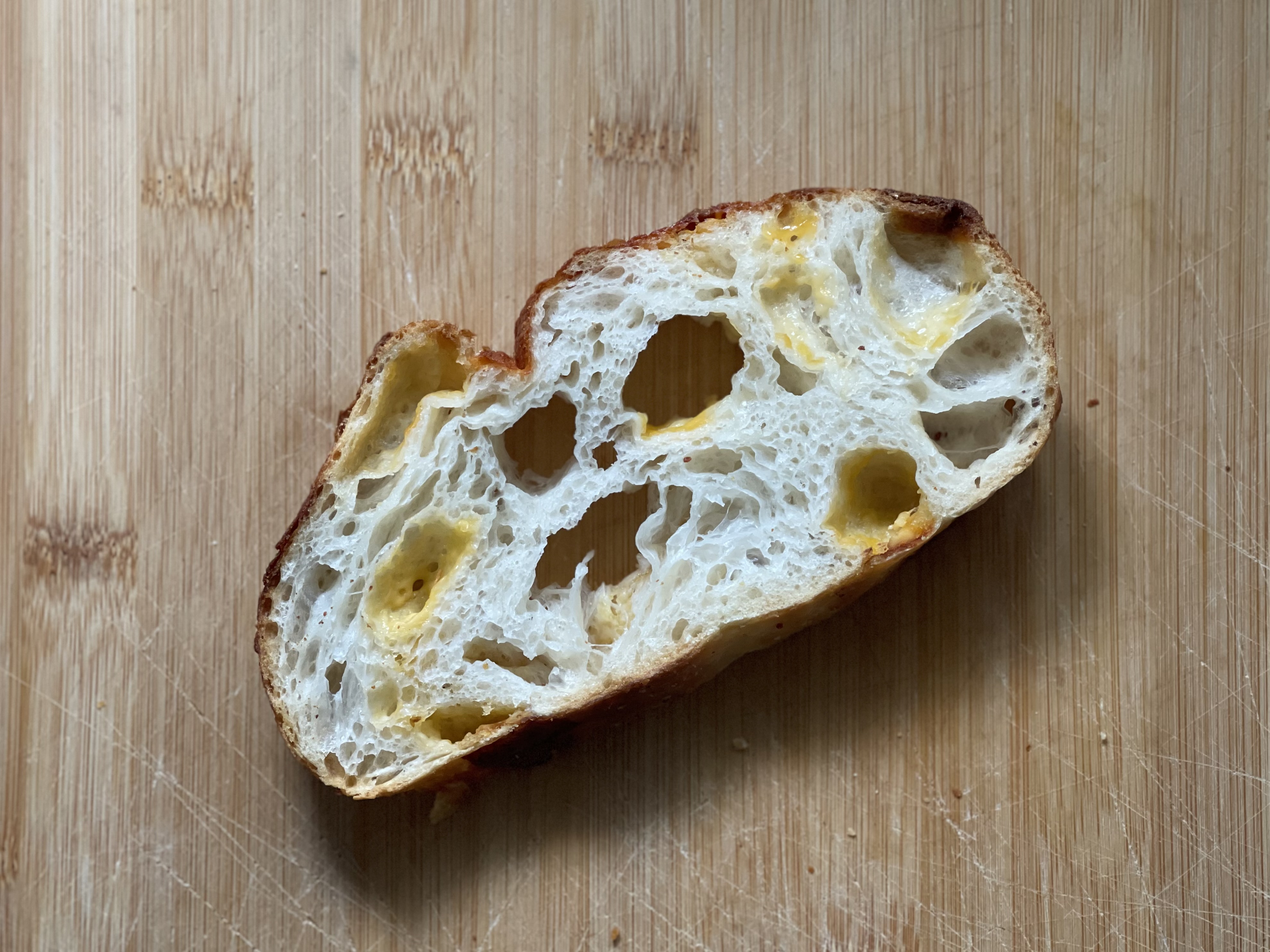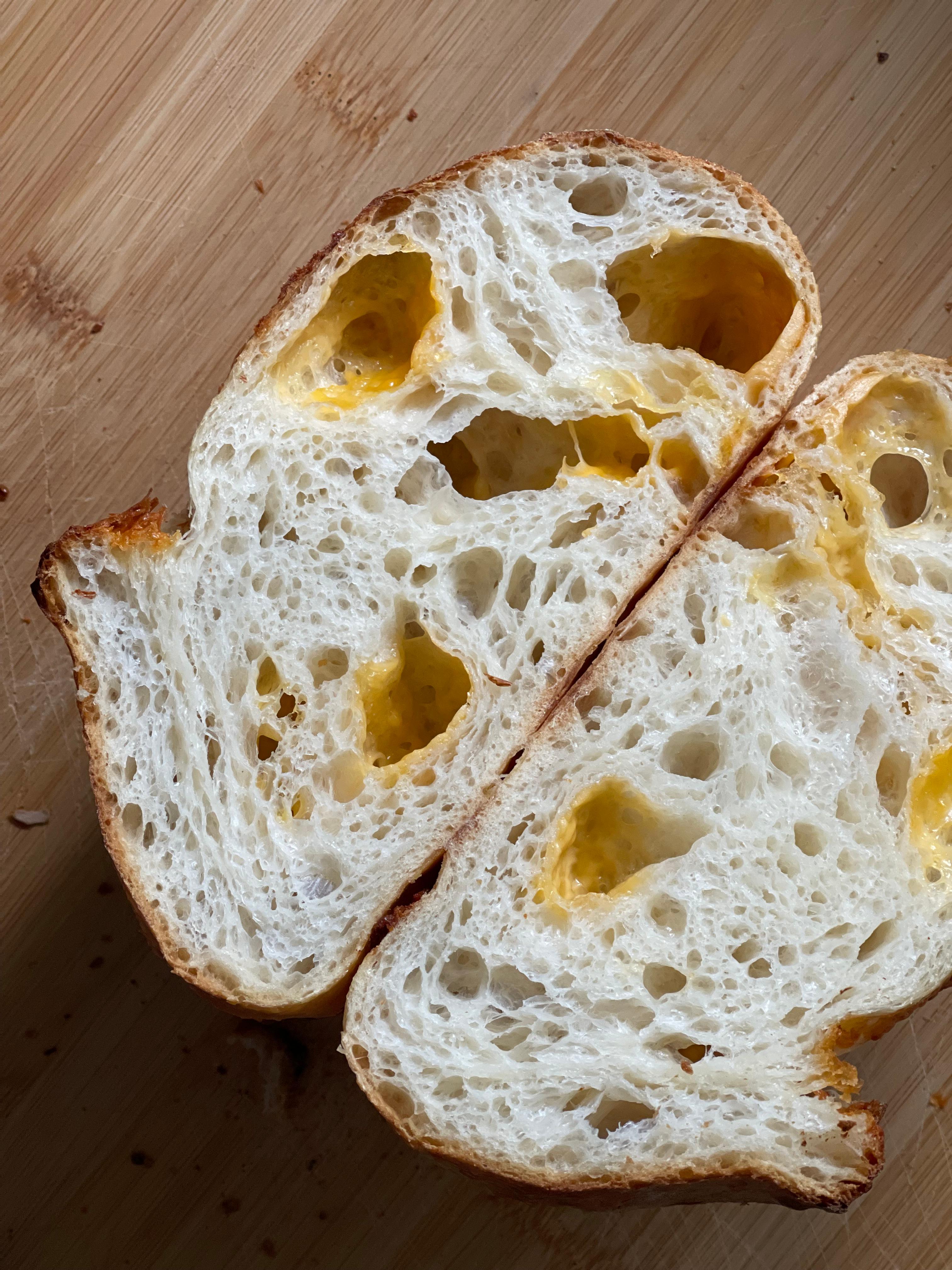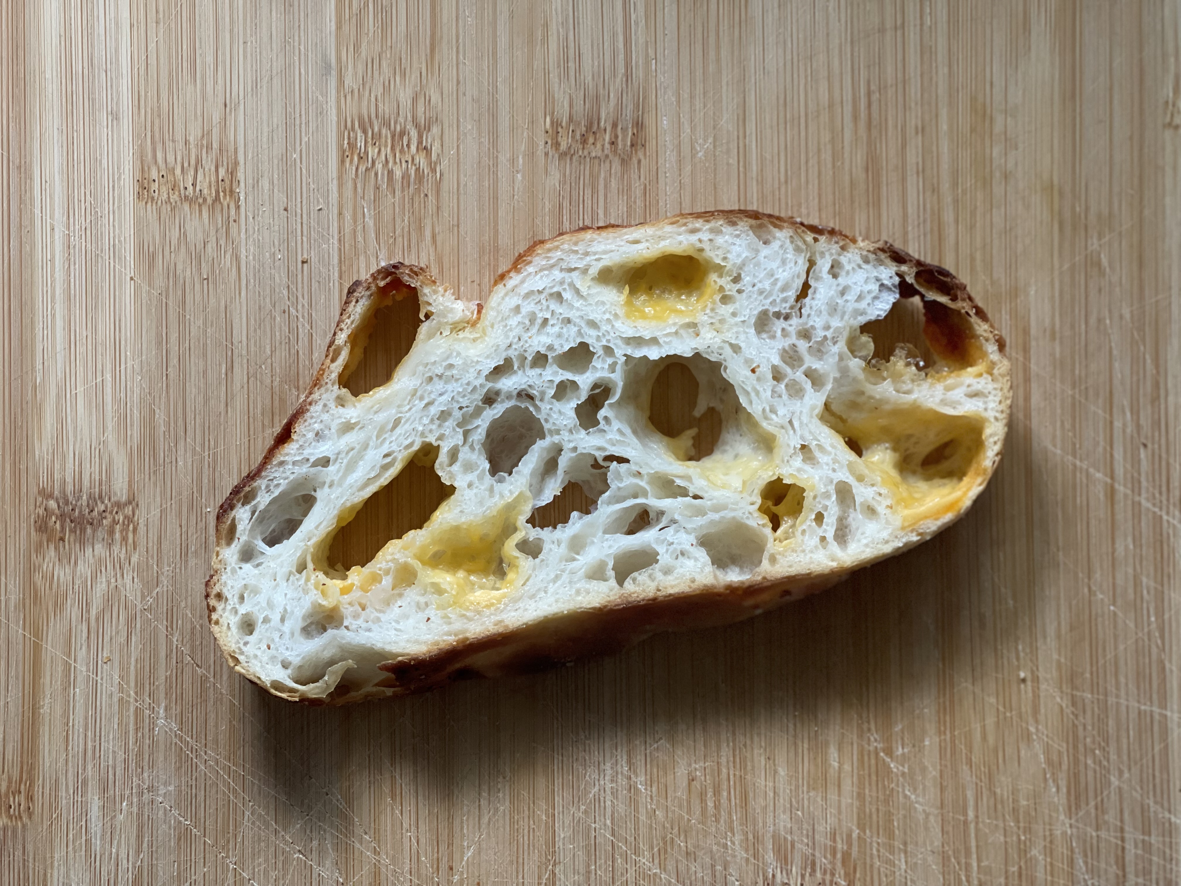 완성된 치즈 깜빠뉴는 크럼이 정말 부드러워서 썰기가 어려웠다.