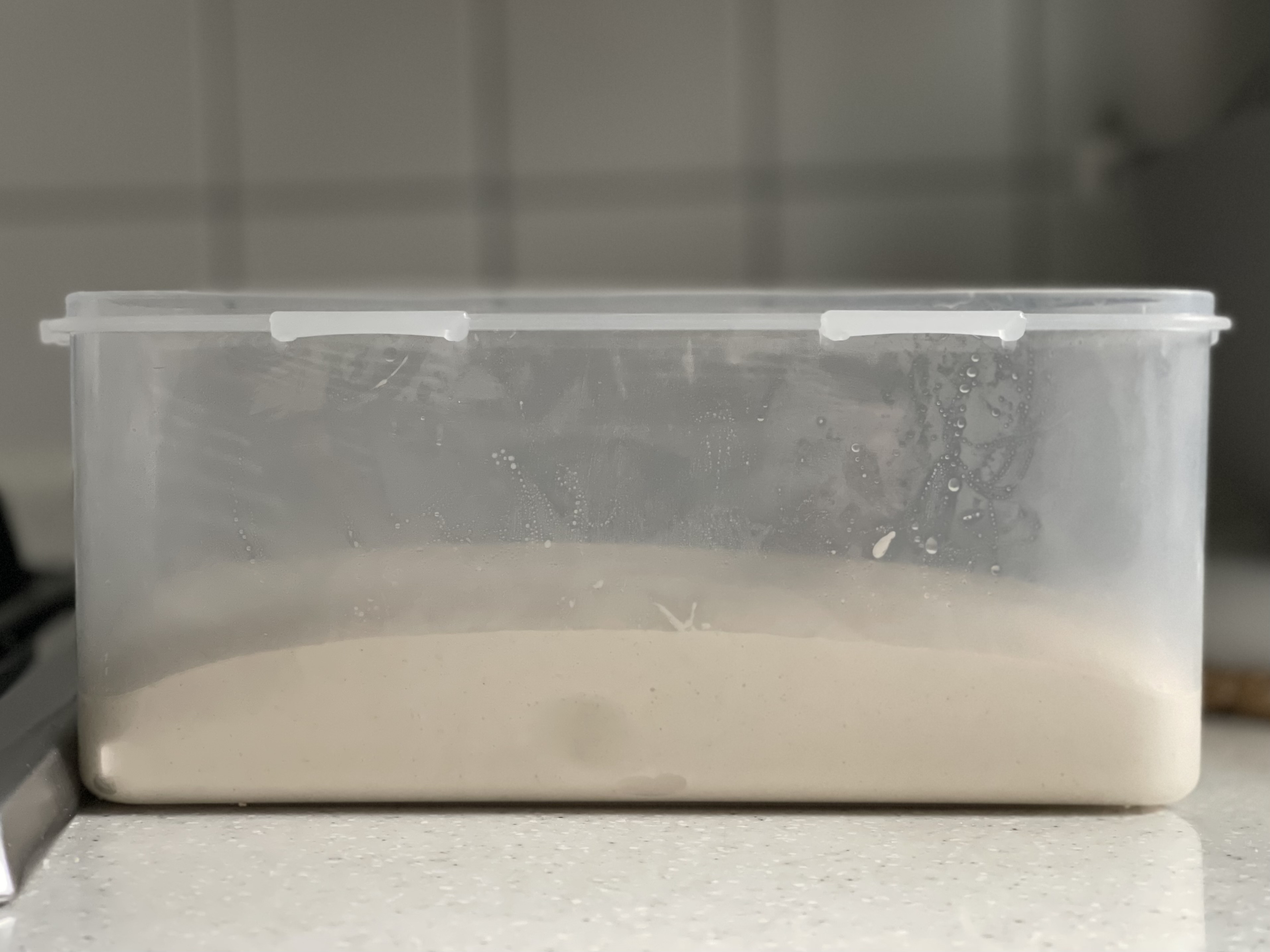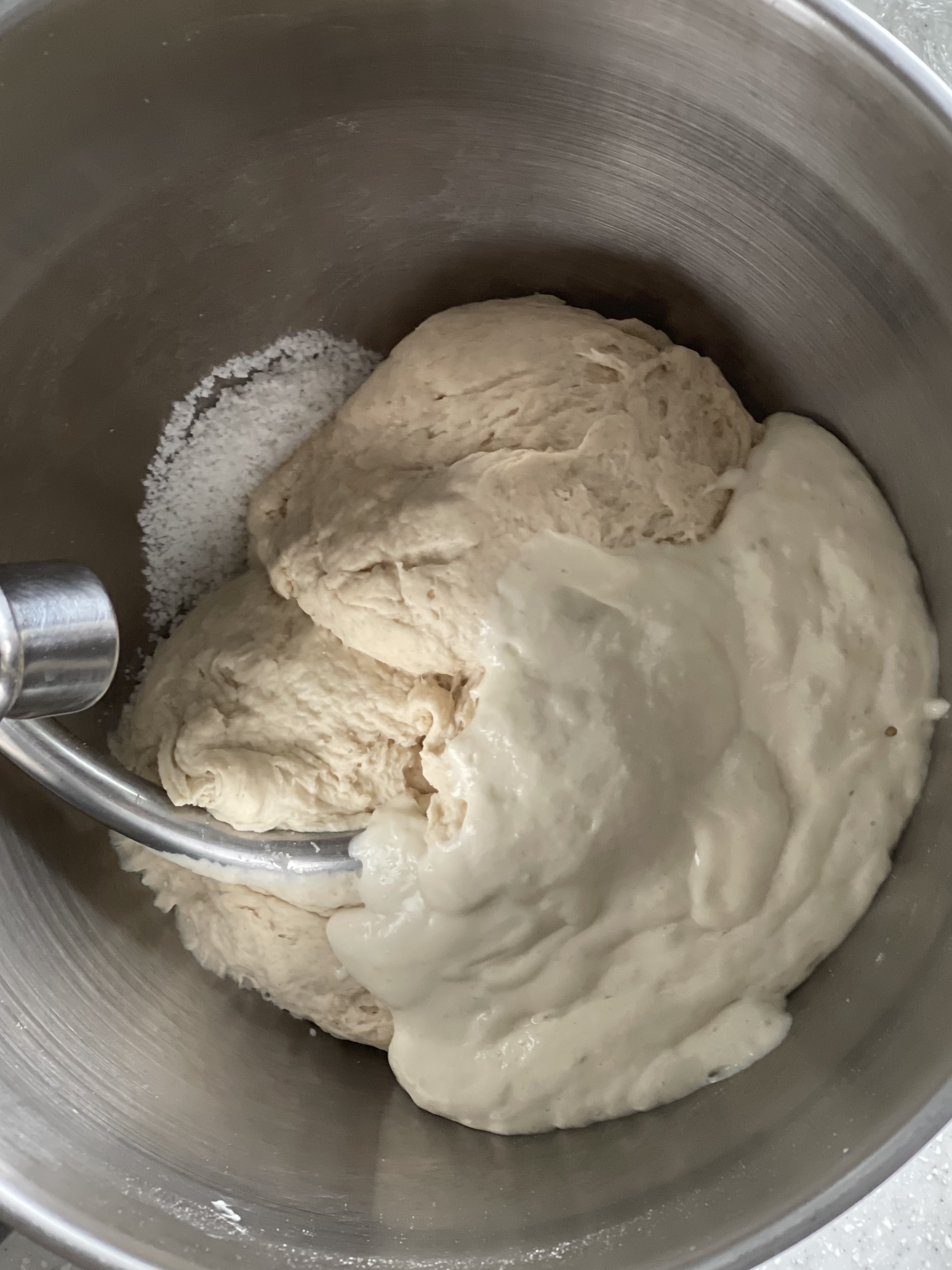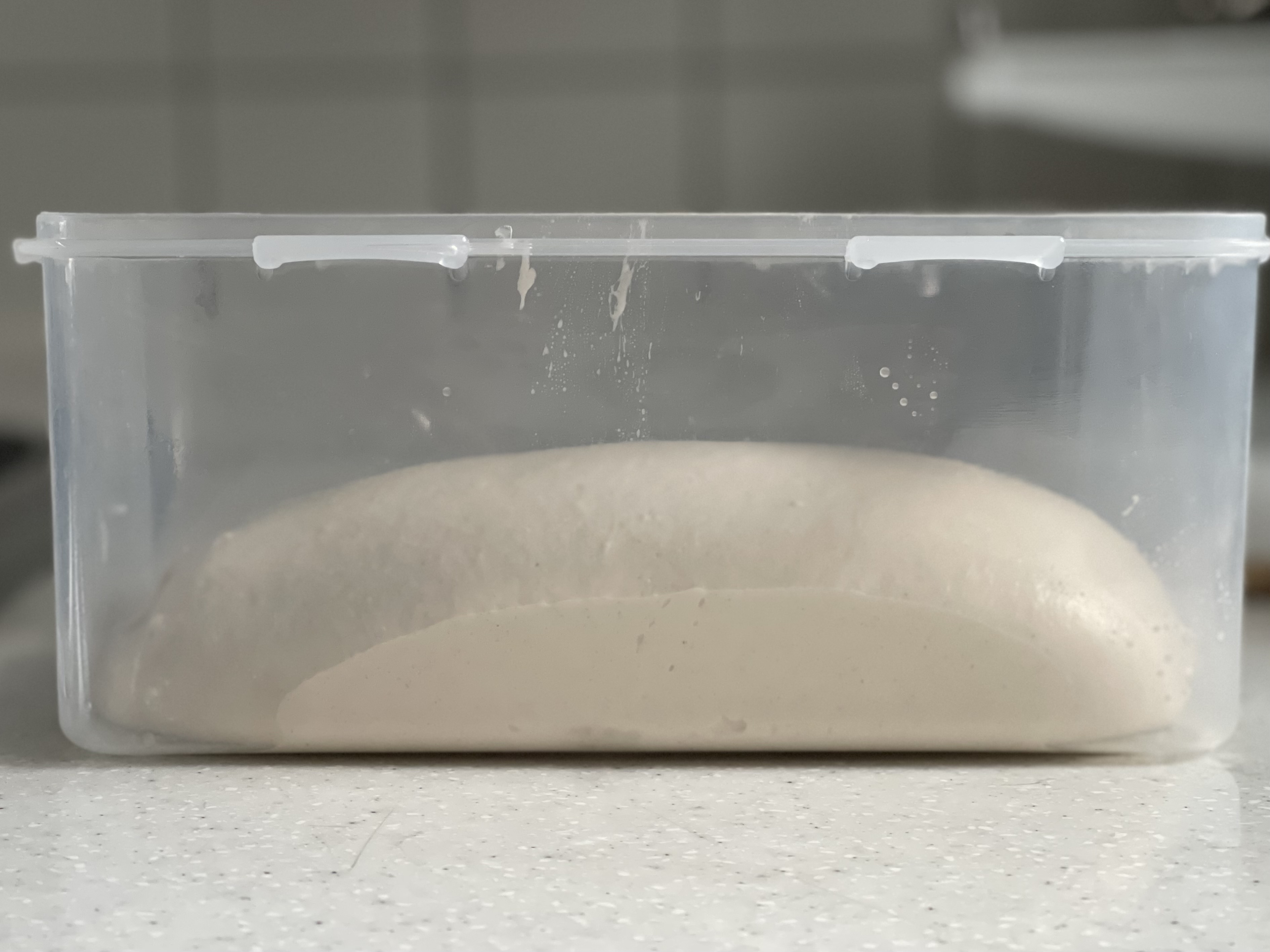 오토리즈와 본반죽 믹싱 후, 실온에서 1시간 1차 발효. 이후 냉장고에 넣고 총 18시간 냉장 휴지했다.