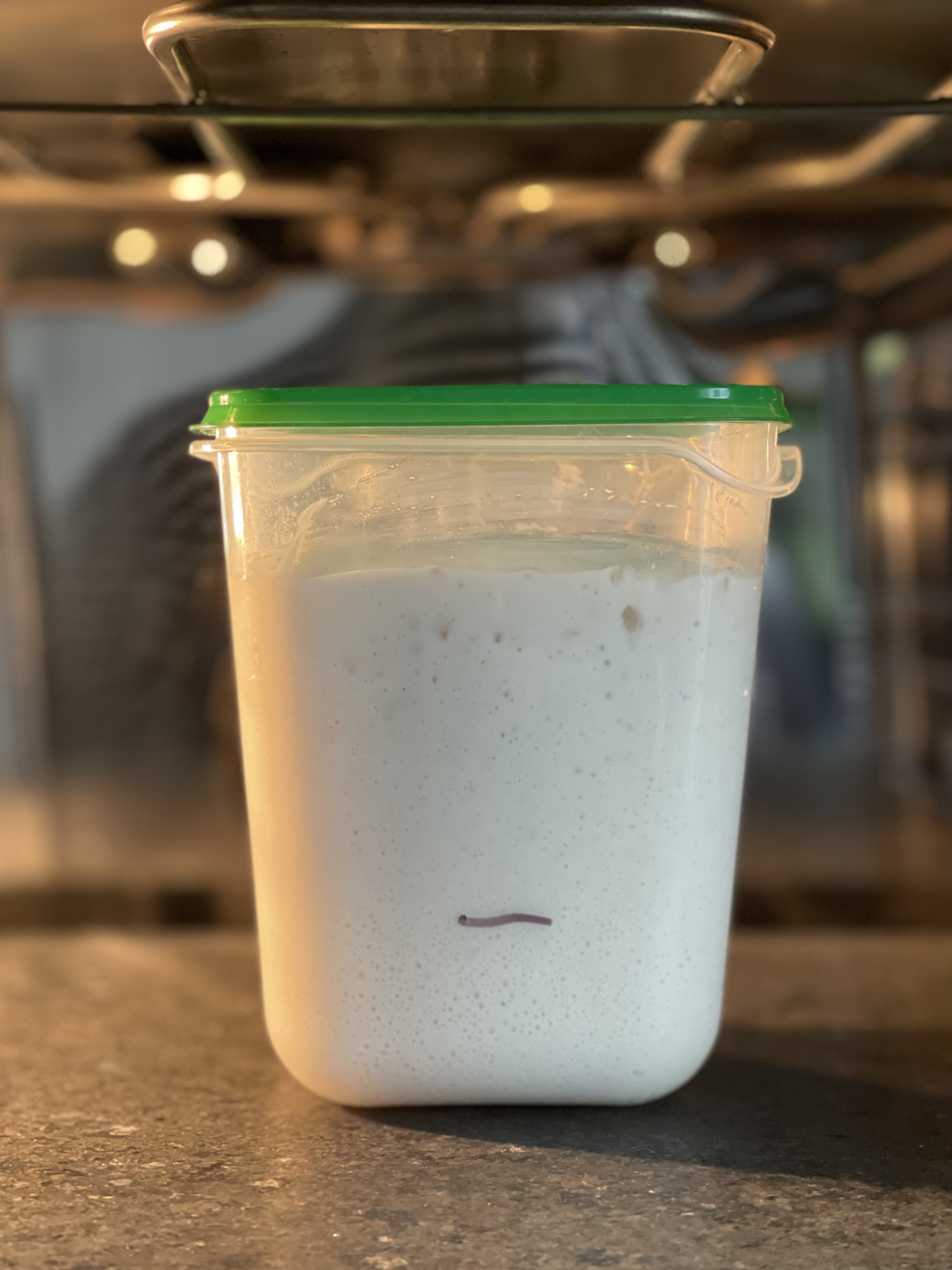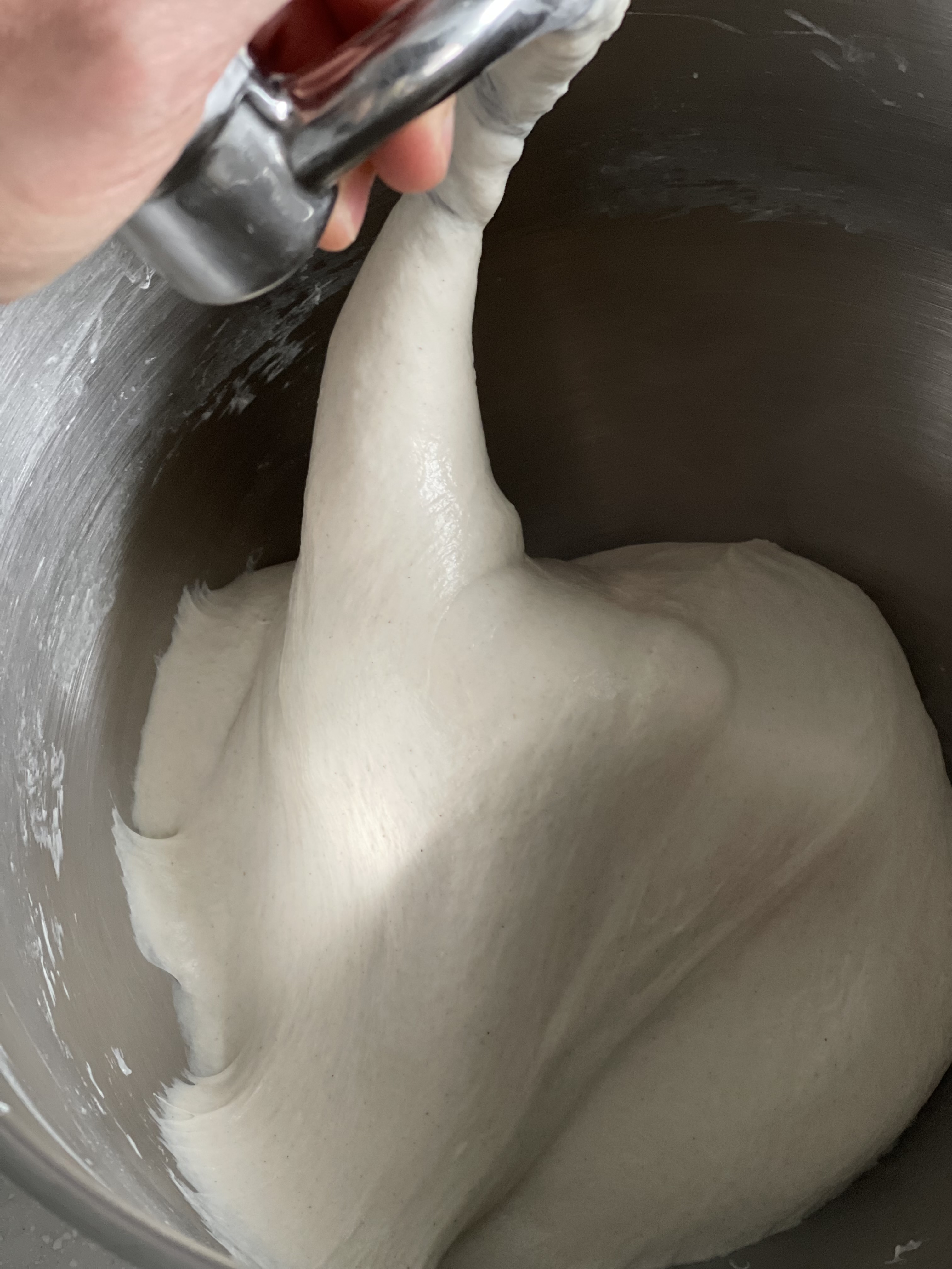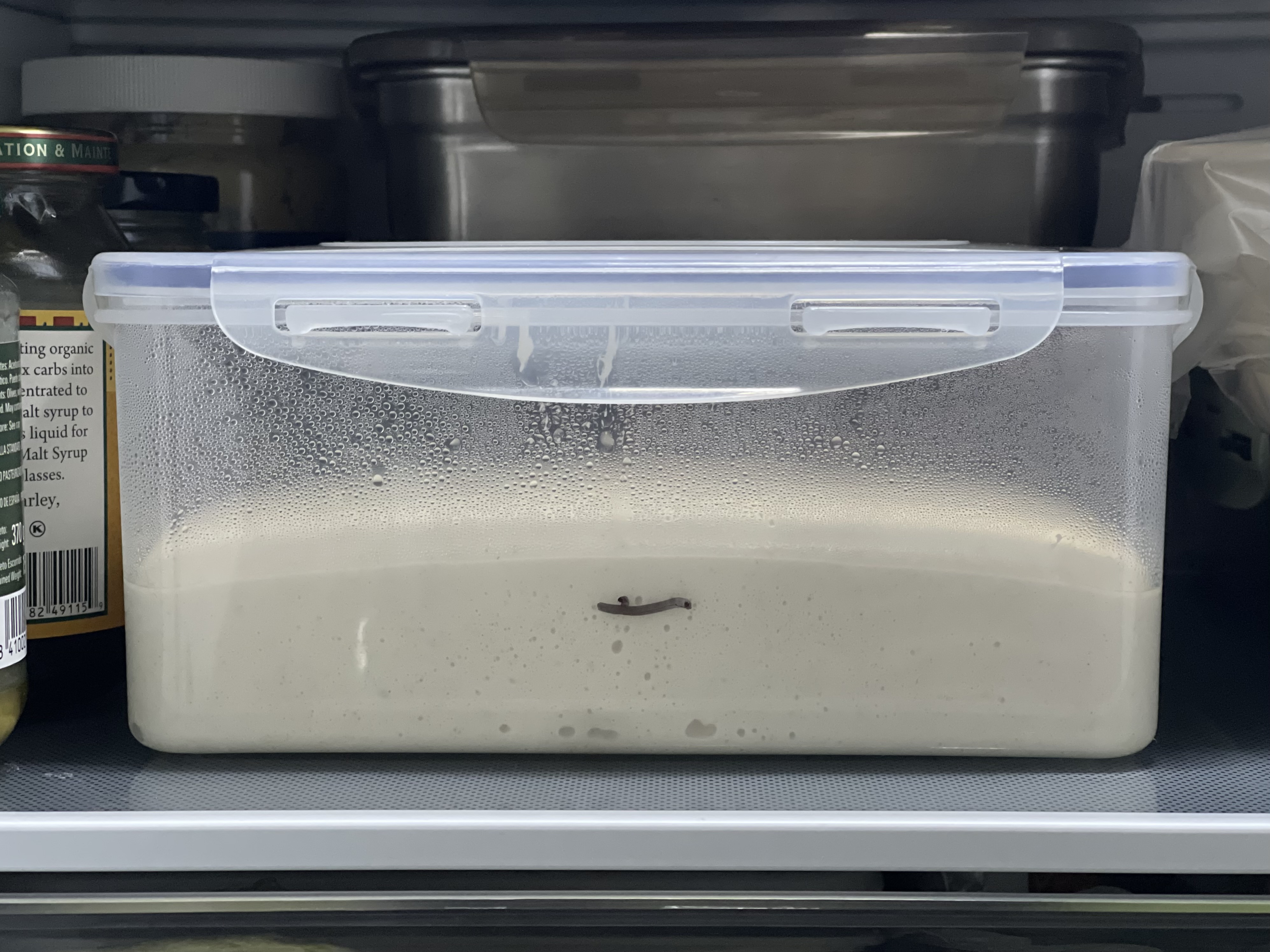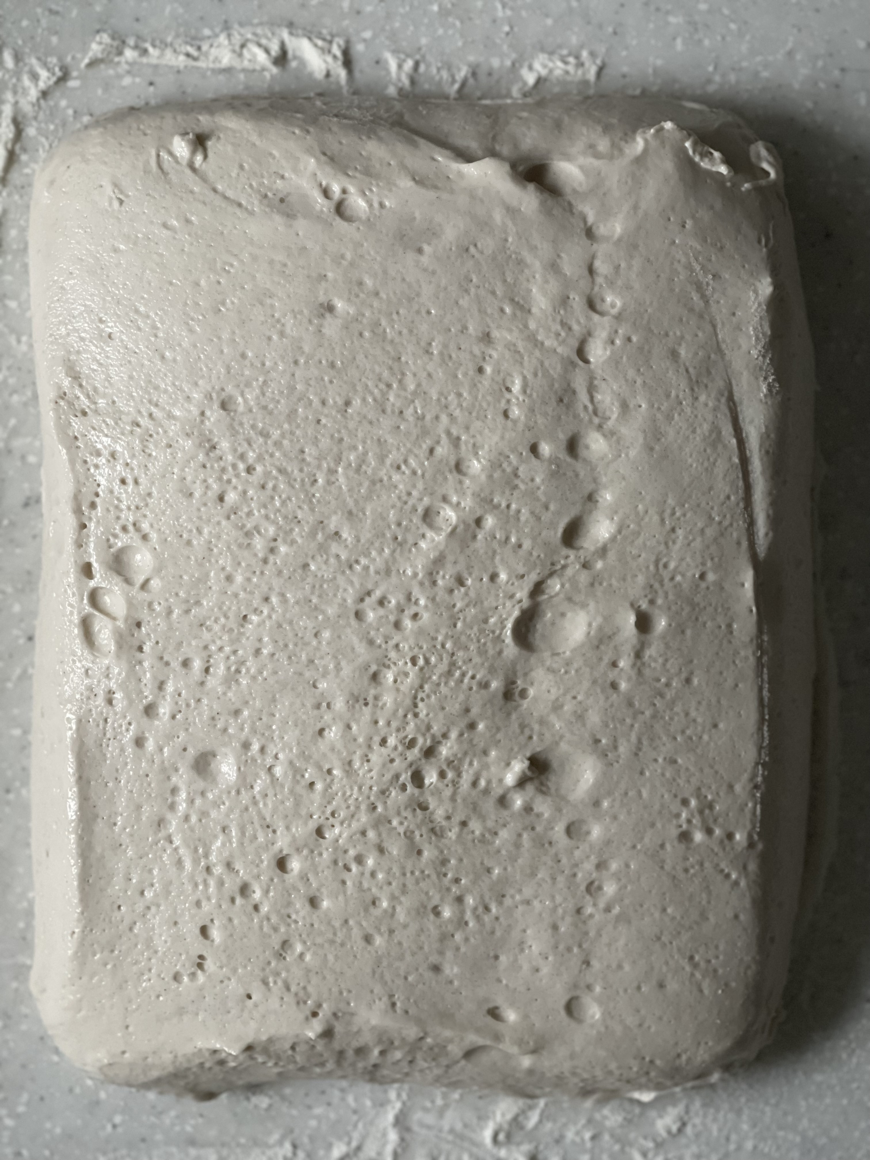 오토리즈와 본반죽 믹싱 후, 실온에서 1시간 1차 발효. 이후 냉장고에 넣고 총 18시간 냉장 휴지했다.