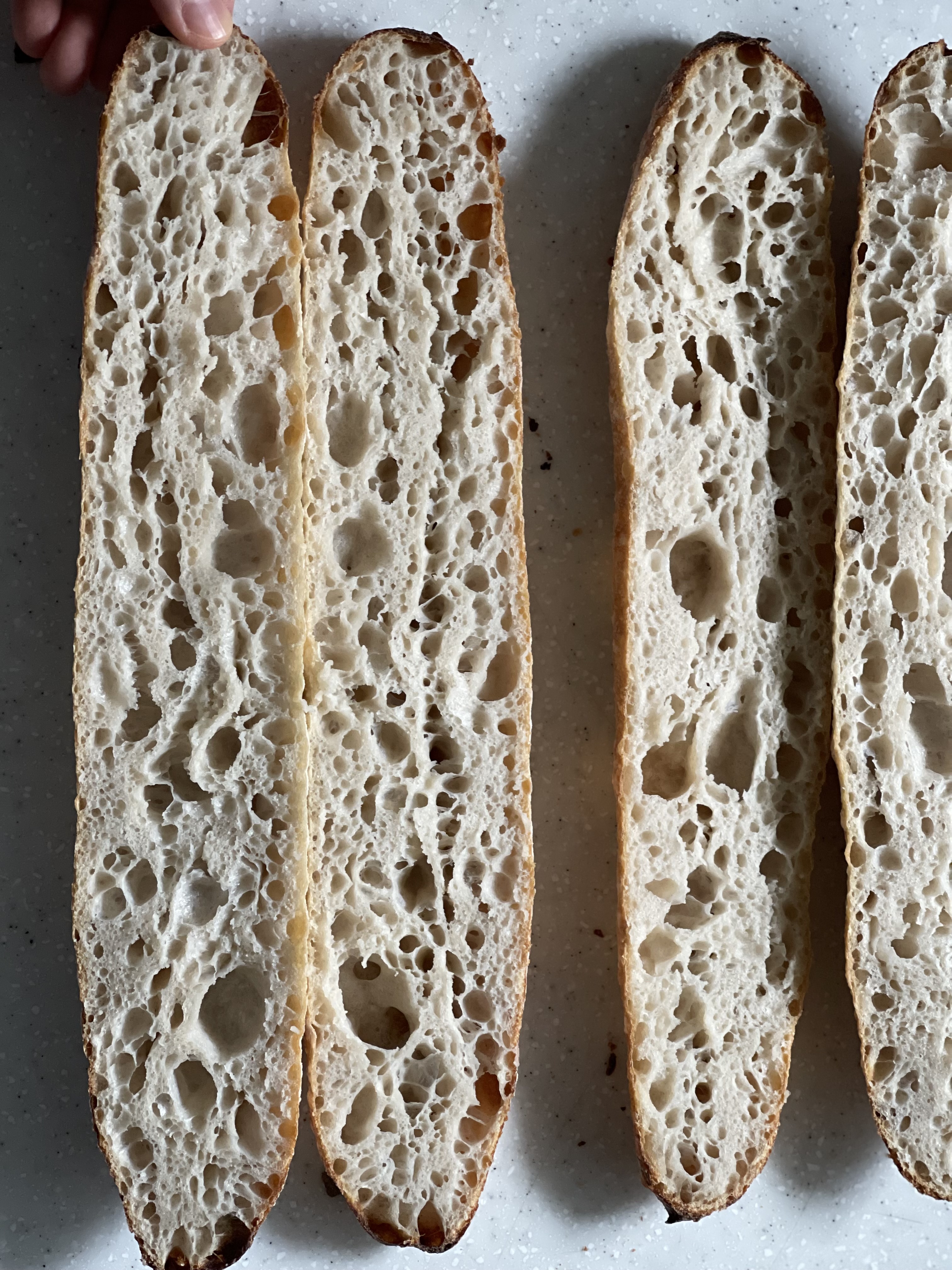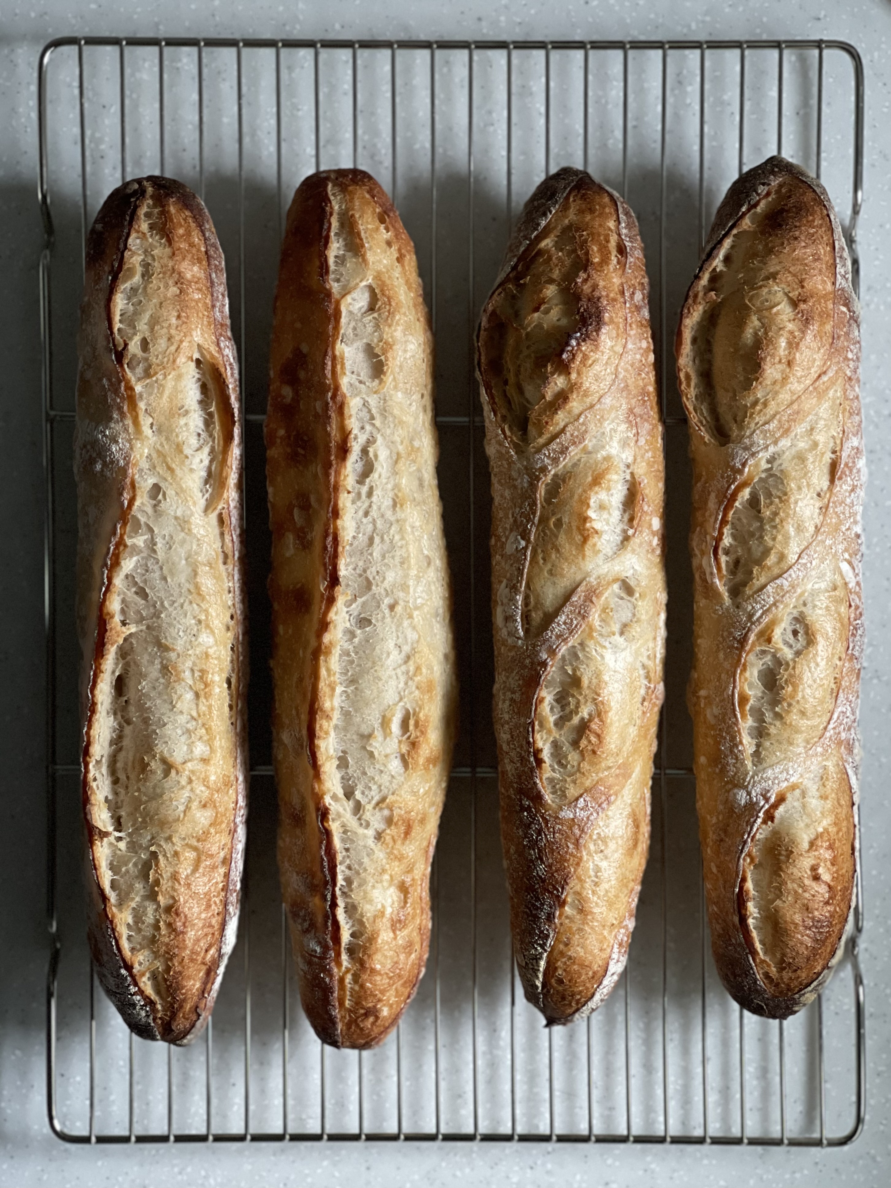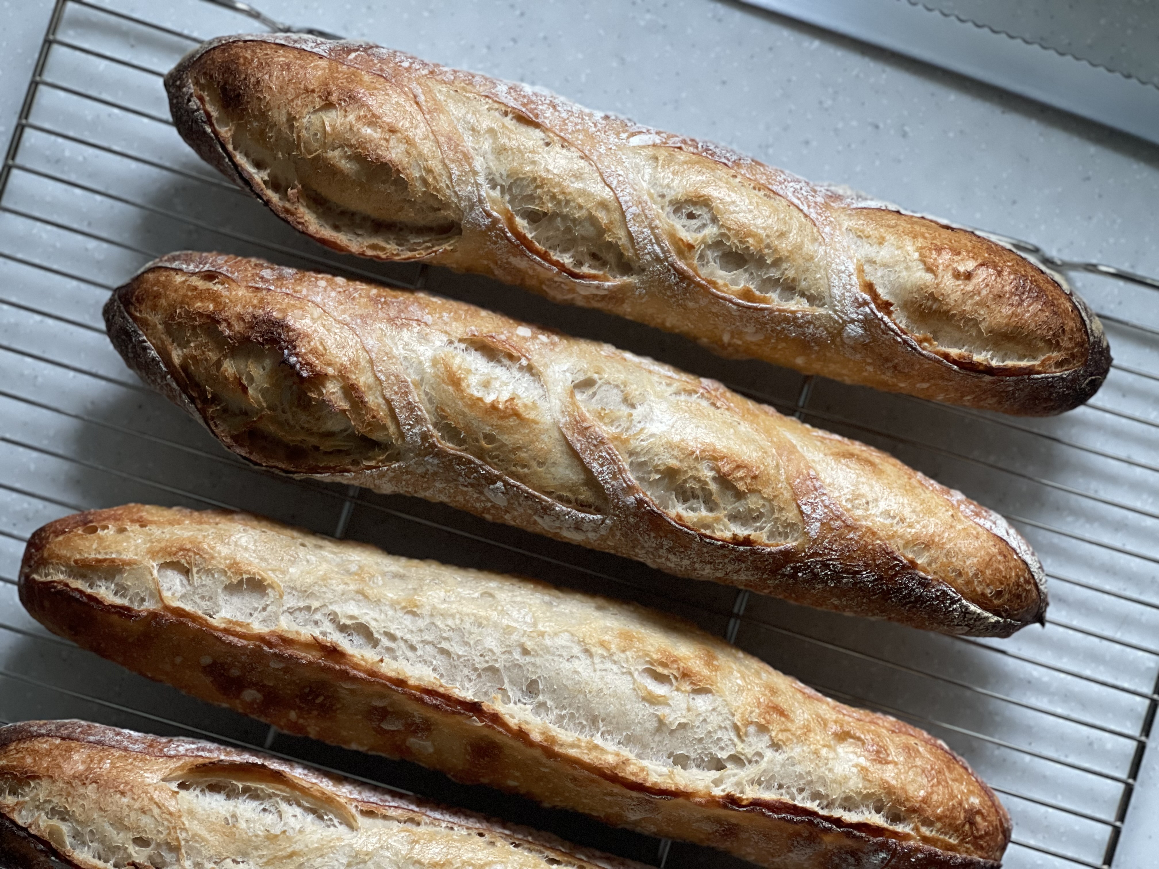 역시 열선과 가까운 윗층에서 구운 바게트가, 구움색도 오븐스프링도 더 잘 나왔다. 사선쿠프를 조금 더 깊고 일정한 길이로 넣었다면 더 좋았을 것 같다. 일자 쿠프도 중간 중간 들러 붙은게 아쉽다.