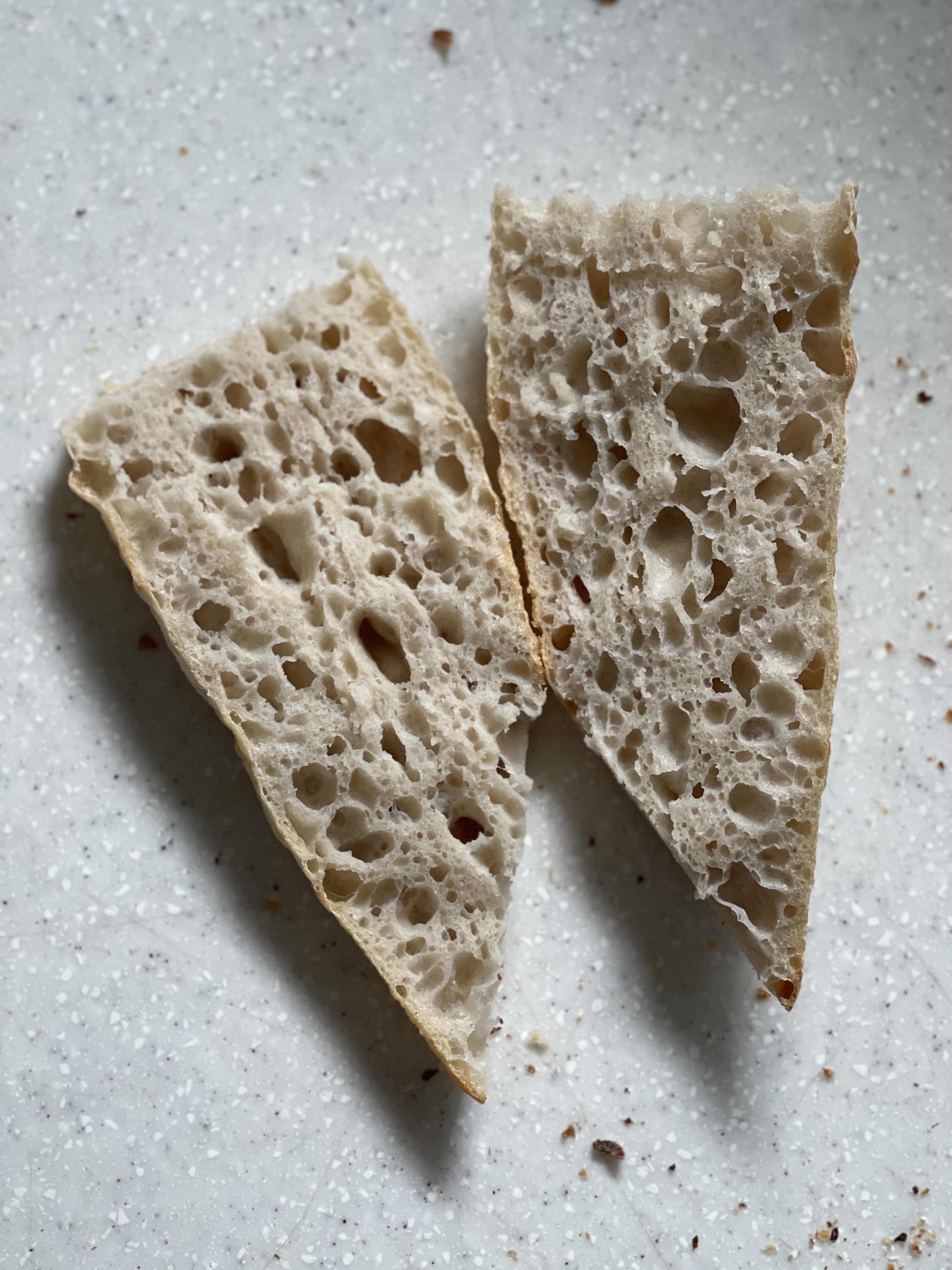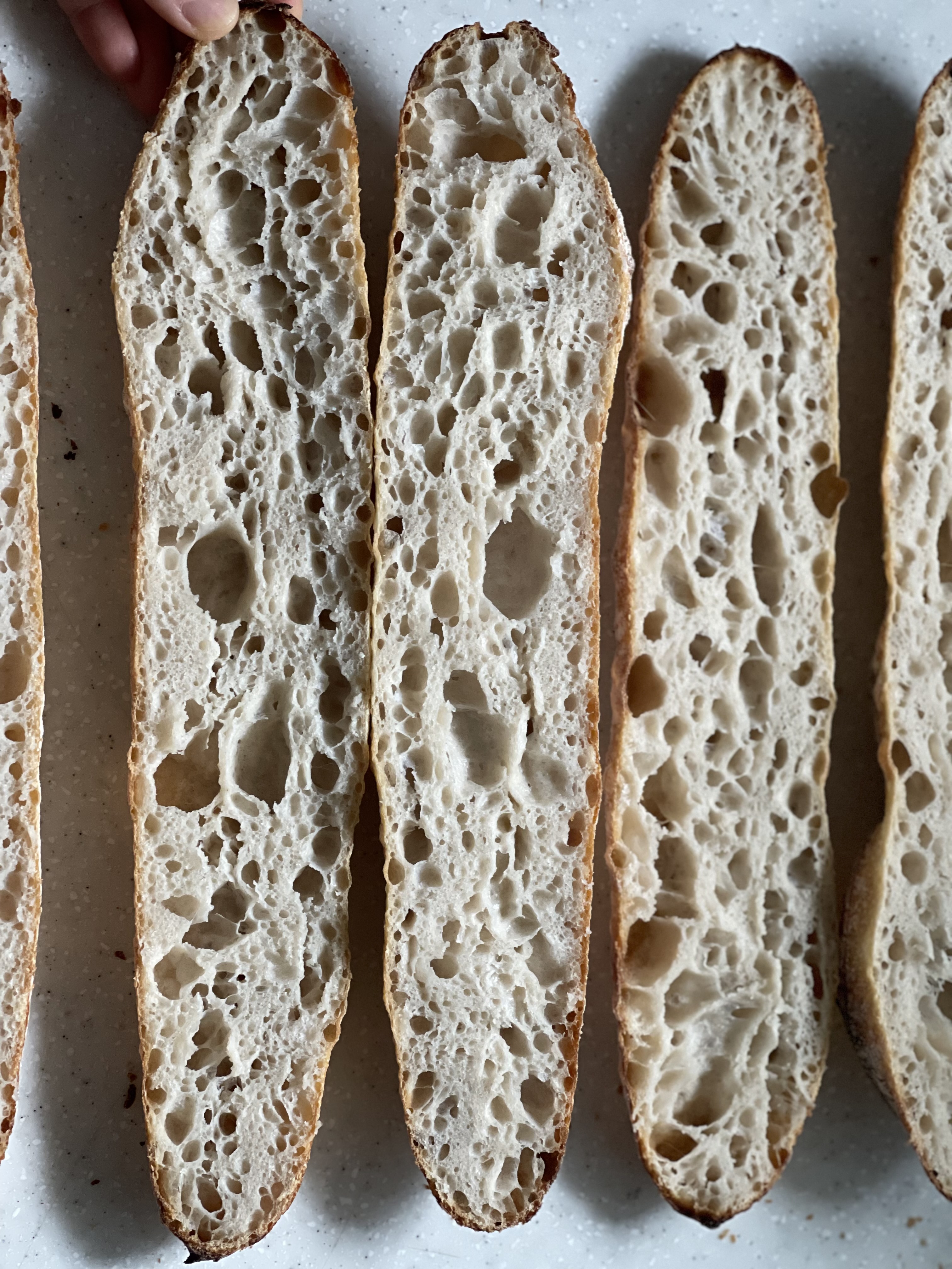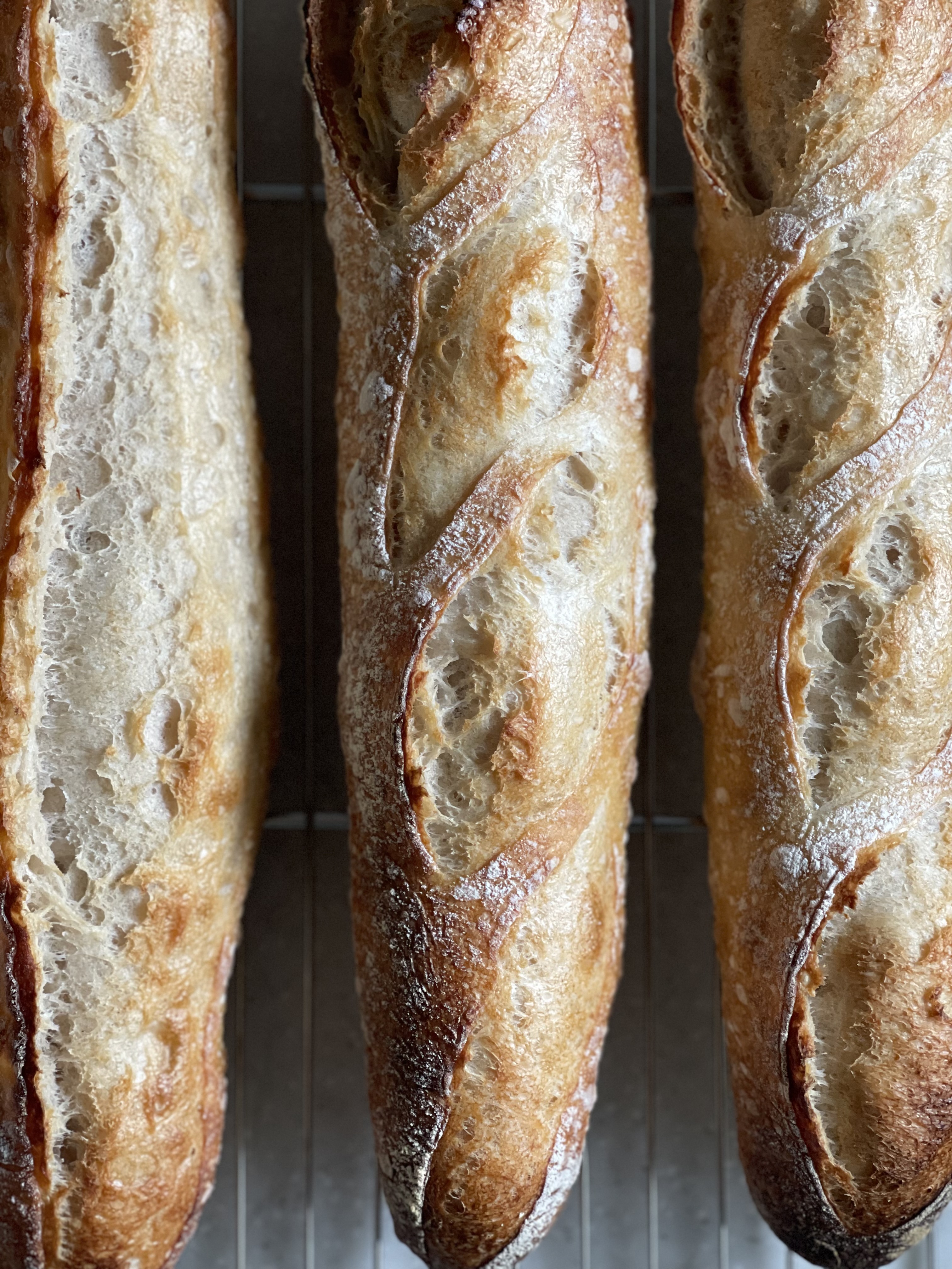 아랫층 돌판은 윗불이 약하고 예열도 충분하지 않아 오븐스프링이 부족했다. 쿠프를 낸 부분도 제대로 벌어지지 않고 들러붙은 채 구워졌고, 한 개는 납작하게 나왔다. 그래도 나쁘지 않은 기공!