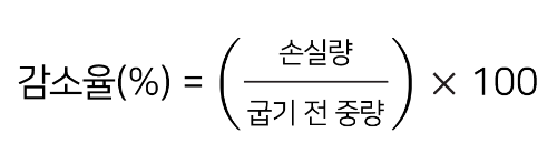 | 굽기 전 중량 | 굽기 후 중량 | 수분 감소율 |