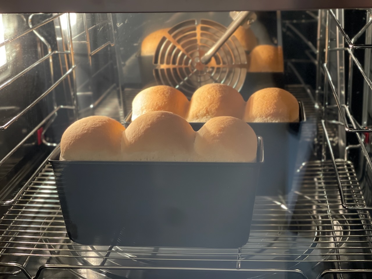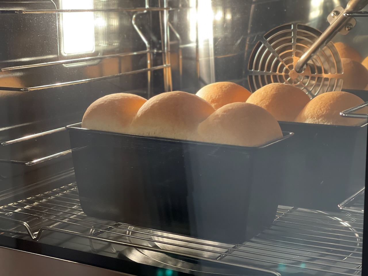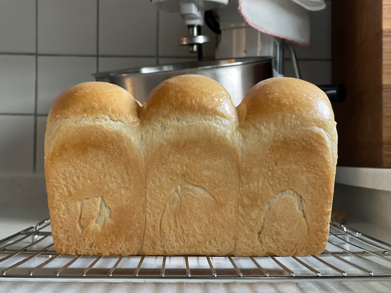 지난번에는 2차 발효가 아쉬웠는데, 이번엔 온도를 잘 맞춰서 반죽이 틀 높이보다 더 크게 부풀어 올랐다.