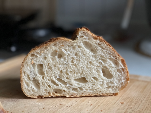 30분 이상 식히고 잘라봤는데, 크러스트가 너무 얇아서 슬라이스로 예쁘게 썰기가 어려웠다. 요즘 빠져있는 통밀 바게트의 풍미와 비교하면 구수함은 아쉽지만, 촉촉하고 부드러운 사워도우라서 어디에도 잘 어울릴 것 같다. 구멍이 많아 샌드위치 소스가 빠져나가는게 단점이라면 단점일까.😅