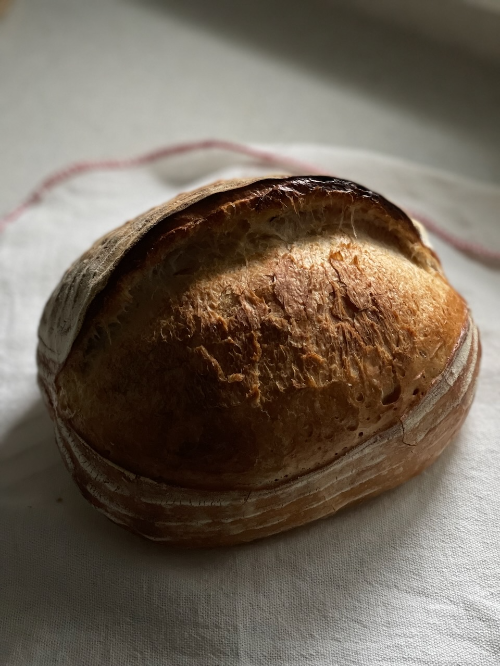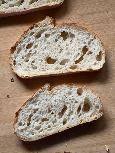 30분 이상 식히고 잘라봤는데, 크러스트가 너무 얇아서 슬라이스로 예쁘게 썰기가 어려웠다. 요즘 빠져있는 통밀 바게트의 풍미와 비교하면 구수함은 아쉽지만, 촉촉하고 부드러운 사워도우라서 어디에도 잘 어울릴 것 같다. 구멍이 많아 샌드위치 소스가 빠져나가는게 단점이라면 단점일까.😅