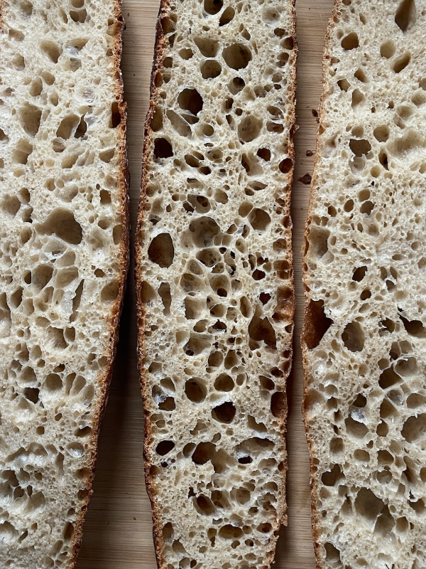 결국 1차 발효 중 가스 생성과 글루텐 형성이 부족했던게 오븐 스프링에 영향을 주었고 기공이 아주 답답하게 나왔다.