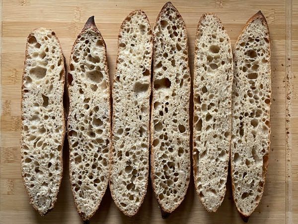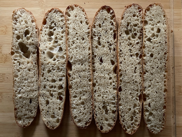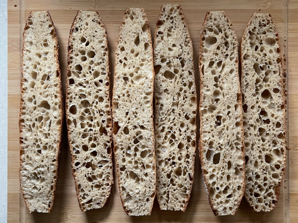 1차 발효 중에 이미 과발효가 된 게 원인인 것 같아서, 오토리즈 시간을 줄이고 나니 조금 나아졌다.