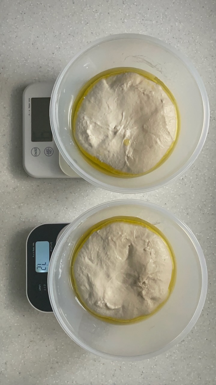 1차 발효 후에 눈대중으로 분할해도 되지만, 계산한 틀 용적량에 맞게 무게를 재어 나눠봤다.