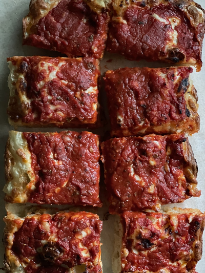 디트로이트 피자 스타일로 만들어 본 포카치아는 가장자리가 치즈 때문에 아주 바삭했고, 피자 소스도 정말 잘 어울렸다.